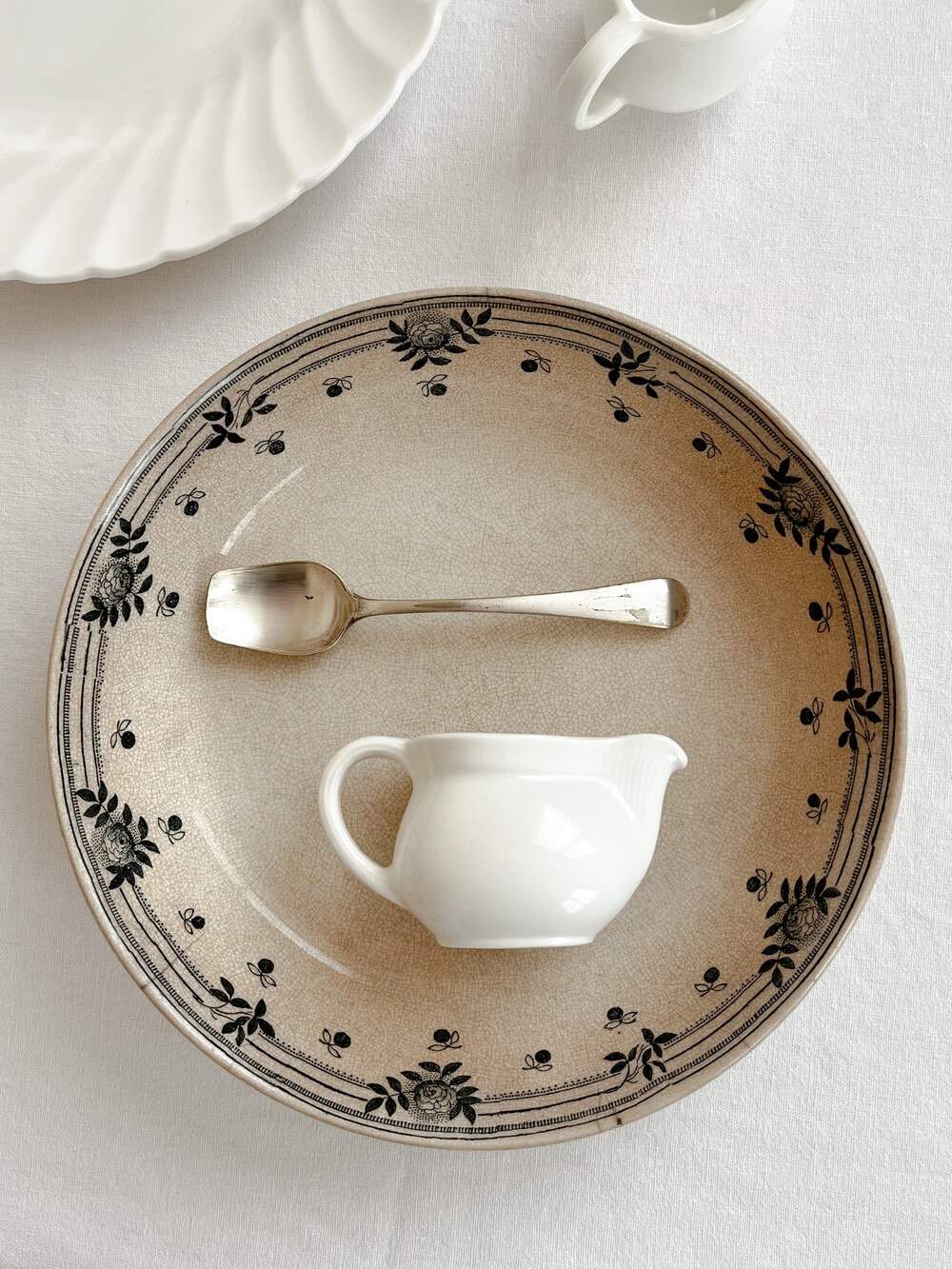 1800년대 중후반 즈음 제작 된 덜튼의 포셀린 보울입니다. 안정감있는 무게와 도톰하게 입혀진 유약층의 윤이 아름다우며, 소재고유의 깊이있는 화사함이 돋보일 수 있는 반듯한 동그라미 모양으로 빚어졌습니다. 보울의 가장자리에는, 미드나잇 블루로 표현 된 장미와 열매 무늬의 레이스 장식이 그려져 있습니다. 한 세기가 훌쩍 넘는 시간이 만들어내는 담담한 정서, 그릇을 이루는 물리적인 요소들의 완벽에 가까운 조화로움으로 부터 완성된 우아함이 보여집니다. 수집가들에게 환대를 받는 희소가치가 높은시리즈이며, 그 중에서도 보기 드문 장르인 보울입니다. 공간을 꾸며주는 오브제나 정돈을 위한 그릇으로 사용하기에 적당하며- 따사로운 마음으로 마주하는 티테이블을 위한 트레이로, 간결한 아침식탁을 위한 브레드플레이트로 사용하기에 잘 어울립니다.