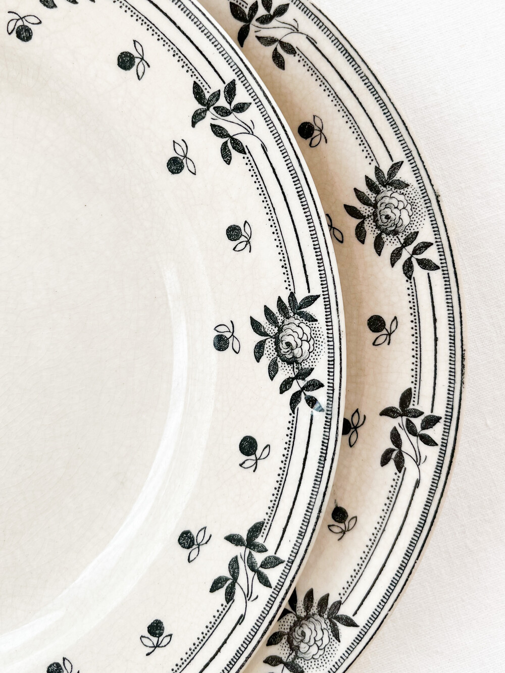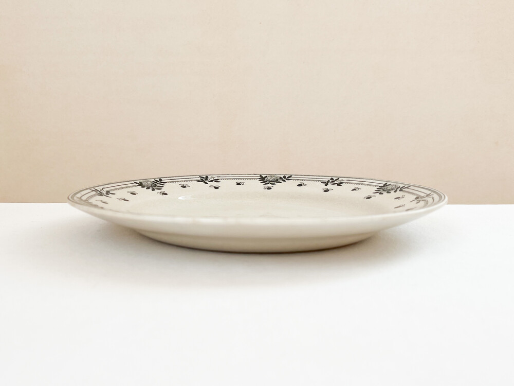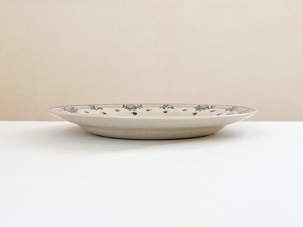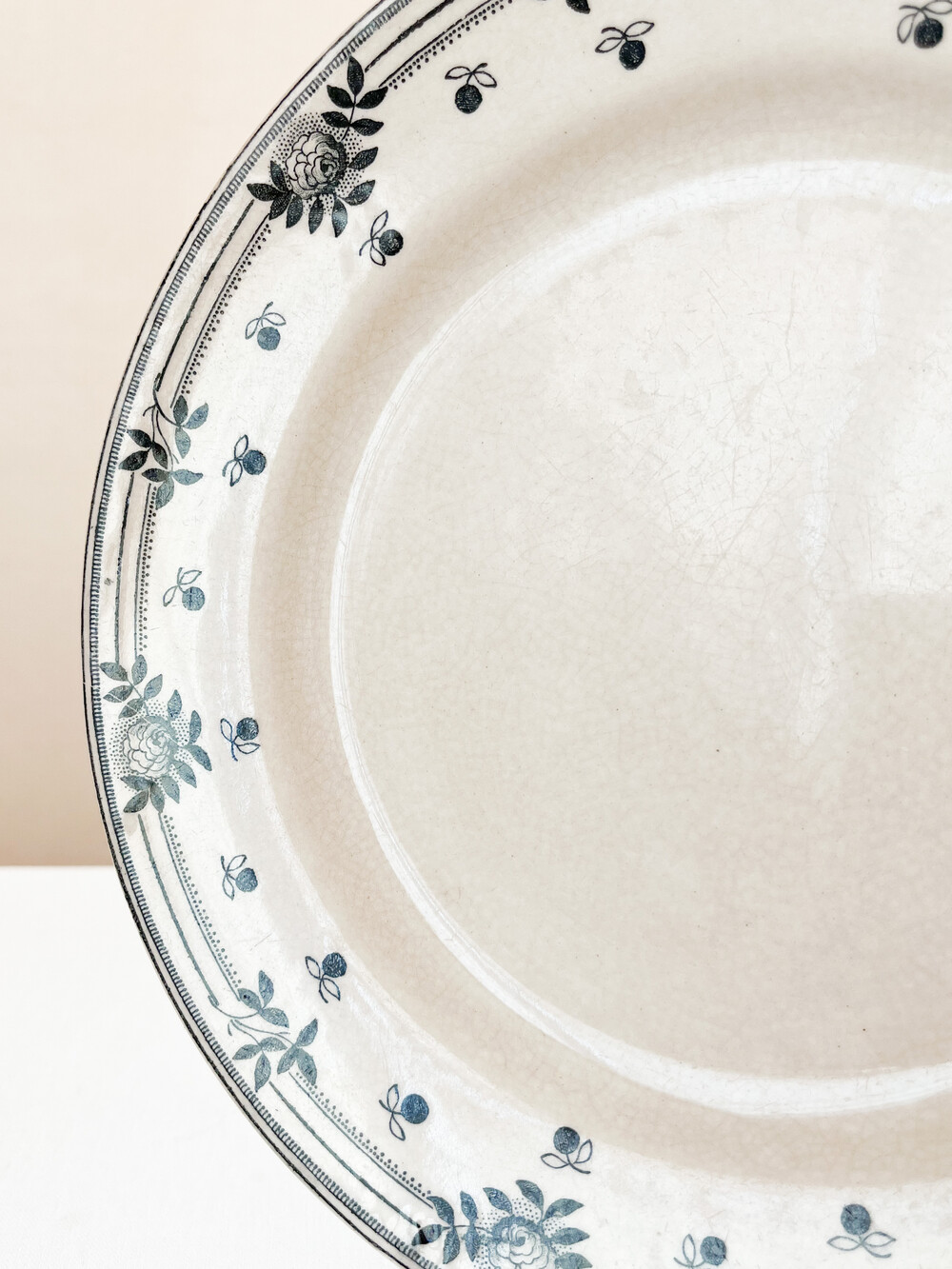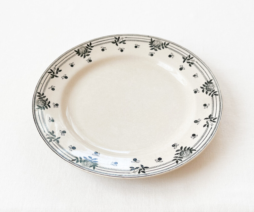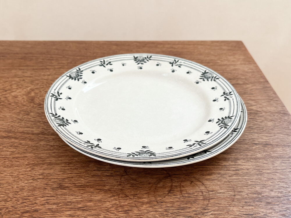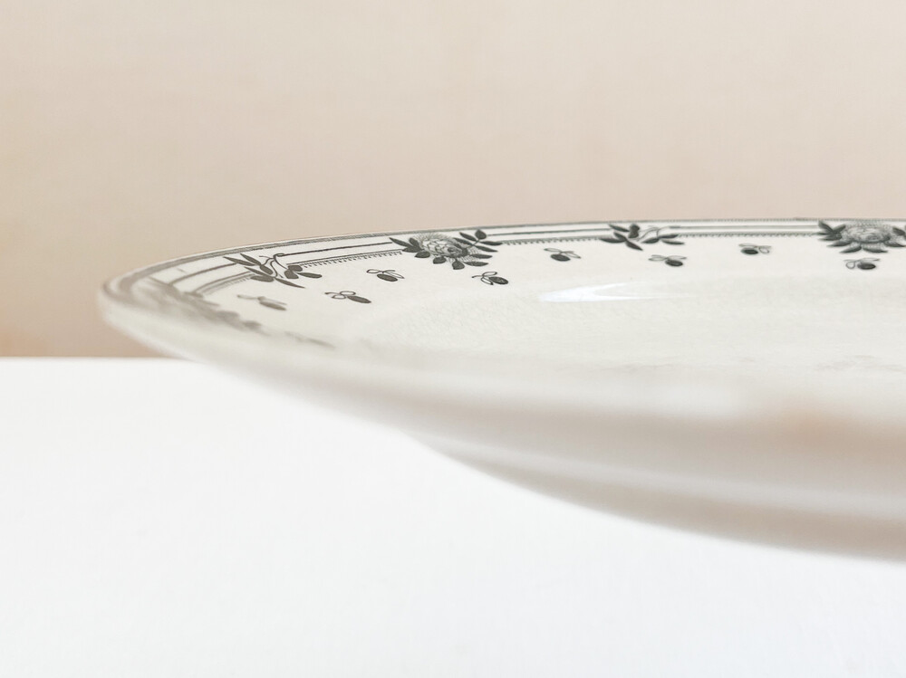 1800년대 중후반 즈음 제작 된 덜튼의 포셀린 접시들 입니다. 안정감있는 무게와 도톰하게 입혀진 유약층의 윤이 아름다우며, 소재고유의 깊이있는 화사함이 돋보일 수 있는 반듯한 동그라미 모양으로 빚어졌습니다. 접시의 가장자리에는, 미드나잇 블루로 표현 된 장미와 열매 무늬의 레이스 장식이 그려져 있습니다. 한 세기가 훌쩍 넘는 시간이 만들어내는 담담한 정서, 접시를 이루는 물리적인 요소들의 완벽에 가까운 조화로움으로 부터 완성된 우아함을 가지고 있습니다. 따사로운 마음으로 마주하는 티테이블을 위한 접시로, 간결한 아침식탁을 위한 그릇으로 사용하기에 잘 어울립니다.