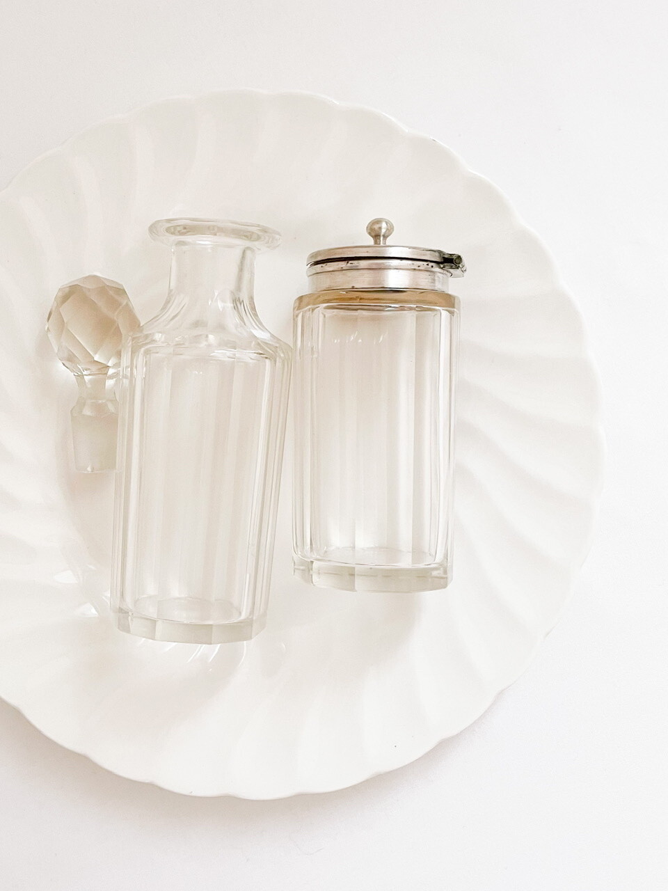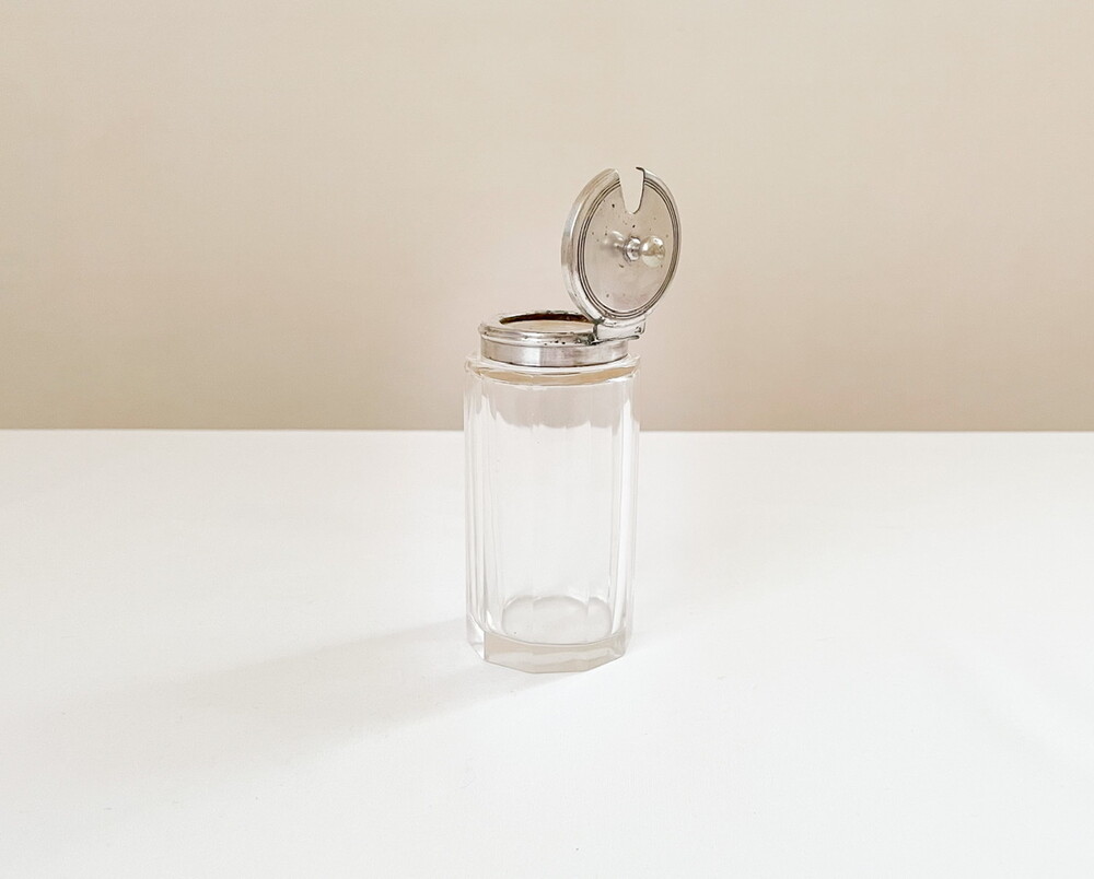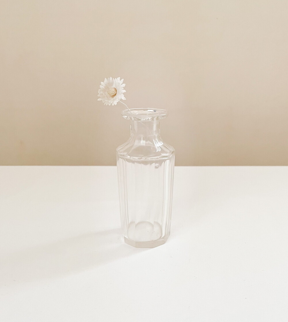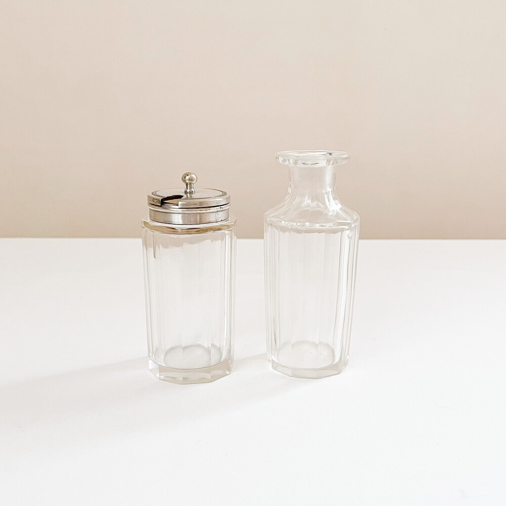 1900년대 초반 영국에서 제작 된 유리병입니다. 향이나 스파이스를 담아두는 용도로 만들어진 제품들로, 담담한 빛의 유리와 고운 윤을 띄는 실버플레이트를 소재로 합니다. 은이입혀진 뚜껑이 함께있는 스파이스보틀, 크리스탈컷 공모양의 마개가 있는 보틀, 그리고 마개가 없는 보틀 세 가지 제품이 준비되어있습니다. 100년이 넘는 시간이 만들어낸 우아하고 느긋한 분위기, 단조로운듯 정교하고 섬세한 꾸밈들이 보여집니다. 초나 향을 담아두거나 꽃을 꽂는 병으로, 작은 물건들을 담아두는 그릇으로 사용하기에 잘 어울립니다.