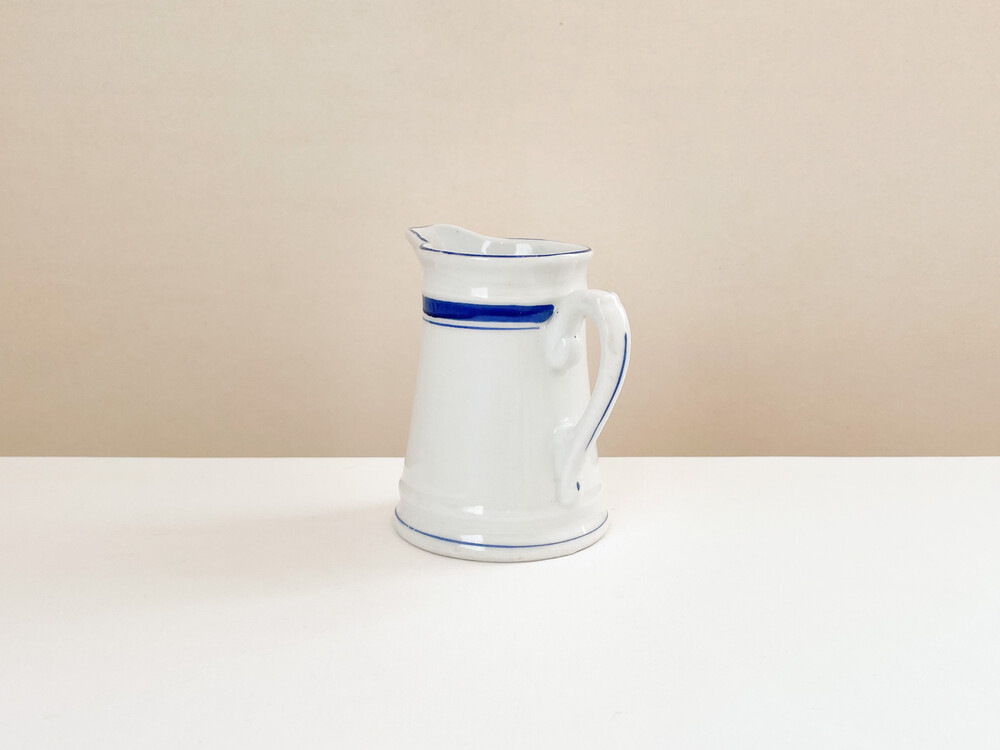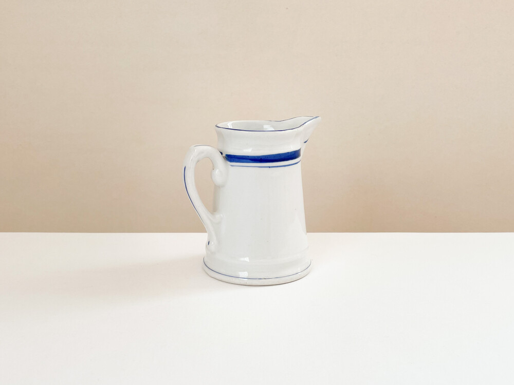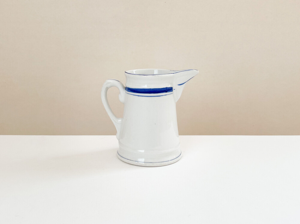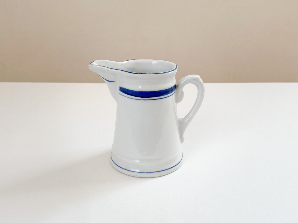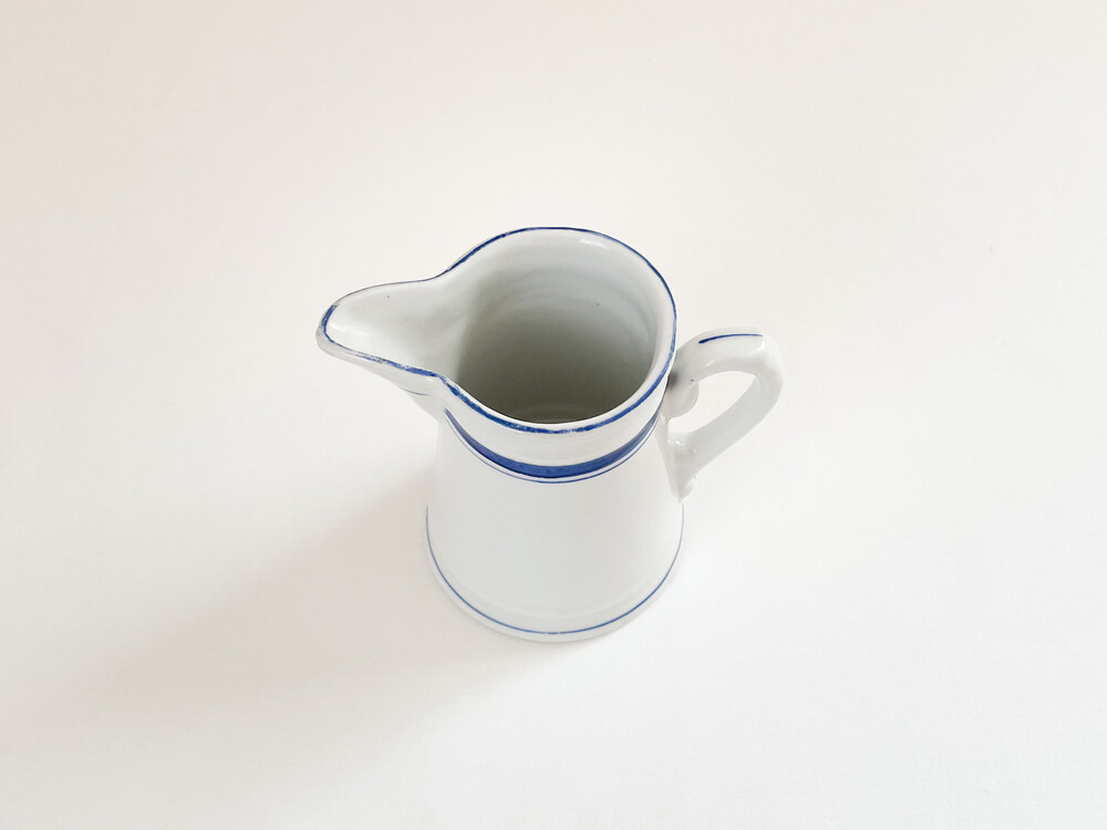 1900년대 초반에 만들어진 밀크저그입니다. 묵직하고 단단하며, 맑은 감촉을 가진 고전적인 프렌치포셀린을 소재로하며, 자연스런 곡선들이 전체에 보여집니다. 부드러운 리듬이 전해지는 스파우트와 아래를 향해 완만한 선으로 넓어지는 바디, 세련된 비율의 둥근 손잡이로 모양을 이루고- 회화적인 터치의 코발트 블루 줄무늬가 둥근 면들을 따라 장식되어있습니다. 소재와 모양의 우아함, 단정하지만 자유로운 흐름의 장식이 아름답습니다. 고요하고 차분한 정물화를 바라보는 듯한 감정을 전해주는 저그입니다. 본래의 용도에 따라 우유나 크림을 담는 그릇으로 사용하기에 알맞으며, 공간을 장식하는 오브제 또는 커다란 꽃을 몇송이 담아두는 화병으로 사용하기에 잘 어울립니다.
