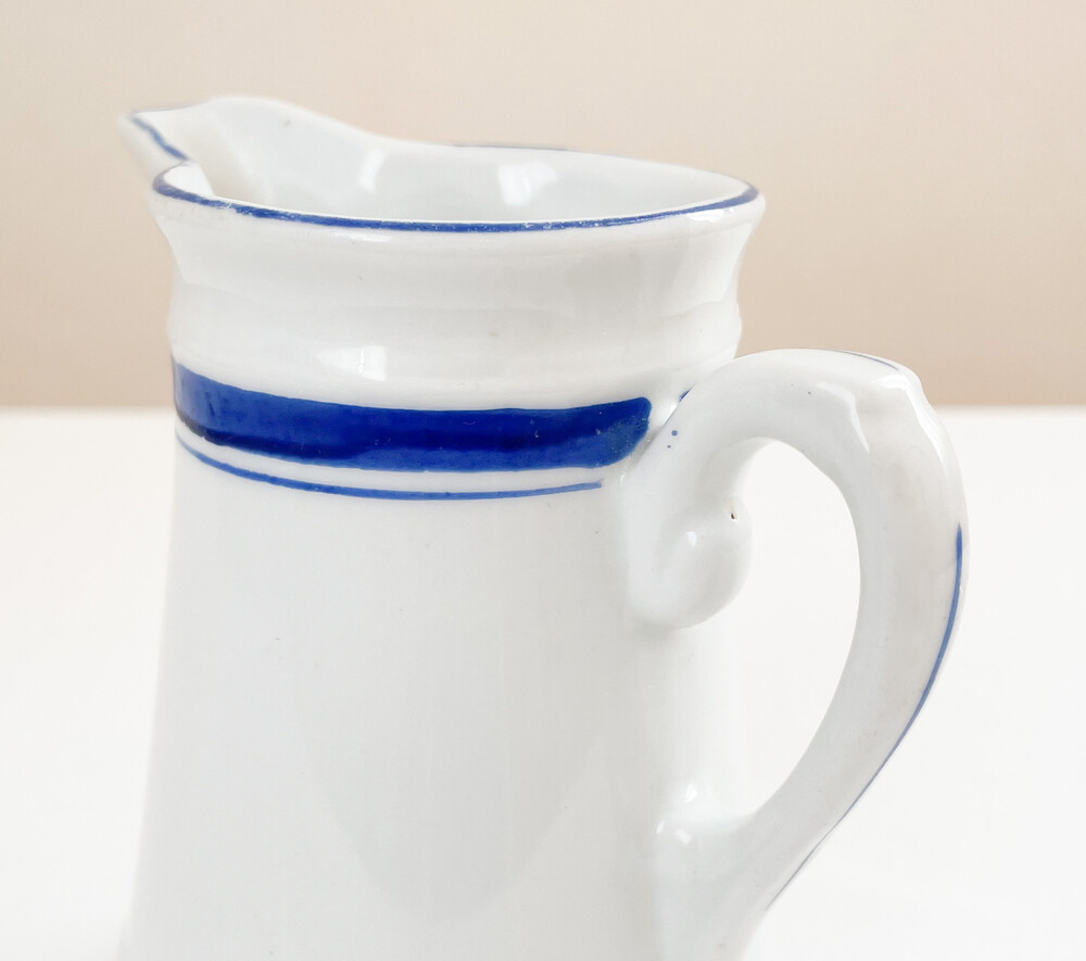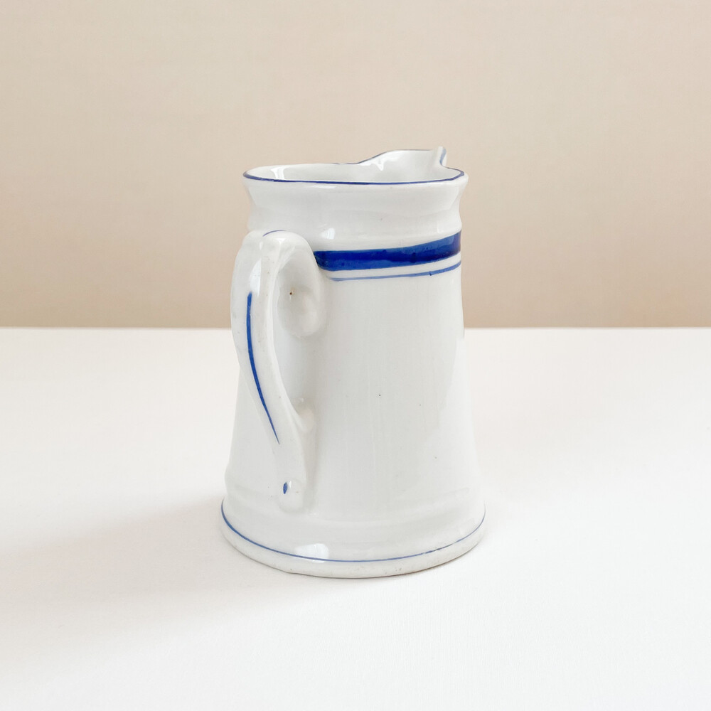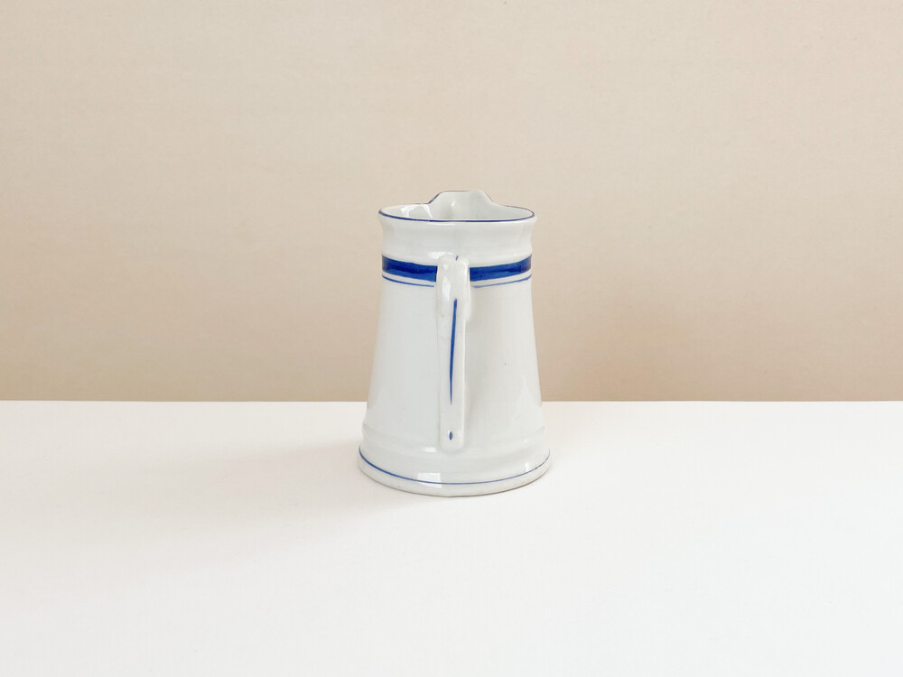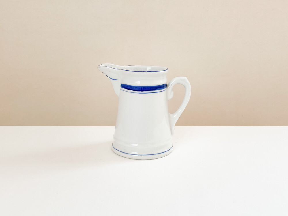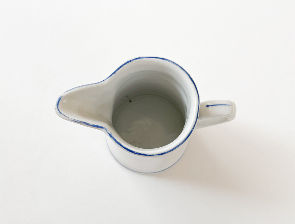 1900년대 초반에 만들어진 밀크저그입니다. 묵직하고 단단하며, 맑은 감촉을 가진 고전적인 프렌치포셀린을 소재로하며, 자연스런 곡선들이 전체에 보여집니다. 부드러운 리듬이 전해지는 스파우트와 아래를 향해 완만한 선으로 넓어지는 바디, 세련된 비율의 둥근 손잡이로 모양을 이루고- 회화적인 터치의 코발트 블루 줄무늬가 둥근 면들을 따라 장식되어있습니다. 소재와 모양의 우아함, 단정하지만 자유로운 흐름의 장식이 아름답습니다. 고요하고 차분한 정물화를 바라보는 듯한 감정을 전해주는 저그입니다. 본래의 용도에 따라 우유나 크림을 담는 그릇으로 사용하기에 알맞으며, 공간을 장식하는 오브제 또는 커다란 꽃을 몇송이 담아두는 화병으로 사용하기에 잘 어울립니다.