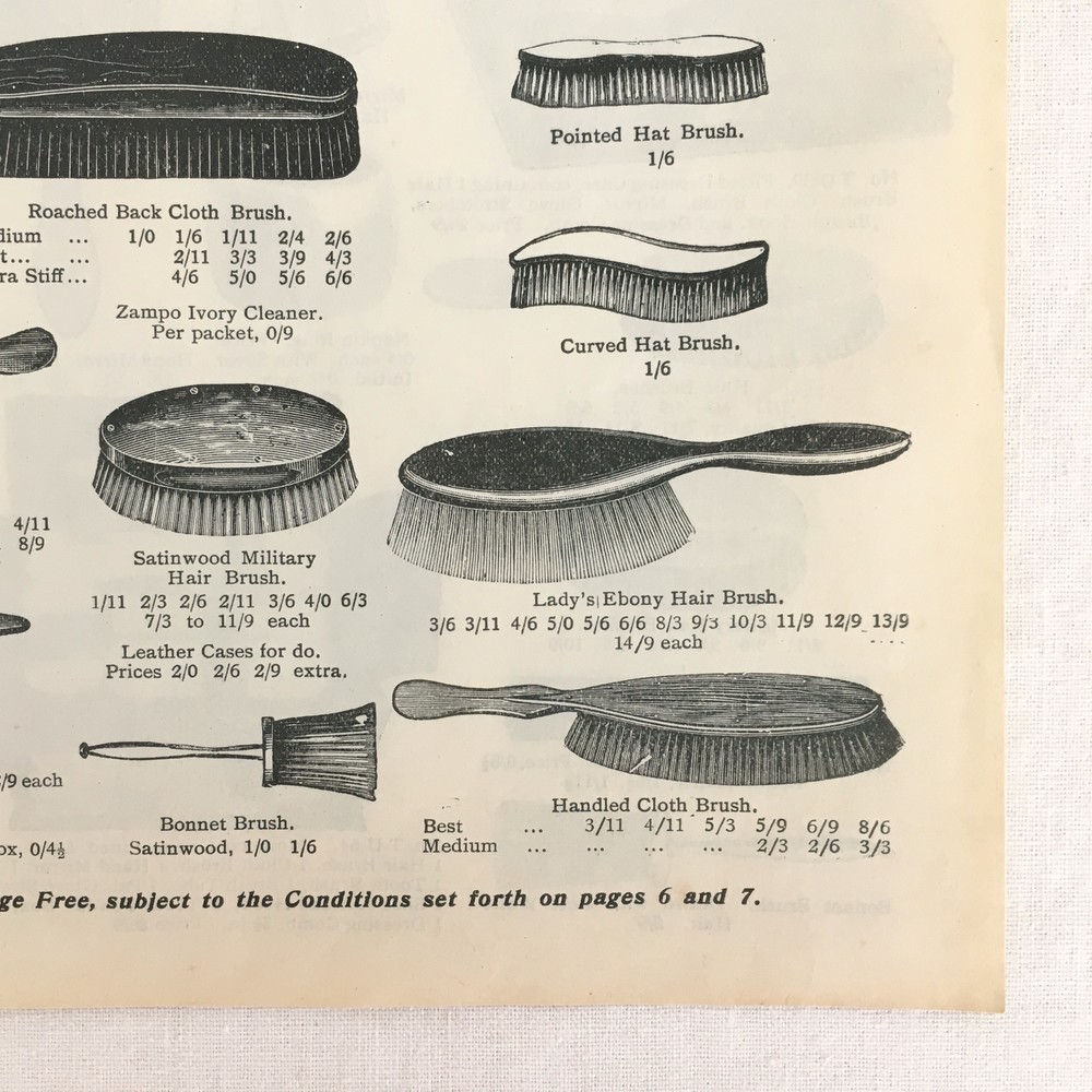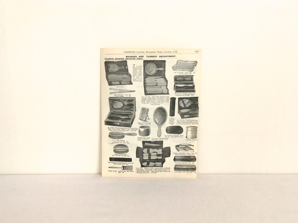 1824년 찰리해롯의 리테일 숍으로 시작하여, 1849년부터 런던의 켄싱턴 지역에서 지금의 형태로 백화점의 문을연 해롯의 빈티지 카탈로그입니다. 부엌용품과 청소도구 같은 생필품 부터 장신구와 의류, 가구와 휴가를 위한 오두막에서 보트에 이르기까지 아름답고 호화로우며 좋은 품질을 가진 제품들을 갖춰놓은 해롯은 소비와 상업의 붐을 가져오며, 런던과 영국을 비롯해 유럽전역에 백화점 형태를 가진 많은 가게의 문을 열게하는 역할을 하기도합니다. 소개해드리는 카탈로그는 1913년 해롯백화점에서 발행된, 오래된 광고물을 아카이빙하는 수집가의 개러지 세일에서 구하게된- 희소성있는 오리지널 프린트입니다. 여러가지 브러쉬와 바니티박스를 광고하는 페이지로, 금속활판을 이용해 얇고 촘촘한결의 종이에 인쇄가 되어있습니다. 가느다란 선으로 표현된 물건의 묘사와 각 제품의 아래에 표시된 브랜드와 용도, 크기와 가격이 자세하게 표기가 되어있습니다. 양면에 같은 주제의 다른 내용이 프린트되어있어 프레임에 넣지 않은채 소개해드립니다. 100년이 넘은 긴시간을 간직한 프린트이지만, 가장자리에 보여지는 약간의 변색이외에 거의 새것과 같은 깨끗한 상태를 가지고 있습니다. 취향과 공간의 분위기에 따라 한 면을 선택하여 장식할 수 있으며, 아름다운 장식품의 의미에 더불어- 물건에 담긴, 지속될 수 있는 이야기와 사용에 관한 자세한 내용을 담고있는 귀중한 자료의 역할도 가지고 있습니다.