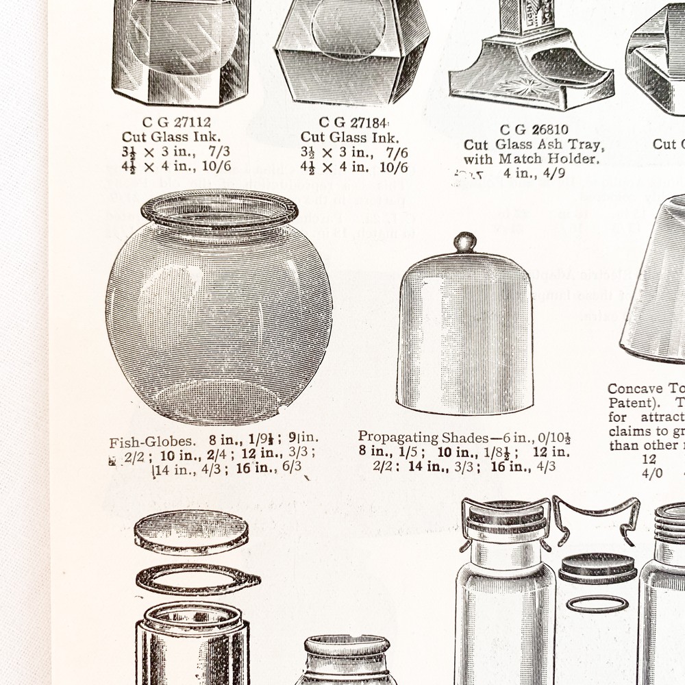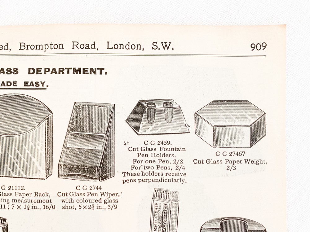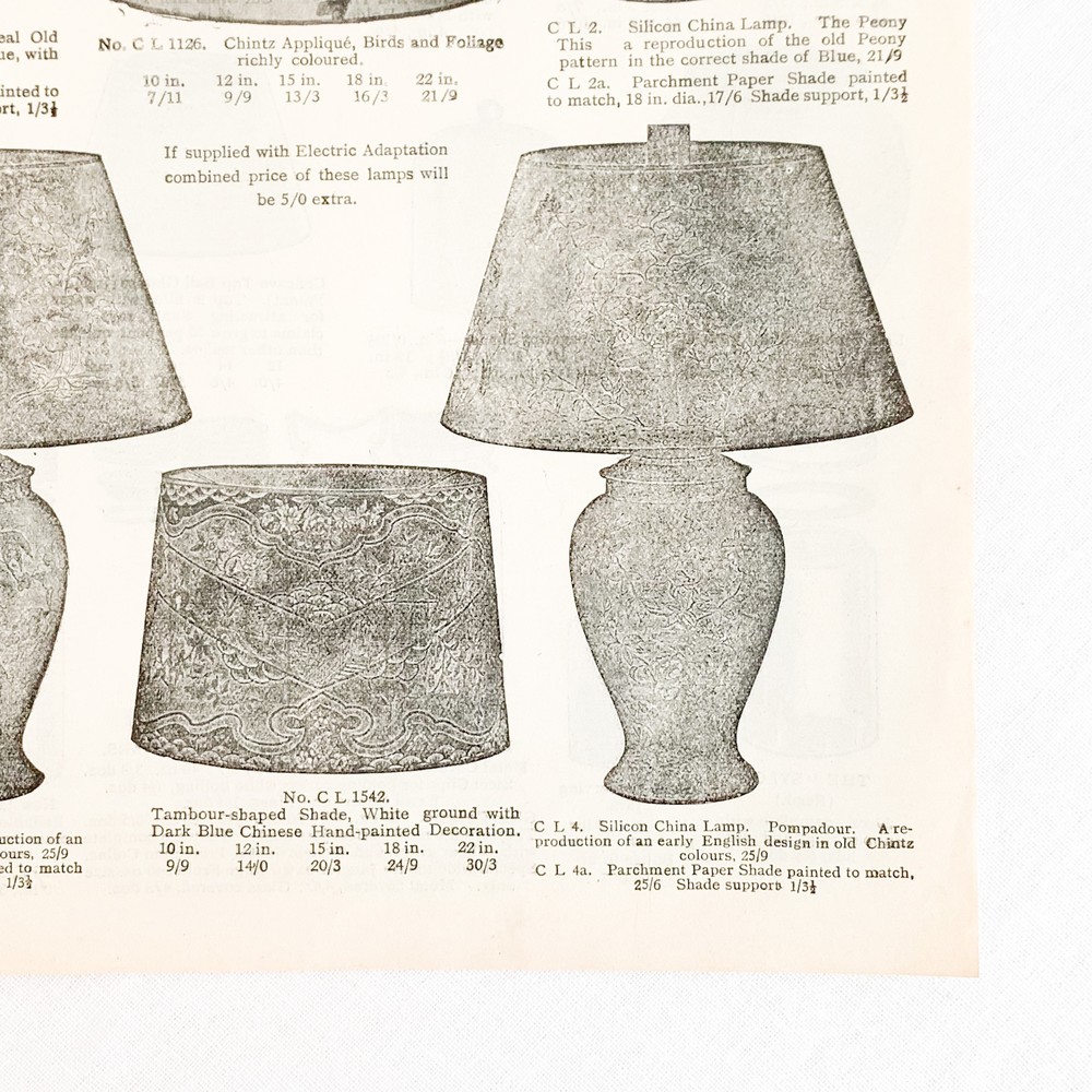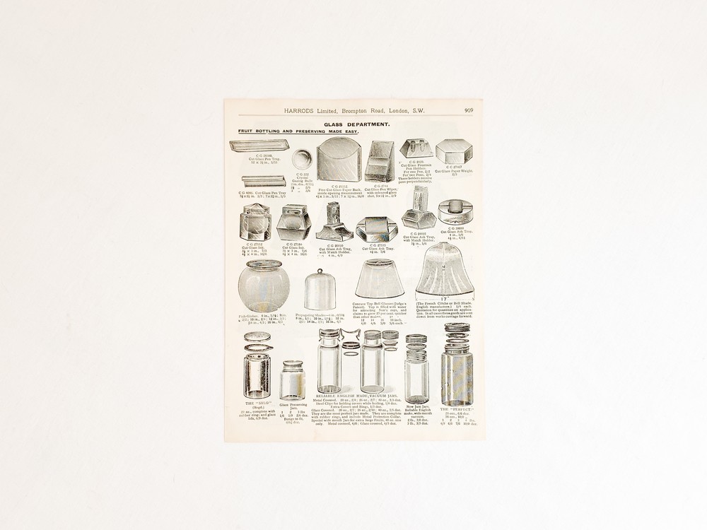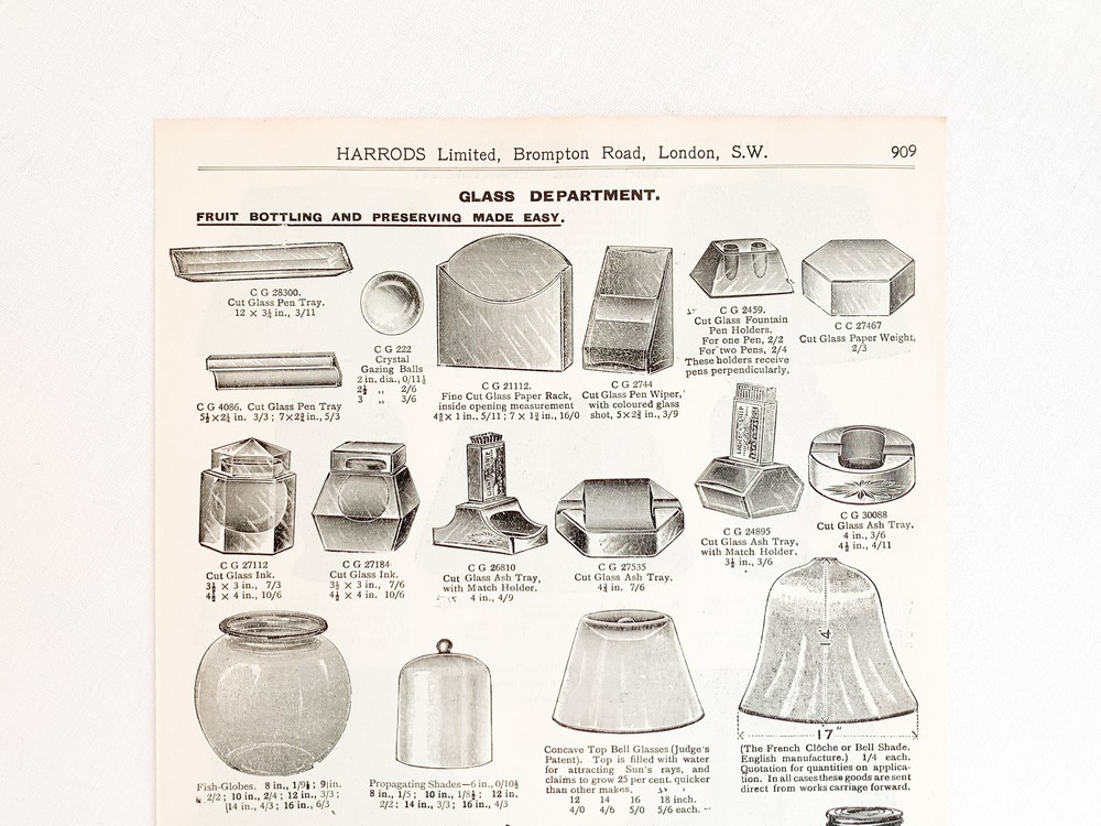 1824년 찰리해롯의 리테일 숍으로 시작하여, 1849년부터 런던의 켄싱턴 지역에서 지금의 형태로 백화점의 문을연 해롯의 빈티지 카탈로그입니다. 부엌용품과 청소도구 같은 생필품 부터 장신구와 의류, 가구와 휴가를 위한 오두막에서 보트에 이르기까지 아름답고 호화로우며 좋은 품질을 가진 제품들을 갖춰놓은 해롯은 소비와 상업의 붐을 가져오며, 런던과 영국을 비롯해 유럽전역에 백화점 형태를 가진 많은 가게의 문을 열게하는 역할을 하기도합니다. 소개해드리는 카탈로그는 1913년 해롯백화점에서 발행된- 오래된 광고물을 아카이빙하는 수집가의 개러지 세일에서 발견한 희소성있는 오리지널 프린트입니다. 앞면에는 크리스탈과 유리로 만들어진 편지함이나 문진 등의 책상위의 물건들이, 뒷면에는 자수와 페인팅으로 꾸며진 테블램프의 모습의 실루엣으로 담겨있습니다. 금속활판을 이용해 얇고 촘촘한- 찰랑이는듯한 결의 종이에 인쇄가 되어있으며, 가느다란 선으로 표현된 물건의 묘사와 각 제품의 아래에 표시된 브랜드와 용도 및 크기와 가격이 자세하게 표기되어 있습니다. 양면에 같은 주제의 다른 내용이 프린트되어있어 프레임에 넣지 않은채 소개해드립니다. 100년이 넘은 긴시간을 간직한 프린트이지만, 가장자리에 보여지는 약간의 변색이외에 거의 새것과 같은 깨끗한 상태를 가지고 있습니다. 취향과 공간의 분위기에 따라 한 면을 선택하여 장식할 수 있으며, 아름다운 장식품의 의미에 더불어- 물건에 담긴, 지속될 수 있는 이야기와 사용에 관한 자세한 내용을 담고있는 귀중한 자료의 역할도 가지고 있습니다.