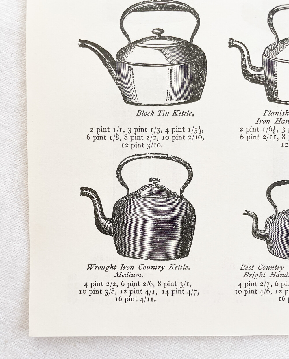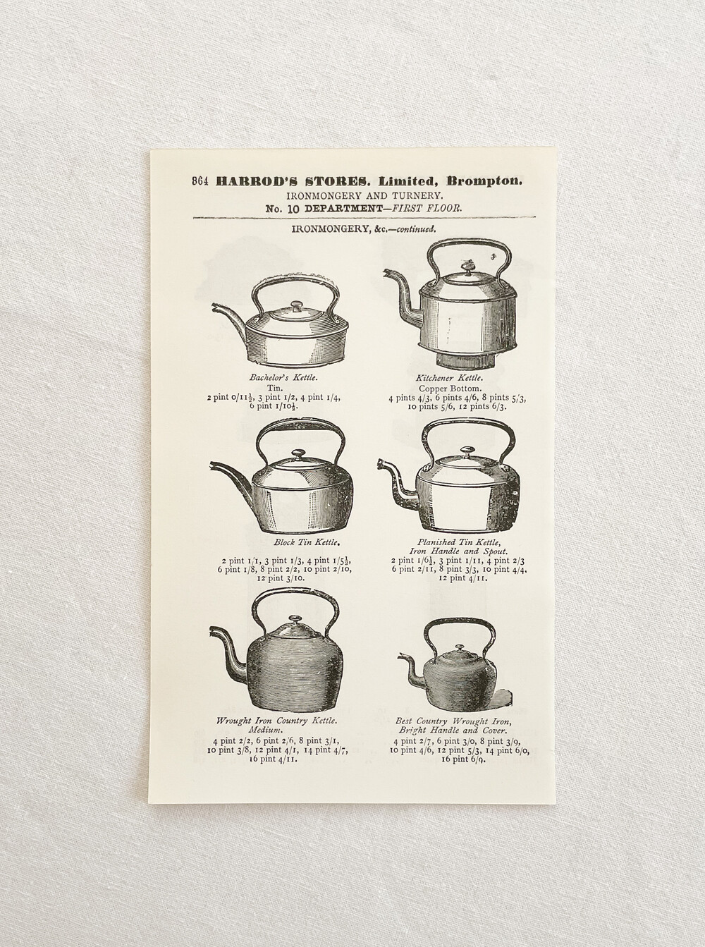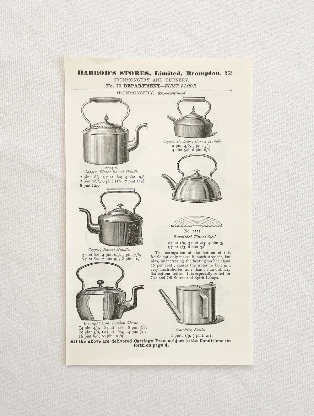 1824년 찰리해롯의 리테일 숍으로 시작하여, 1849년부터 런던의 켄싱턴 지역에서 지금의 형태로 백화점의 문을연 해롯의 빈티지 카탈로그입니다. 부엌용품과 청소도구 같은 생필품 부터 장신구와 의류, 가구와 휴가를 위한 오두막에서 보트에 이르기까지 아름답고 호화로우며 좋은 품질을 가진 제품들을 갖춰놓은 해롯은 소비와 상업의 붐을 가져오며, 런던과 영국을 비롯해 유럽전역에 백화점 형태를 가진 많은 가게의 문을 열게하는 역할을 하기도합니다. 소개해드리는 카탈로그는 1920년대 해롯백화점에서 발행된- 오래된 광고물을 아카이빙하는 수집가의 개러지 세일에서 발견한 희소성있는 오리지널 프린트입니다. 구리과 무쇠로 만들어진 주전자를 소개하는 페이지로, 금속활판을 이용해 얇고 단단하고 부드러운 결의 종이에 인쇄가 되어있습니다. 가느다란 선으로 표현된 물건의 묘사와 디테일을 알려주는 글자들이 가지런히 적혀있으며, 당시에 유행했던- 동양의 차문화의 영향을 받은 티팟과 고전을 바탕으로 하지만 보온등의 기능이 추가 된 새로운 모습의 주전자들을 살펴 볼 수 있습니다. 100년이 넘은 긴시간을 간직한 프린트이지만, 가장자리에 보여지는 약간의 변색이외에 거의 새것과 같은 깨끗한 상태를 가지고 있습니다. 취향과 공간의 분위기에 따라 한 면을 선택하여 장식할 수 있으며, 아름다운 장식품의 의미에 더불어- 물건에 담긴, 지속될 수 있는 이야기와 사용에 관한 자세한 내용을 담고있는 귀중한 자료의 역할도 가지고 있습니다.