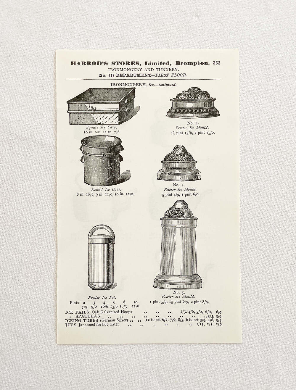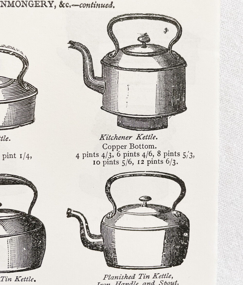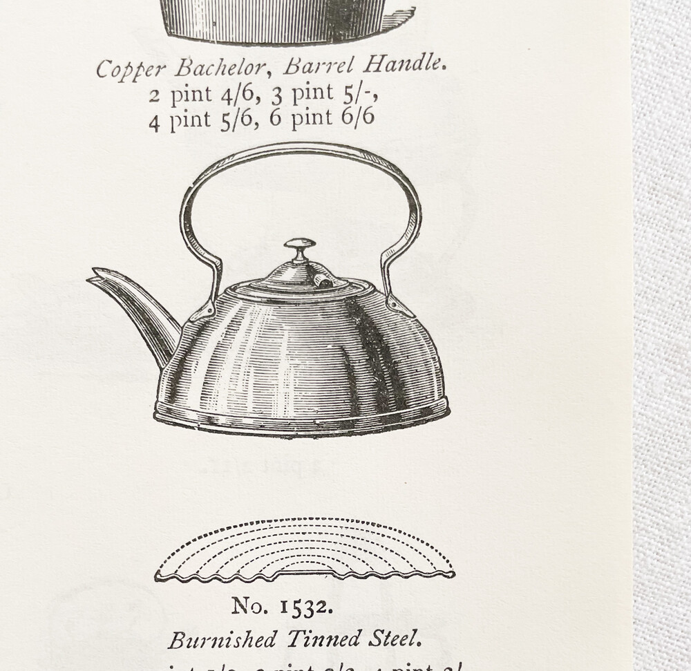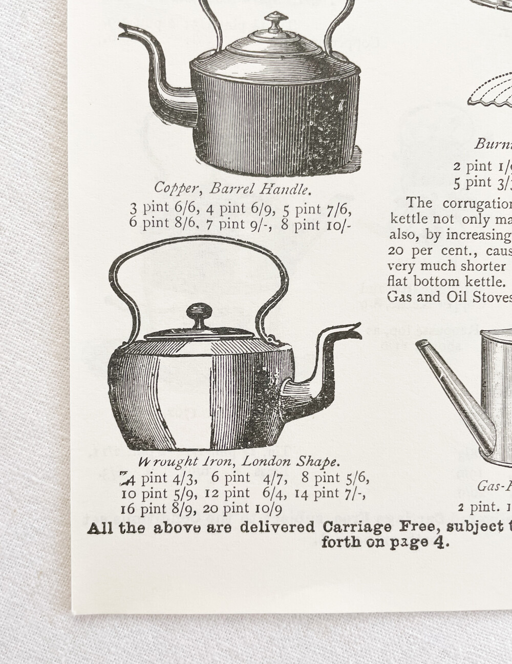 1824년 찰리해롯의 리테일 숍으로 시작하여, 1849년부터 런던의 켄싱턴 지역에서 지금의 형태로 백화점의 문을연 해롯의 빈티지 카탈로그입니다. 부엌용품과 청소도구 같은 생필품 부터 장신구와 의류, 가구와 휴가를 위한 오두막에서 보트에 이르기까지 아름답고 호화로우며 좋은 품질을 가진 제품들을 갖춰놓은 해롯은 소비와 상업의 붐을 가져오며, 런던과 영국을 비롯해 유럽전역에 백화점 형태를 가진 많은 가게의 문을 열게하는 역할을 하기도합니다. 소개해드리는 카탈로그는 1920년대 해롯백화점에서 발행된- 오래된 광고물을 아카이빙하는 수집가의 개러지 세일에서 발견한 희소성있는 오리지널 프린트입니다. 구리과 무쇠로 만들어진 주전자를 소개하는 페이지로, 금속활판을 이용해 얇고 단단하고 부드러운 결의 종이에 인쇄가 되어있습니다. 가느다란 선으로 표현된 물건의 묘사와 디테일을 알려주는 글자들이 가지런히 적혀있으며, 당시에 유행했던- 동양의 차문화의 영향을 받은 티팟과 고전을 바탕으로 하지만 보온등의 기능이 추가 된 새로운 모습의 주전자들을 살펴 볼 수 있습니다. 100년이 넘은 긴시간을 간직한 프린트이지만, 가장자리에 보여지는 약간의 변색이외에 거의 새것과 같은 깨끗한 상태를 가지고 있습니다. 취향과 공간의 분위기에 따라 한 면을 선택하여 장식할 수 있으며, 아름다운 장식품의 의미에 더불어- 물건에 담긴, 지속될 수 있는 이야기와 사용에 관한 자세한 내용을 담고있는 귀중한 자료의 역할도 가지고 있습니다.