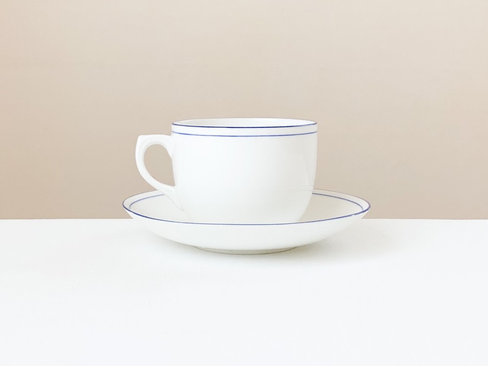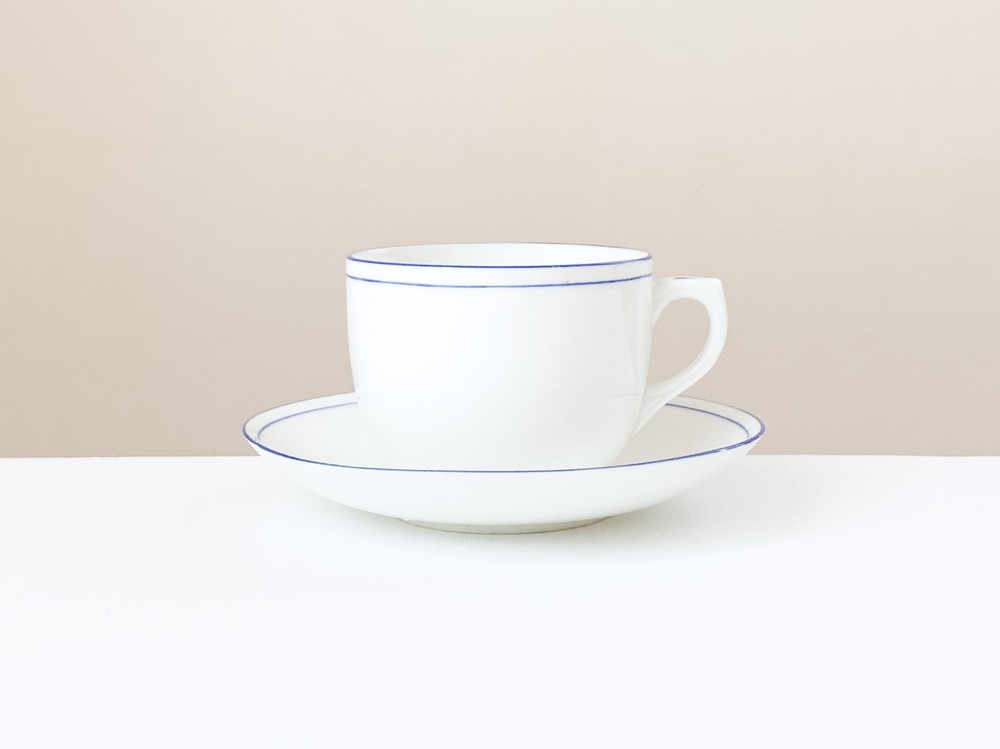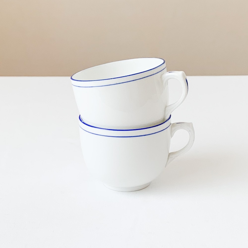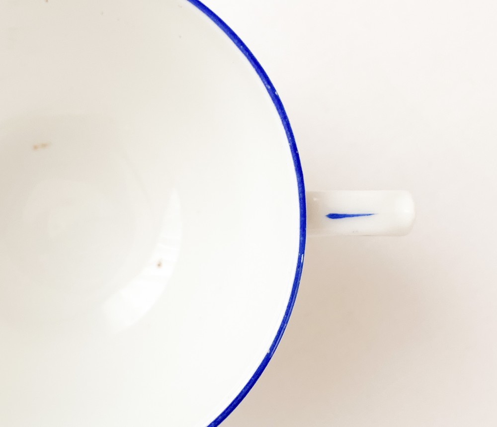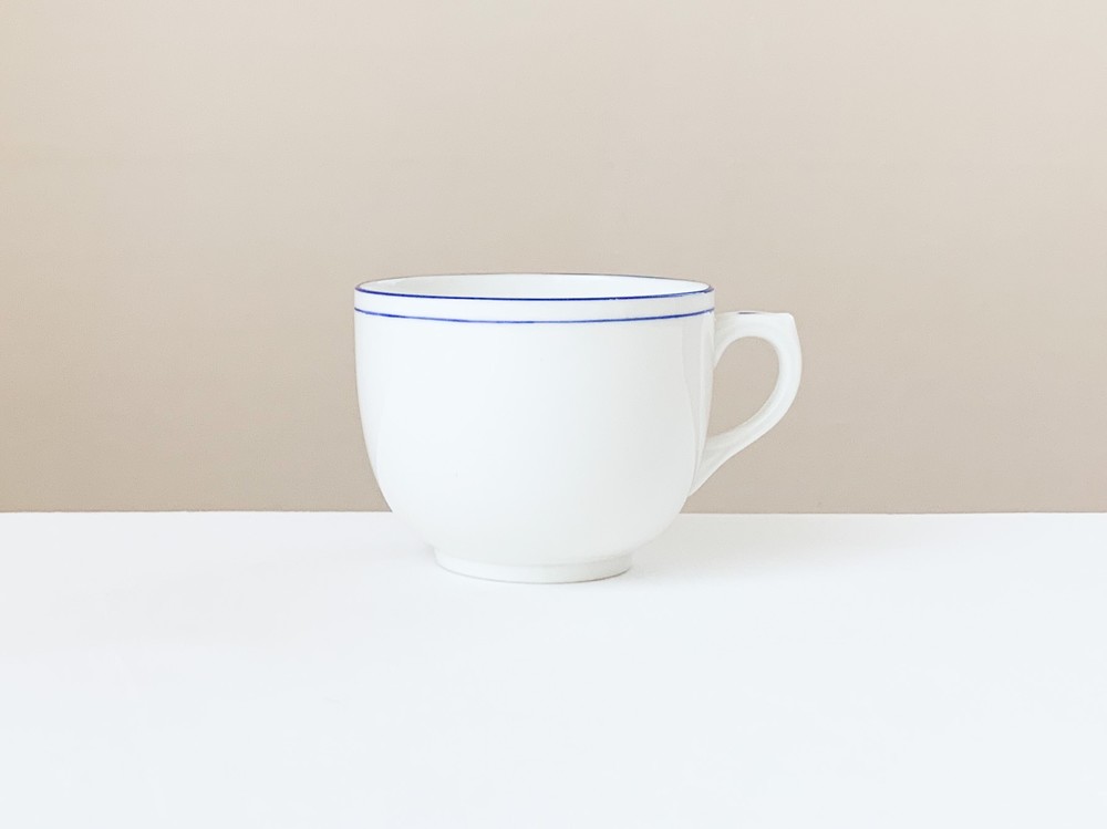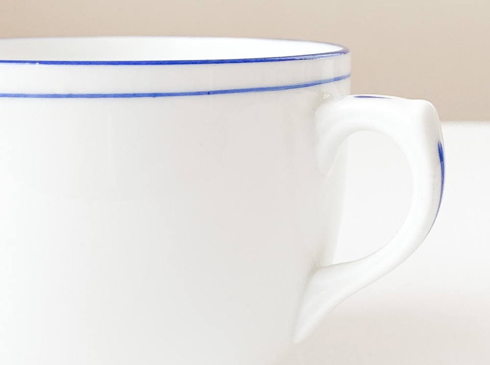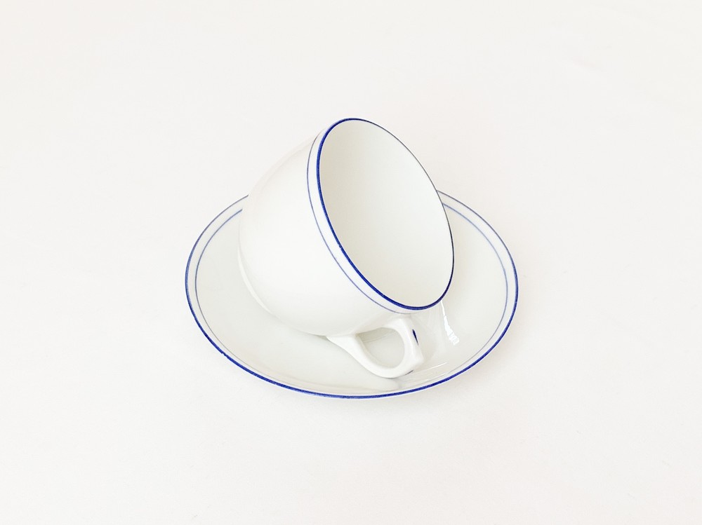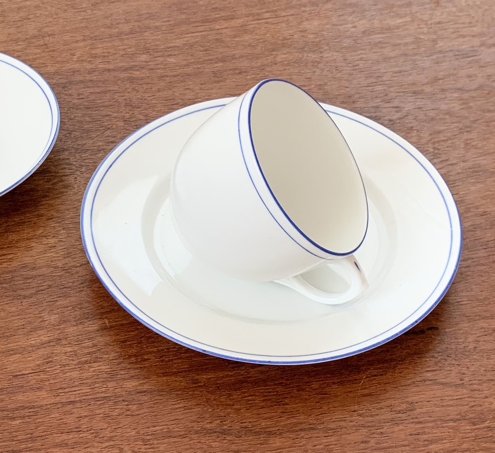 폴리의 빈티지 티트리오 입니다. 폴리는 1850년 스토크온트렌트에서 시작 된 브랜드입니다. 본차이나를 다루는 분야에서 언제나 선두에 있던 웨지우드와 웨지우드의 영향아래 만들어진 켄트와 로빈슨 앤 손스의 뒤를 따라 만들어진 브랜드로- 정교한 소재의 사용과 고전적인 실루엣을 큰 모티프로 두며, 대담하고 화려한 색을 사용한 본차이나를 주로 제작했습니다. 이국적이고 목가적인 분위기가 담겨있지만 고전의 형식을 잘 갖춘 특별한 분위기의 테이블웨어들은 영국과 유럽의 귀족들로 부터 큰 호응을 얻었습니다. 소개해드리는 제품들은 1930년대에 만들어졌습니다. 브랜드가 시작 된 배경을 잘 보여주는 소재인- 밝은 아이보리의 본차이나로 제작 되었으며, 단정하고 풍성한 곡선으로 모양을 갖추고 있습니다. 아름다운 윤을 띄는 오목한 찻잔, 넓직하고 낮게 펼쳐져 더욱 깊은 화사함이 전해지는 케이크 플레이트가 준비되어 있습니다. 각각의 가장자리에는 명도에 약간의 차이를 둔 코발트 블루의 줄무늬가 얌전한 터치로 그려졌습니다. 여유있는 오후 시간의 하이티high tea 테이블을 위한 그릇들로, 잔잔한 아침식사 시간의 간결한 그릇으로 사용하기에 잘 어울립니다.