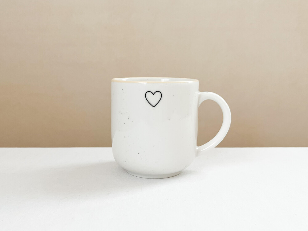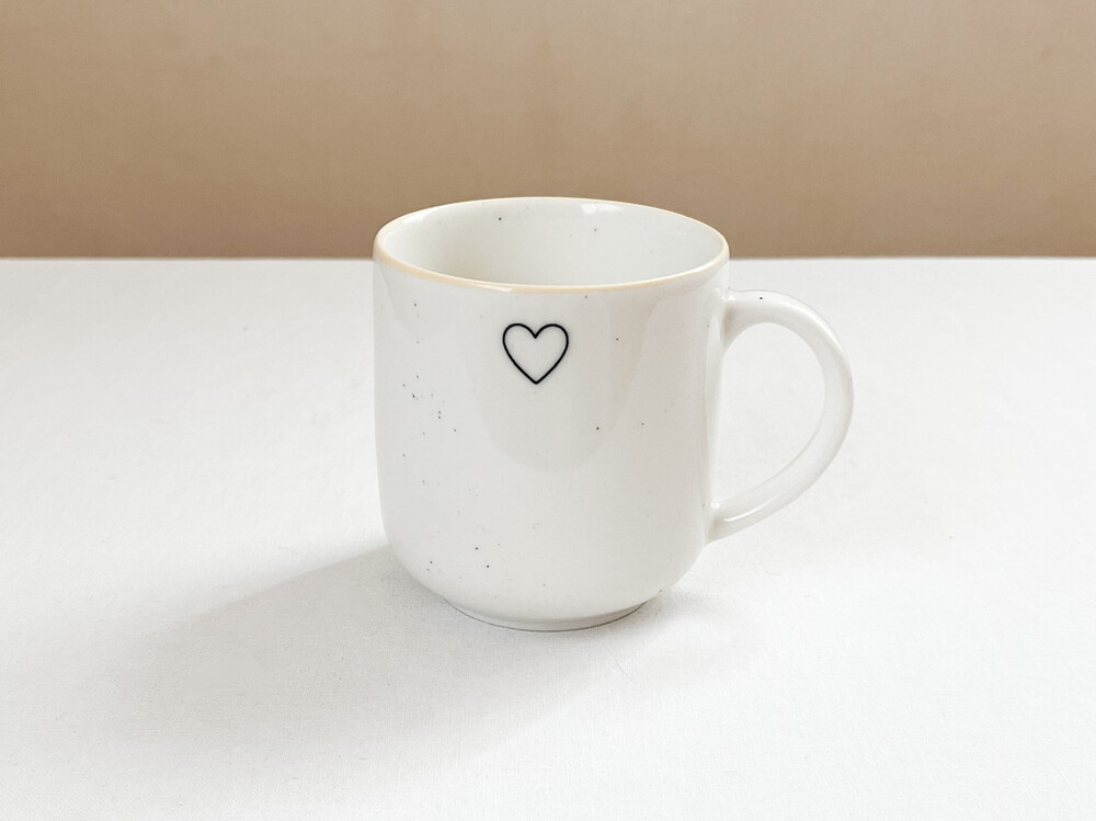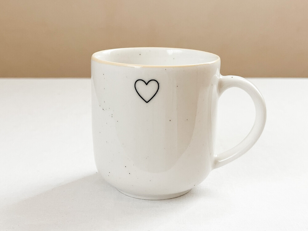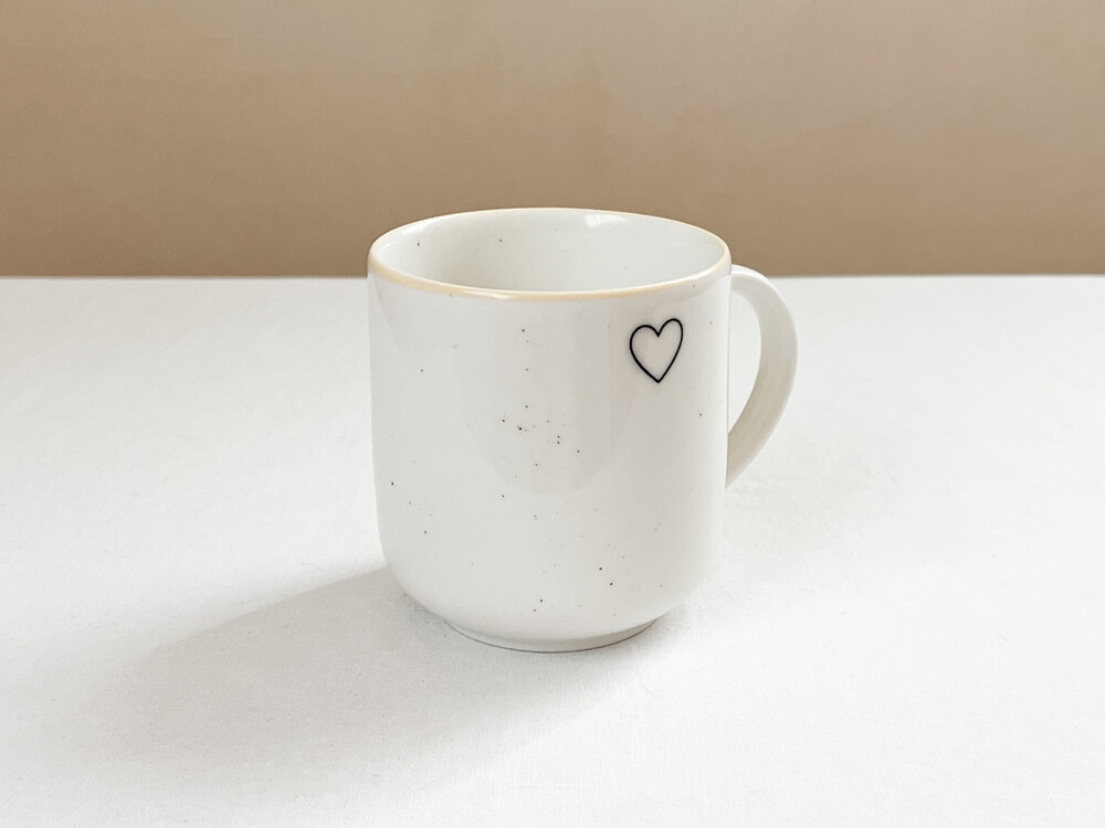 1930년대에 만들어진 하트스탬프를 장식 모티브로 제작된 찻잔입니다. 여러용도로 편하게 사용하기에 알맞은 스톤웨어를 소재로 만들어진 찻잔은, 몰드를 사용해 모양을 만들어내고, 여러번에 걸쳐 결을 다듬어낸 후 무늬와 유약을 입혀 오랜시간 동안 구워내는 과정을 동해 완성이 됩니다. 제품이 만들어지는데에는, 프랑스 Anneyron지역의 순도높은(제작의 편리성을 위해 섞이게 되는 흙과 물이외의 물질이 섞이지 않음을 뜻합니다) 흙과 유약 그리고 화학제품이 첨가되지 않은 안료가 사용됩니다. 둥글고 단정한 선으로 빚어진 컵의 한켠에는 바살트를 재료로한 따스한 검정의 하트모양과 잔잔한 스페클 무늬가 장식되어 있으며- 가장자리에는 전체의 둥근 선들과 나란한 리듬을 만들어내는 고운 줄무늬가 그려져 있습니다. 오랜시간이 담긴 스탬프 특유의 자연스런결, 담담한 실루엣과 색들로부터 여운이 전해집니다.