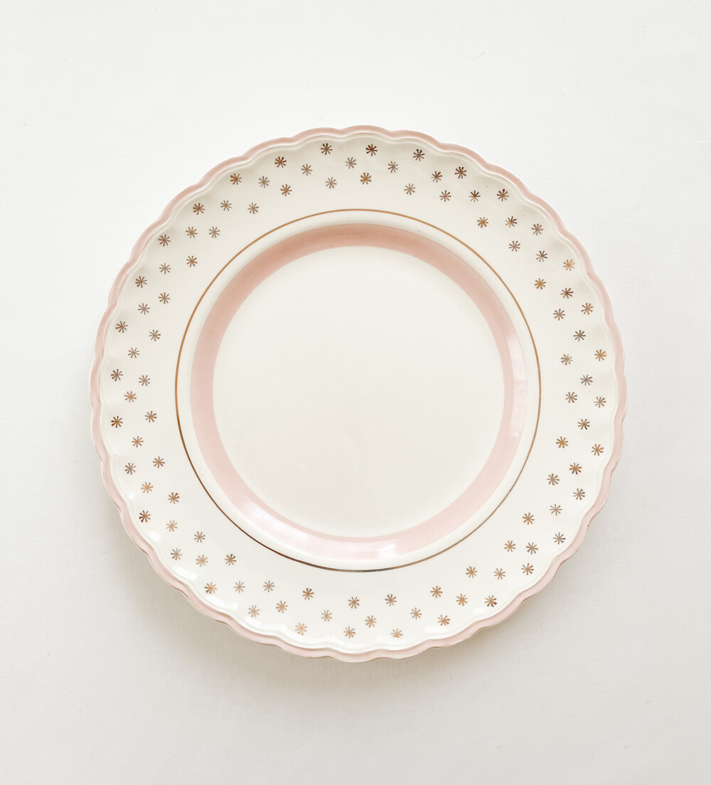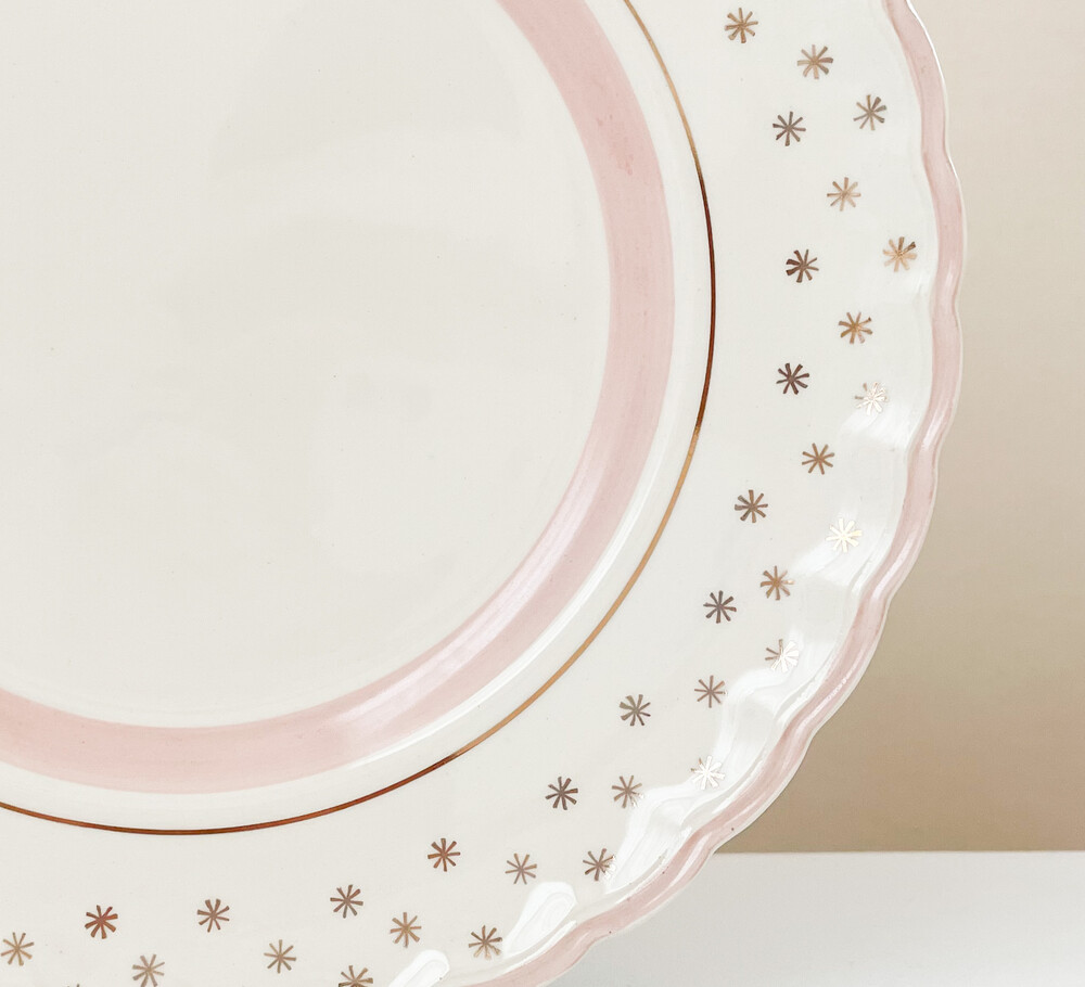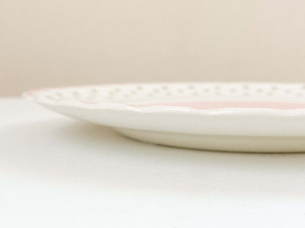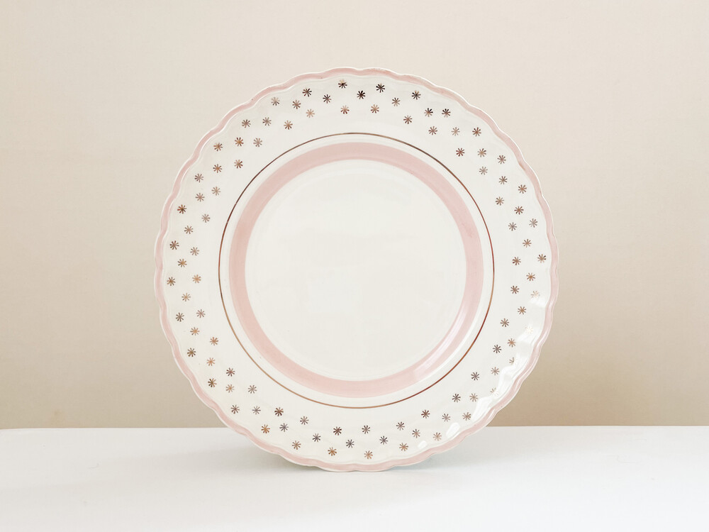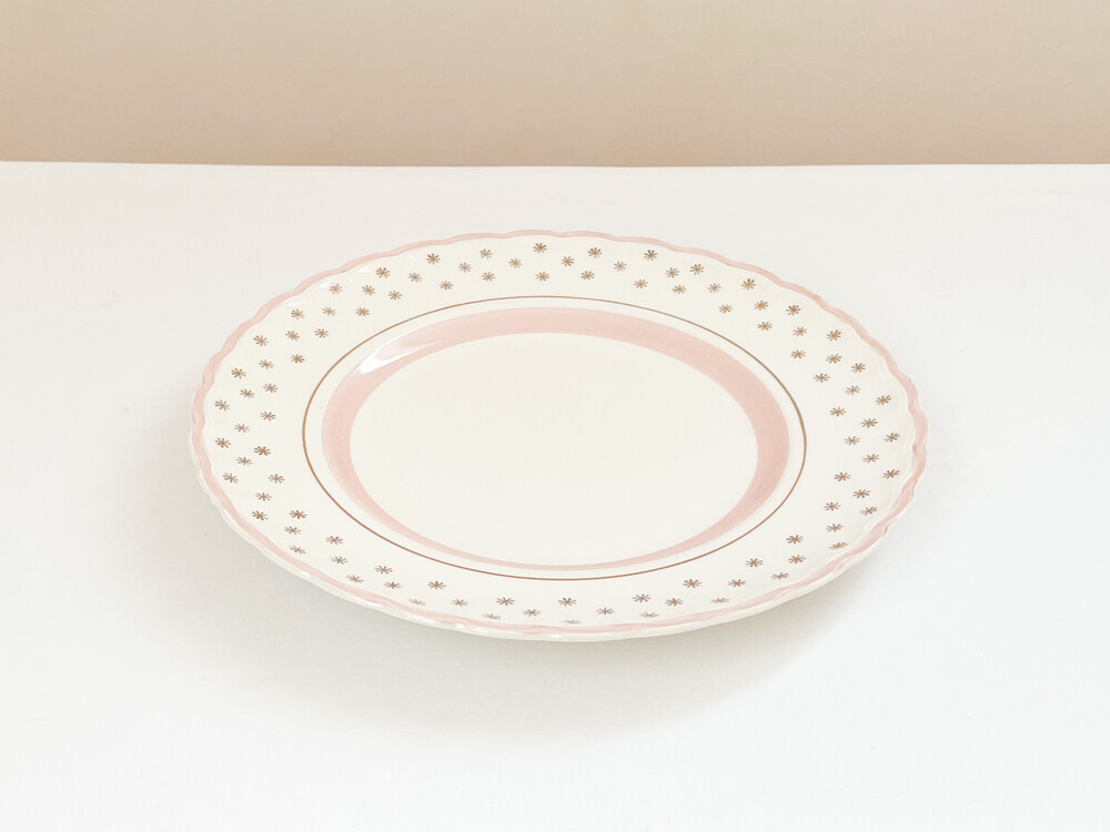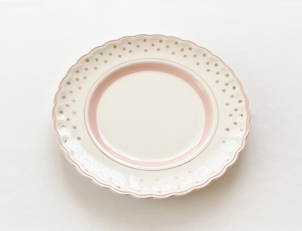 1930년대 초반에 제작된 우즈아이보리웨어의 디너플레이트입니다. 우즈아이보리웨어는 1865년부터 잉글랜드의 버슬렘지역에서 본차이나와 포슬린을 만들었던 우드앤손을 시작점으로하는 티웨어 브랜드입니다. 우드앤손은 시간의 변화와 그에따른 트랜드의 흐름에 맞춰, 새로운 시리즈가 만들어질 때마다 브랜드의 이름에 조금씩 변화를 주었습니다. 소개해드리는 접시들은 1930년대 초반, 우드앤손이 아르데코양식의 본차이나를 제작할당시의 제품입니다. 이름에서 볼 수 있듯 아이보리색의 본차이나를 바탕으로 하며- 전통적인 수공예의 주된 모티브인 자연에서 영감을 받은 무늬들과 기하학무늬, 눈에띄는 색의배열이 만들어내는 화려함, 아르데코의 실루엣, 소재에서 보여지는 영국적인 고전미의 아름다운 조화를 가지고 있습니다. 차분한 빛과 고운결의 아이보리웨어, 화사한 장미빛의 리본무늬, 22k골드의 가느다란 선과 별무늬, 팔랑이는 레이스모양의 가장자리 장식이 아름답습니다. 따스하고 우아한 분위기와 잘 어울리는 섬세한 디저트를 위한 그릇이나, 특별한 식사시간을 위한 넉넉한 접시로- 향기가 있는 비누나 양초, 작은 물건들을 보관하는 트레이로 사용하기에 잘 어울립니다.
