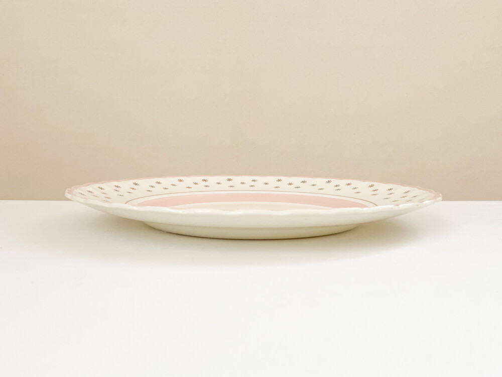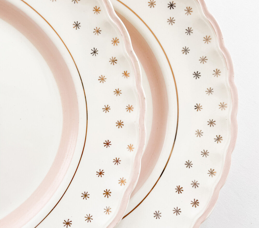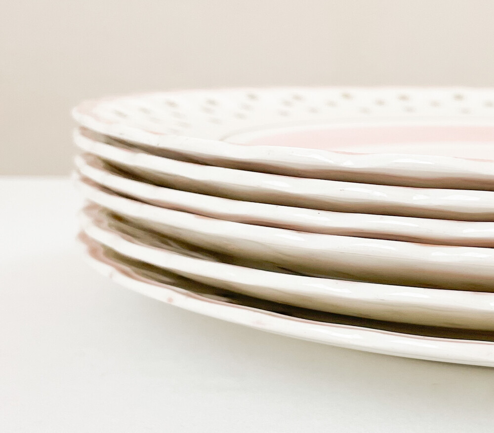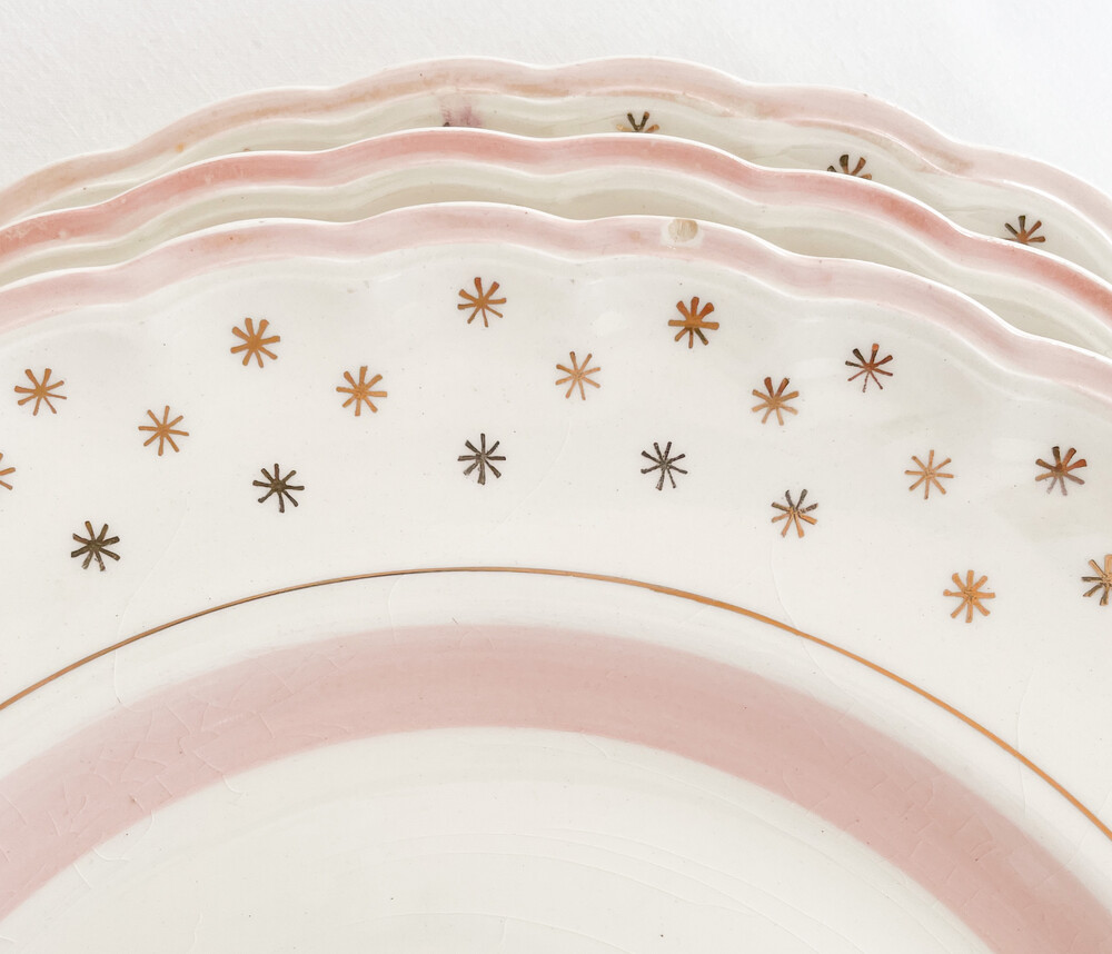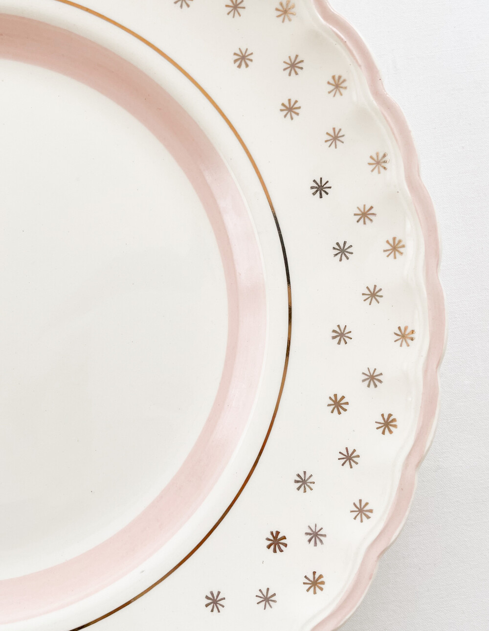 1930년대 초반에 제작된 우즈아이보리웨어의 디너플레이트입니다. 우즈아이보리웨어는 1865년부터 잉글랜드의 버슬렘지역에서 본차이나와 포슬린을 만들었던 우드앤손을 시작점으로하는 티웨어 브랜드입니다. 우드앤손은 시간의 변화와 그에따른 트랜드의 흐름에 맞춰, 새로운 시리즈가 만들어질 때마다 브랜드의 이름에 조금씩 변화를 주었습니다. 소개해드리는 접시들은 1930년대 초반, 우드앤손이 아르데코양식의 본차이나를 제작할당시의 제품입니다. 이름에서 볼 수 있듯 아이보리색의 본차이나를 바탕으로 하며- 전통적인 수공예의 주된 모티브인 자연에서 영감을 받은 무늬들과 기하학무늬, 눈에띄는 색의배열이 만들어내는 화려함, 아르데코의 실루엣, 소재에서 보여지는 영국적인 고전미의 아름다운 조화를 가지고 있습니다. 차분한 빛과 고운결의 아이보리웨어, 화사한 장미빛의 리본무늬, 22k골드의 가느다란 선과 별무늬, 팔랑이는 레이스모양의 가장자리 장식이 아름답습니다. 따스하고 우아한 분위기와 잘 어울리는 섬세한 디저트를 위한 그릇이나, 특별한 식사시간을 위한 넉넉한 접시로- 향기가 있는 비누나 양초, 작은 물건들을 보관하는 트레이로 사용하기에 잘 어울립니다.