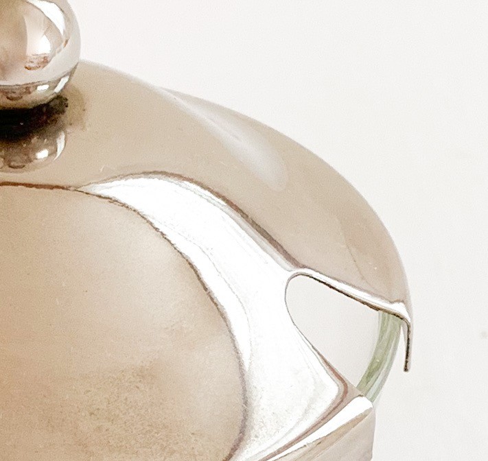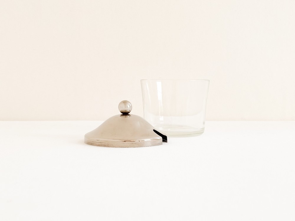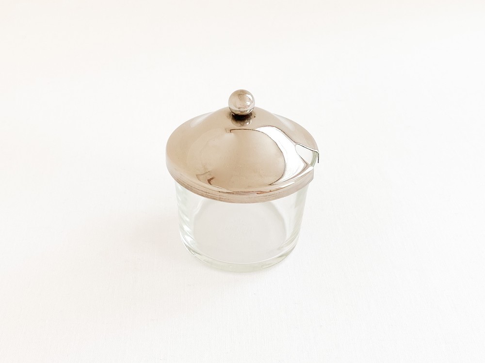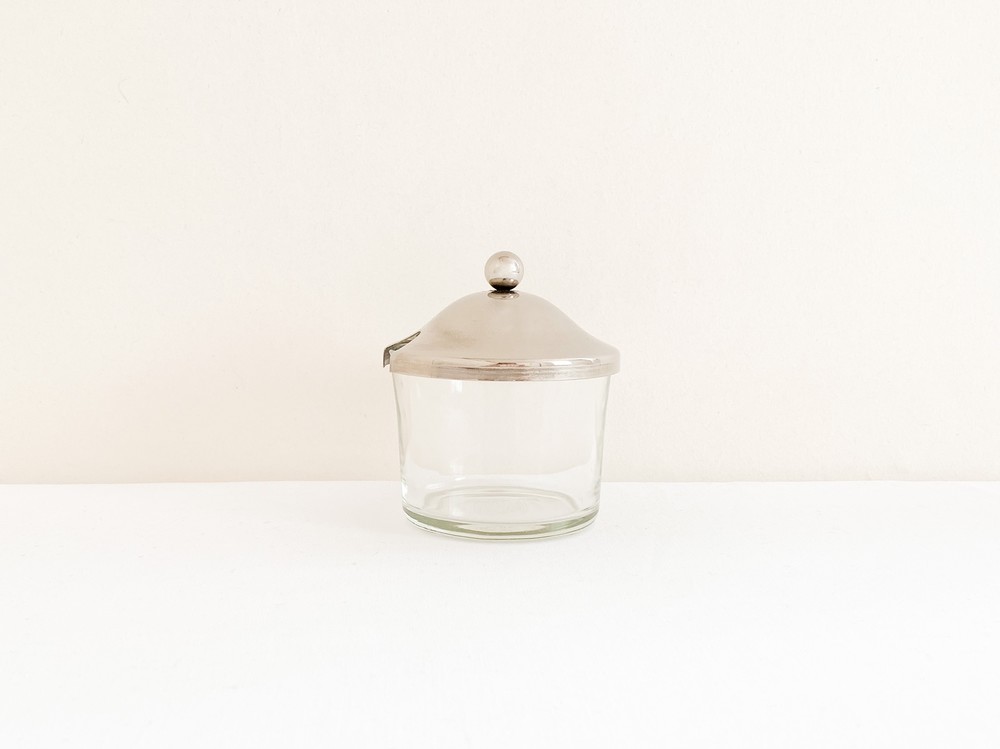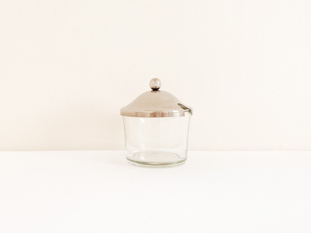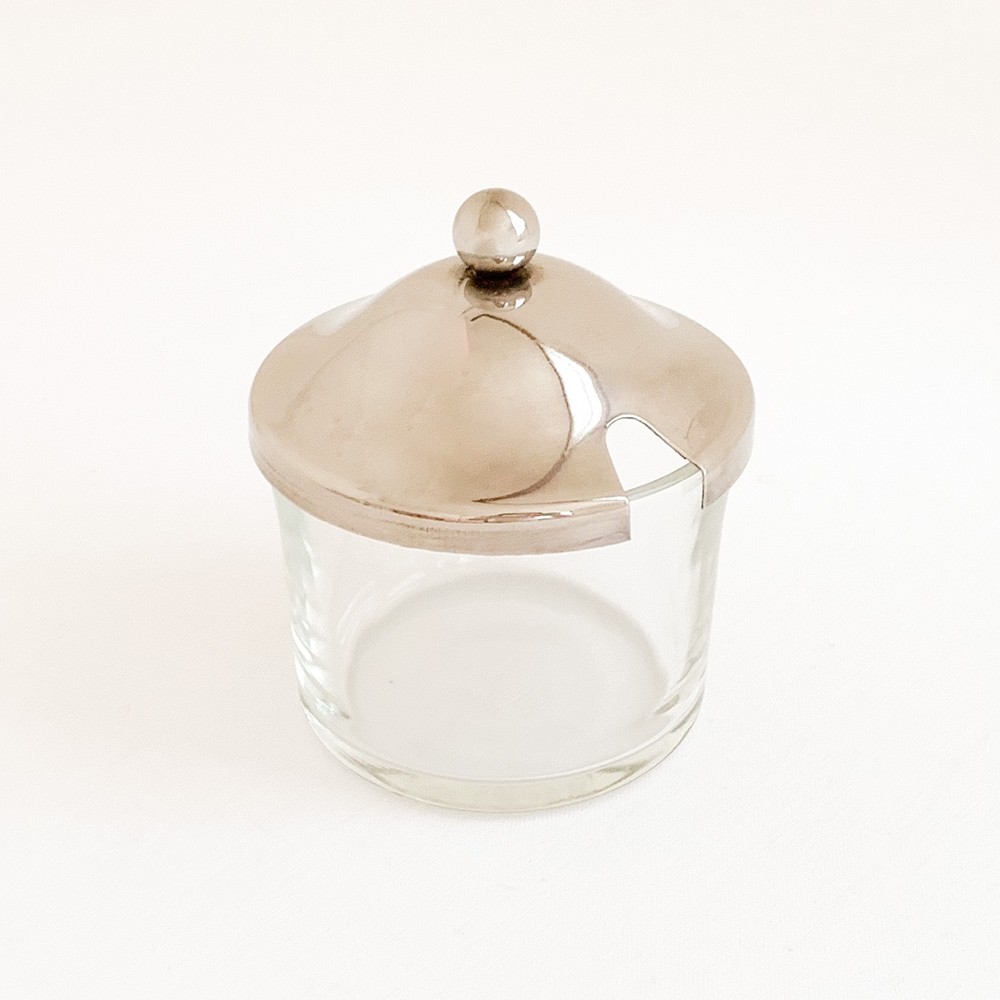 듀라렉스는 루이왕가 시대부터, 유리문과 거울을 생산했던 건축재료 회사인 프랑스의 생고뱅으을 전신으로 하는 프랑스의 글라스웨어 브랜드입니다. 1920년대에 들어 자동차가 보급되기 시작하고 유리의 사용에대한 범위가 넓어지며, 더 튼튼하고 관리가 쉬운 유리에 대한 필요에따라 생고뱅은 1929년 온도변화에 반응이 적은 강화유리를 개발하게됩니다. 듀라렉스는 이러한 시작을 바탕으로 1930년대부터, 흠집에 강하고 내용물의 온도유지에 적합한 강화유리를 소재로한 일상적인 테이블웨어를 만들기 시작했습니다. 소개해드리는 제품은 투명한 강화유리와 니켈실버-실버플레이티드(금관악기를 만드는데에 사용되는 니켈실버위에 순은을 입힌소재입니다)를 소재로, 1940년대에 만들어진 슈가팟입니다. 위를 향해 살짝 넓게 펼쳐지는 동그라미의의 보울과 구슬모양의 손잡이가 달린- 넉넉한 곡선의 실버플레이티드 뚜껑으로 구성되어있습니다. 소재에서 전해지는 맑고 단정한 감정과, 섬세한 표현들이 아름답습니다.