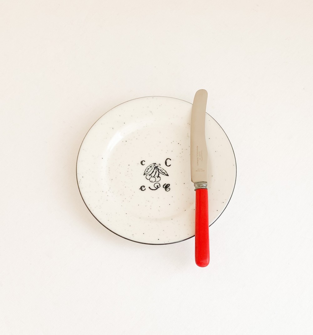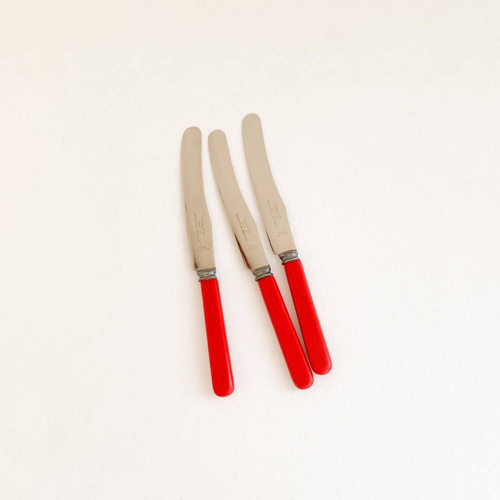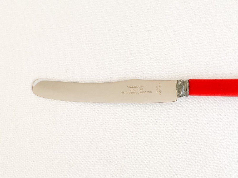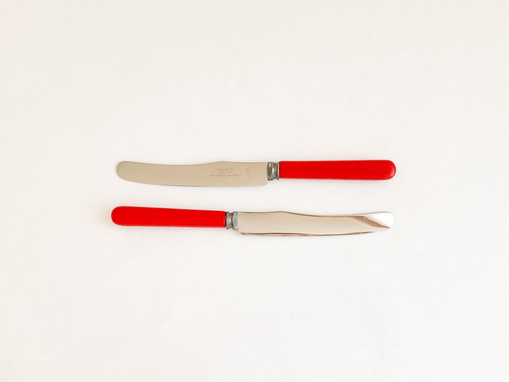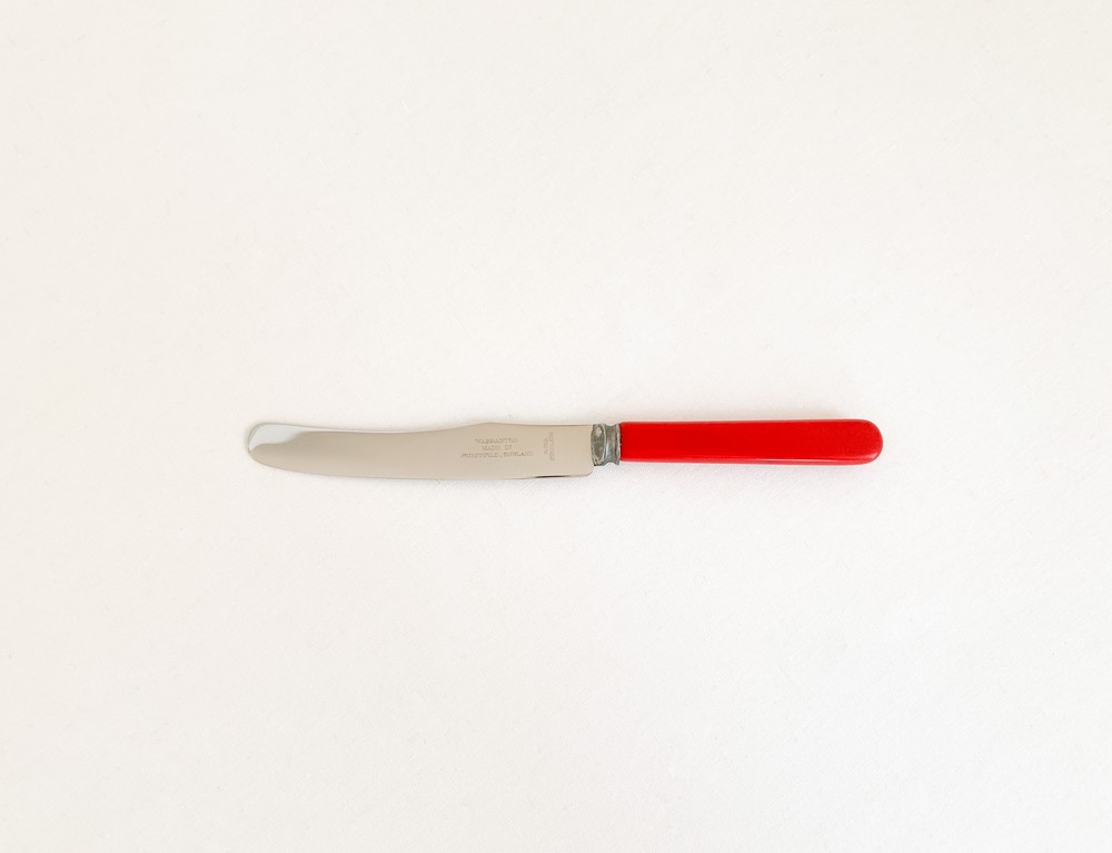 1940년대 중후반에 제작 된 것으로 전해지는 헨리엘리엇 앤 손스의 빈티지 디저트나이프입니다. 헨리엘리엇 앤 손스는 금속세공의 오랜 전통을 가지고 있는 영국의 셰필드 지역에서 대를이어 커틀러라는 직업을 이어오던 엘리엇가에 의해 1835년부터 시작된 브랜드입니다. 헨리엘리엇은 유용하게 사용될 수 있어야하며, 빛과 실루엣이 돋보일 수 있는 유용한 물건을 만드는것을 브랜드의 모티브로 삼았으며, 소개해드리는 디저트나이프는 브랜드의 정체성이 아주 잘 전해지는 모습을 가지고 있습니다. 베이클라이트와 스테인리스스틸을 소재로하는 나이프는, 고전적인 빨강의 베이클라이트와 스테인리스스틸을 주된 소재로합니다. 율동감있는 굴곡의- 섬세한 면으로 다듬어진 날과 둥글고 단정한 모습의 손잡이, 소재의 색과 질감이 연결되며 만들어내는 경쾌한 리듬이 전해집니다. 나이프날의 가운데에는 생잔지와 소재, 품질보증을 뜻하는 셰필드 워런티가 가느다란 글씨로 새겨져 있습니다. 식탁의 가운데에 두는 잼과 버터를 위한 나이프로, 계절의 과일이 가득담긴 파이와 함깨내는 디저트 나이프로 사용하기에 잘 어울립니다.