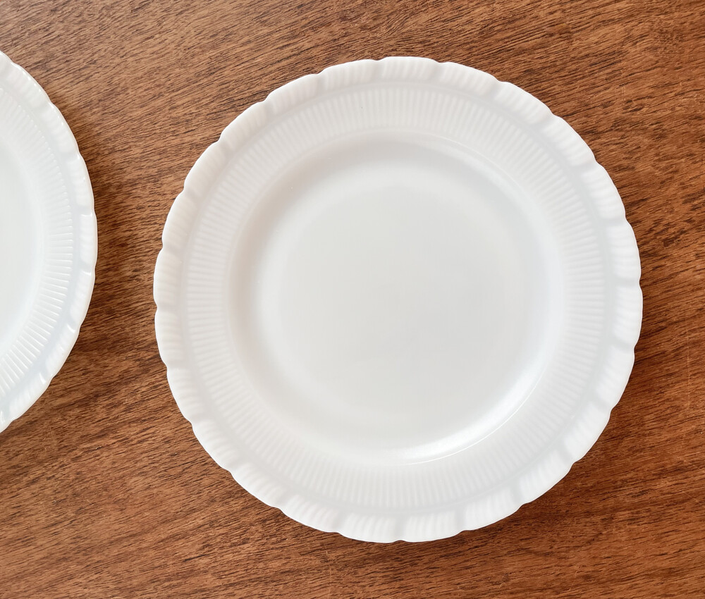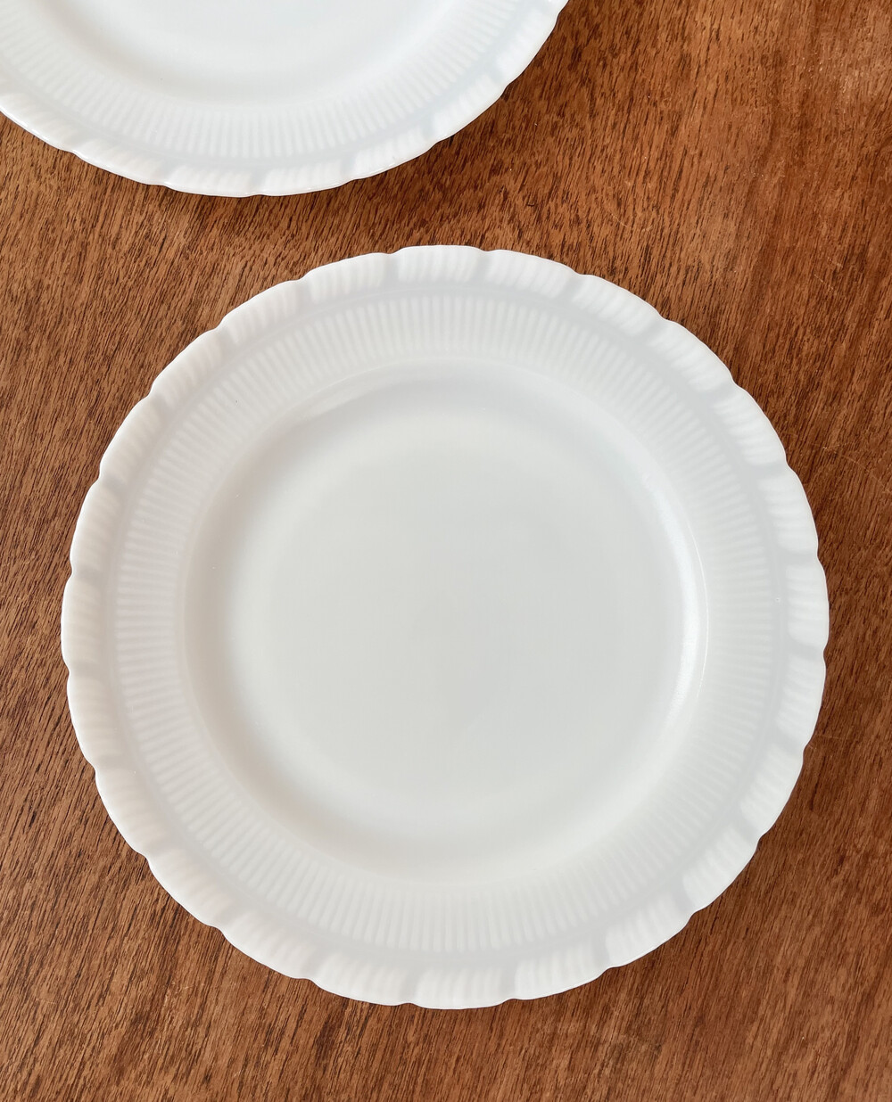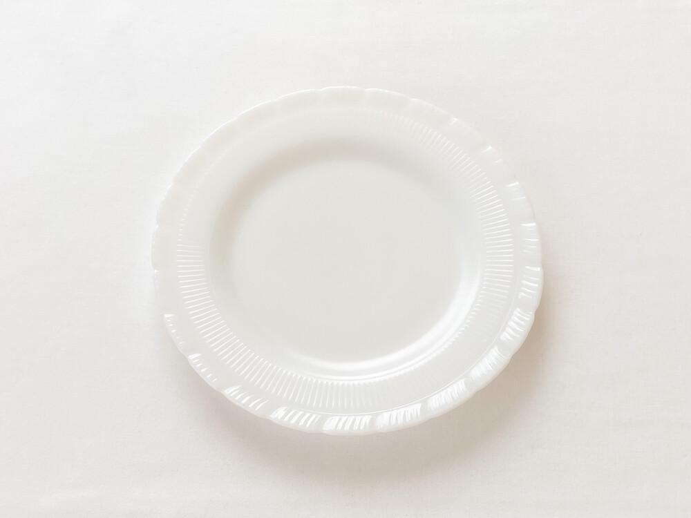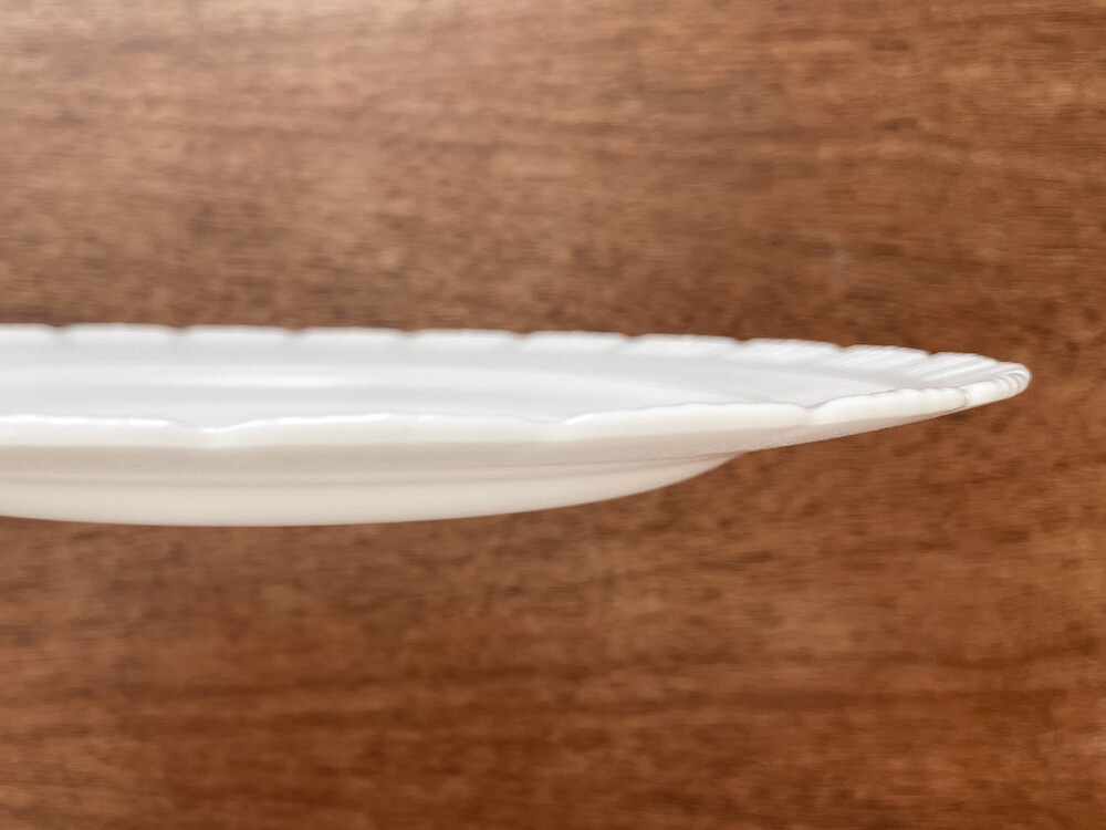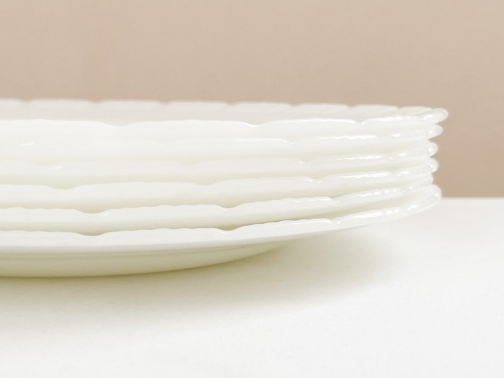 맥베스-에반스의 빈티지 케이크플레이트 입니다. 멕베스에반스는 1800년대 후반, 토마스 에반스와 조지 맥베스로 부터 시작 된 미국의 글라스웨어 브랜드입니다. 초장기에는 산업용-건축용 유리를 생산하던 맥베스에반스는 안정적인 생산시설을 바탕으로 1920년대 부터, 보편적으로 사용될 수 있는 테이블-키친웨어로 범위를 넓히게 됩니다. 1930년대에 들어서는 프랑스 생고뱅의 강화유리 개발의 영향을 받아, 코닝웨어와 함께 협업을 하며- 맥메스에반스를 대표하는 매끄럽게 반짝이는 반투명의 밀크글라스를 완성합니다. 소개해 드리는 제품은 위와같은 과정의 시작점에서 만들어진, 맥베스에반스의 흐름에 아주 중요한 부분을 차지하는 1930년대 - 1940년대에 걸쳐 만들어진 티플레이트로, 빛의 은은한 일렁임이 스며있는 밀크글라스를 소재로 합니다. 둥글고 넓은 단정한 동그라미를 바탕으로, 꽃잎을 닮은 가지런한 레이스 장식들이 섬세한 실루엣으로 펼쳐져 있습니다. 밀크글라스 특유의 뽀얗고 보드라운 분위기와 맥베스에반스만이 가지고 있는 드라마틱-로맨틱한 감수성이 조화롭습니다. 계절의 열매과일과 함께 내는 케이크 한조각, 아이스크림을 동그랗게 올려낸 파이를 담아내기에 잘 어울리며, 매일 사용하는 식사시간의 화사한 그릇으로 사용하기에도 알맞습니다.
