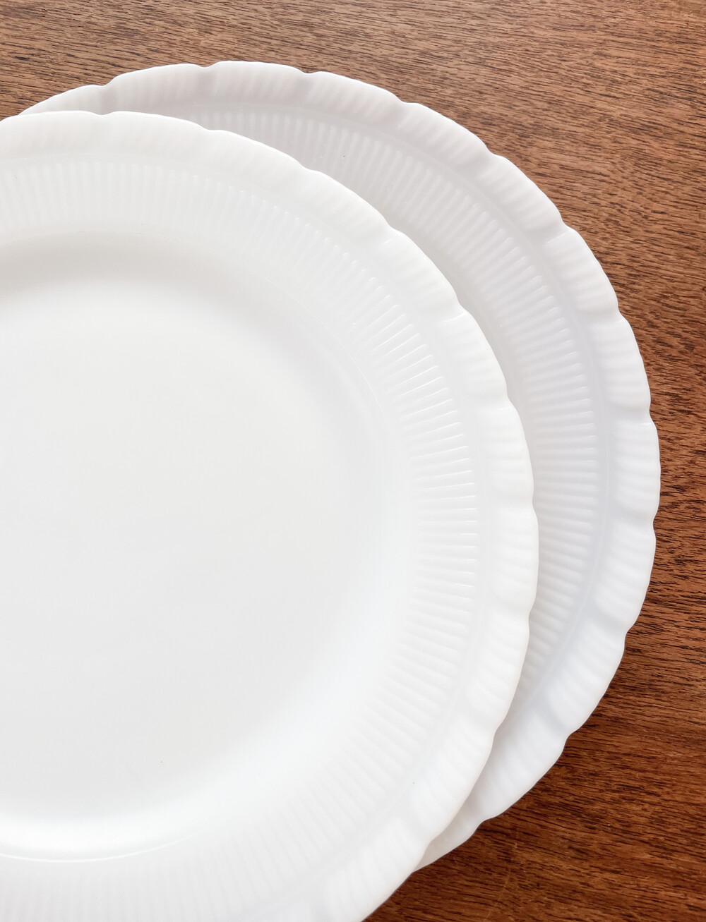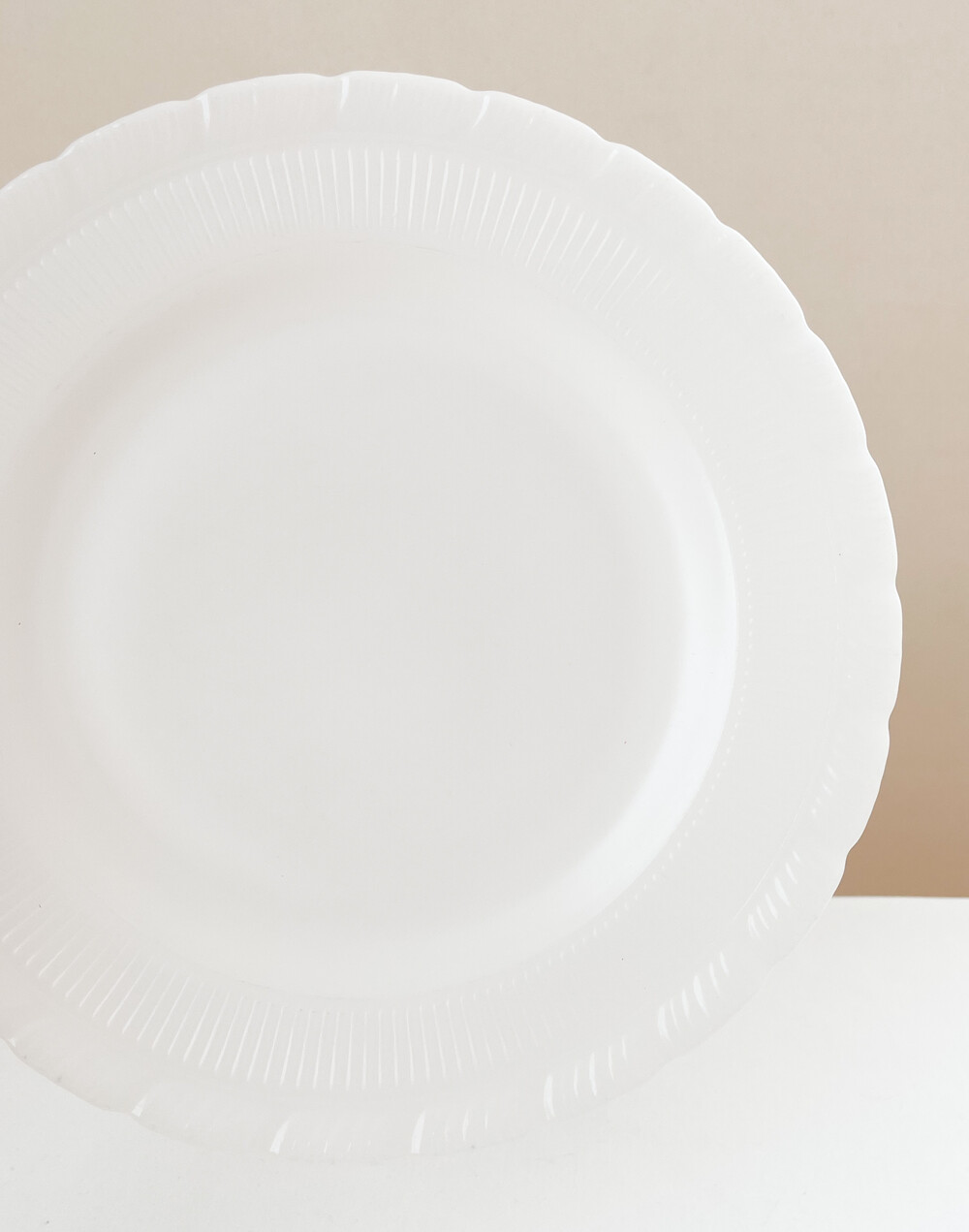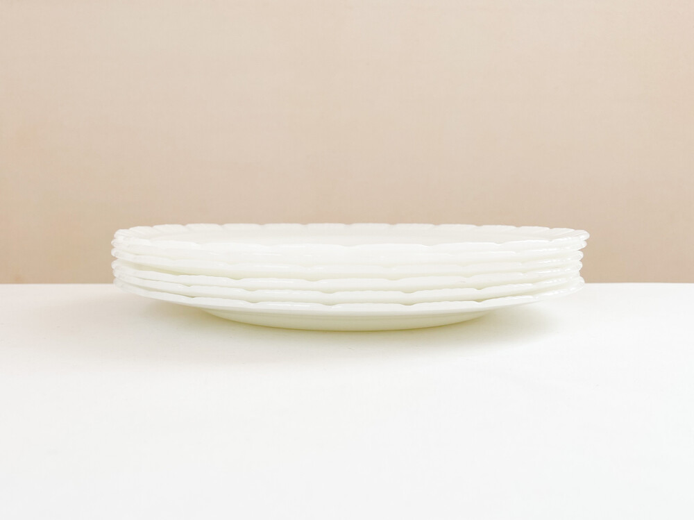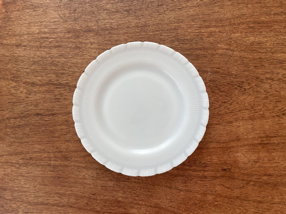 맥베스-에반스의 빈티지 케이크플레이트 입니다. 멕베스에반스는 1800년대 후반, 토마스 에반스와 조지 맥베스로 부터 시작 된 미국의 글라스웨어 브랜드입니다. 초장기에는 산업용-건축용 유리를 생산하던 맥베스에반스는 안정적인 생산시설을 바탕으로 1920년대 부터, 보편적으로 사용될 수 있는 테이블-키친웨어로 범위를 넓히게 됩니다. 1930년대에 들어서는 프랑스 생고뱅의 강화유리 개발의 영향을 받아, 코닝웨어와 함께 협업을 하며- 맥메스에반스를 대표하는 매끄럽게 반짝이는 반투명의 밀크글라스를 완성합니다. 소개해 드리는 제품은 위와같은 과정의 시작점에서 만들어진, 맥베스에반스의 흐름에 아주 중요한 부분을 차지하는 1930년대 - 1940년대에 걸쳐 만들어진 티플레이트로, 빛의 은은한 일렁임이 스며있는 밀크글라스를 소재로 합니다. 둥글고 넓은 단정한 동그라미를 바탕으로, 꽃잎을 닮은 가지런한 레이스 장식들이 섬세한 실루엣으로 펼쳐져 있습니다. 밀크글라스 특유의 뽀얗고 보드라운 분위기와 맥베스에반스만이 가지고 있는 드라마틱-로맨틱한 감수성이 조화롭습니다. 계절의 열매과일과 함께 내는 케이크 한조각, 아이스크림을 동그랗게 올려낸 파이를 담아내기에 잘 어울리며, 매일 사용하는 식사시간의 화사한 그릇으로 사용하기에도 알맞습니다.