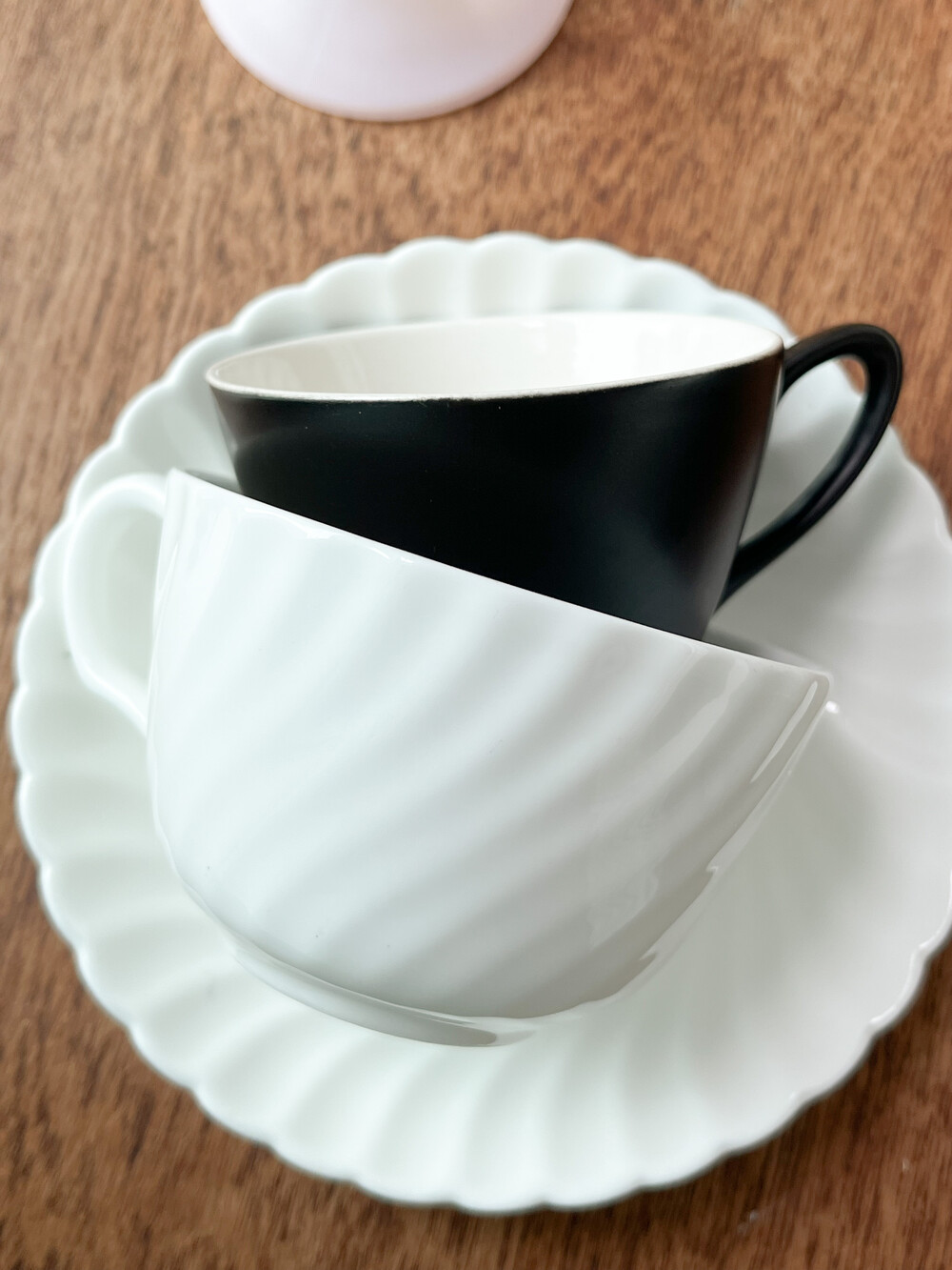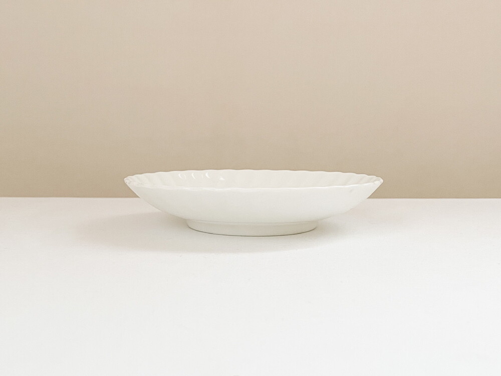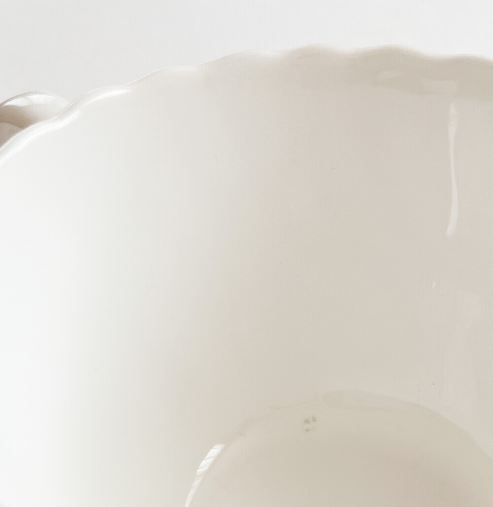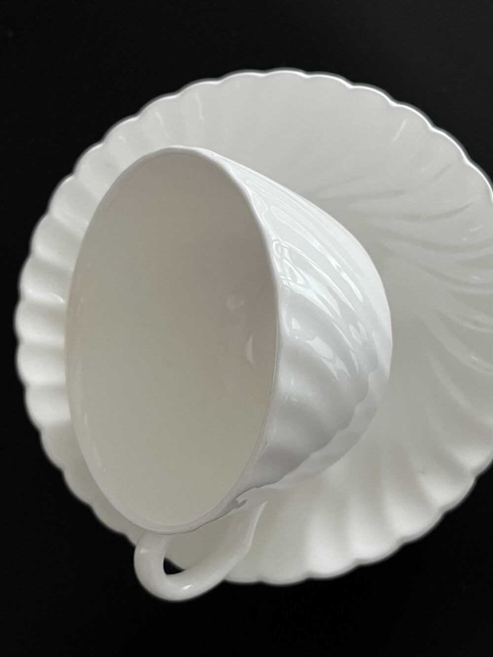 민튼은 1793년 영국도자기의 중심지인 스태포드셔-스토크온트렌트에서 본차이나를 만들기 시작했습니다. 고전의 범위에서 벗어나지 않은 이국적인 분위기를 가진 무늬와 장식으로 꾸며진 본차이나로, 영국과 프랑스를 비롯한 유럽에서 명성을 누렸던 브랜드입니다. 소개해드리는 제품은 1940년대에 제작 된 찻잔세트 입니다. 고운결의 아이보리 본차이나를 소재로하며, 넓직한 동그라미의 찻잔과 위를 향해 오목한 선을 그리는 잔받침으로 구성되어있습니다. 잔의 겉면과 잔받침의 가장자리에는 잔잔하게 일렁이는 물결이나 찰랑거리는 드레스의 아랫단을 떠올리는 레이스 패턴이 장식되어 있습니다. 우아한 무게감과 맑고 환한 분위기를 전해줍니다. 우유를 넣은 커피나 차한잔, 아이스크림이나 요거트를 담아내는 그릇으로 사용하기에 알맞습니다.