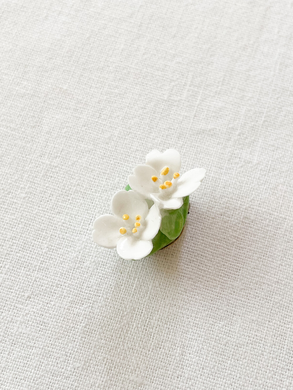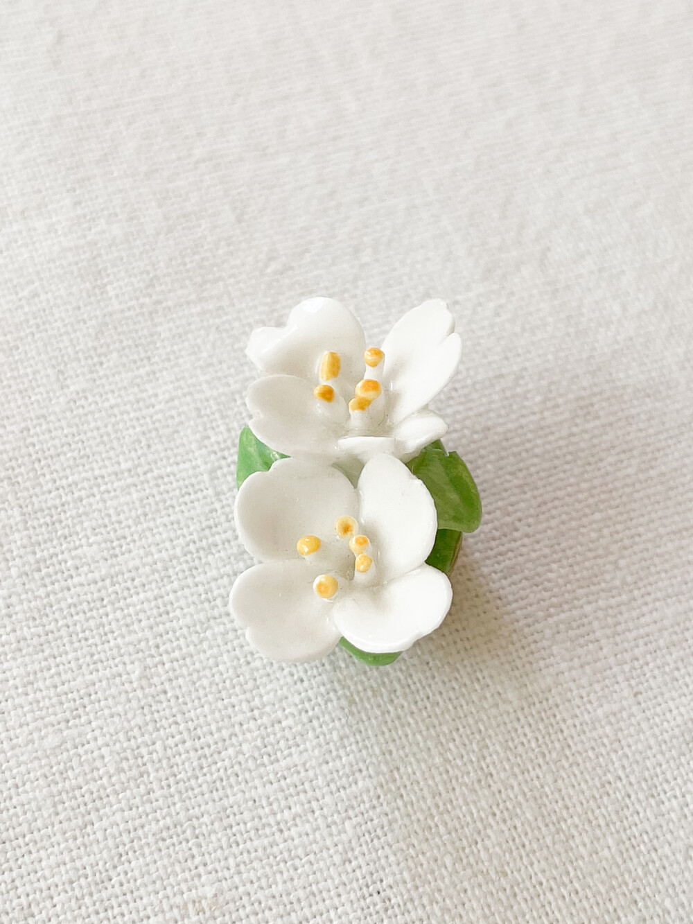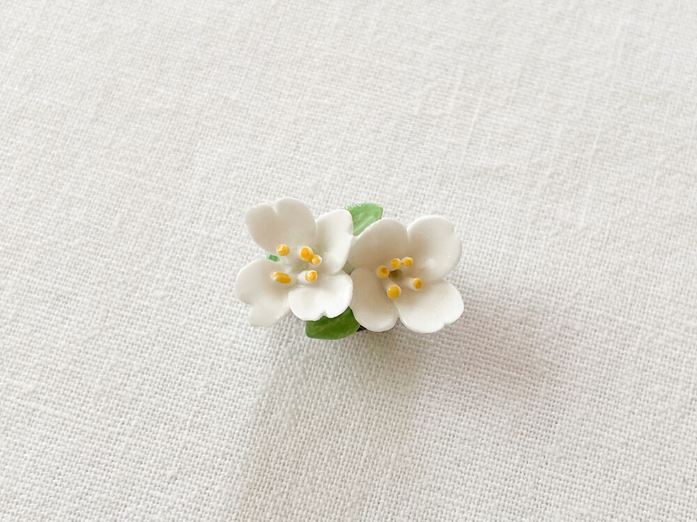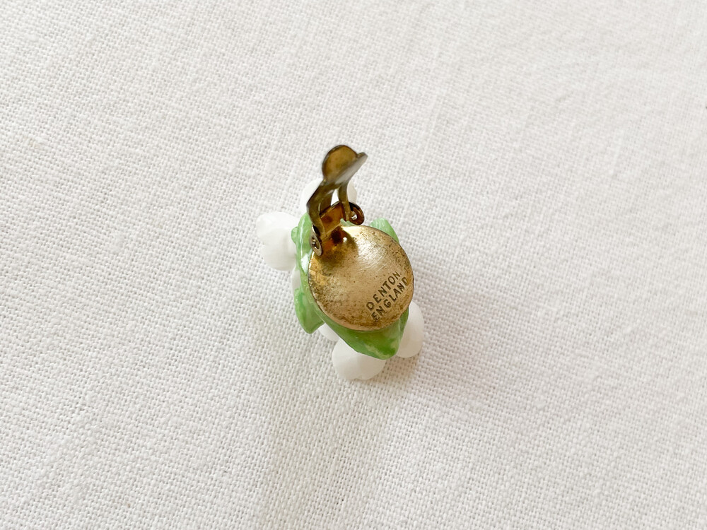 1940년대 후반 영국에서 만들어진 빈티지 이어클립입니다. 장식과 꾸밈이라는 키워드를 가지고 도자기들을 생산했던 영국의 포터리들은 전통적으로 도자기들과 함께 주얼리를 다루었던 역사를 가지고있습니다. 주로 본차이나 또는 포셀린으로 빚어진 주얼리들은 이러한 흐름안에서 만들어진 제품으로, 영국 도자기의 중심지인 stoke on trent의 도자기 셀러이자 장식가였던 Lawson에 의해 제작되기 시작했습니다. 빅토리아시대의 화려하고 상징적인 모티프를 바탕으로, 숙련된 기술을 가지고 있던 도공들의 자유롭고 세심한 표현이 더해진 커스터마이징 주얼리들은 아름다움 장식품으로서,그리고 하나 뿐인 수집품으로서 큰 인기를 가지게 됩니다. 소개해드리는 제품은 포셀린을 소재로 합니다. 하얀 꽃잎을 가진 두 송이의 꽃과 엷은 초록의 잎사귀로 모양을 이루는 이어클립입니다. 꿀벌이 날아들 것 같은 여린 꽃잎과 살랑이는 향기가 전해지는 조그마한 꽃술이 아름답습니다. 적당히 눈에 띄는 크기와 담담한 색과 빛, 섬세한 표현들이 보기좋은 균형을 이룹니다. 단정하게 정돈한 차림에 화사한 꾸밈이 되어주는 이어클립으로, 셔츠의 버튼홀이나 스웨터의 한켠에 따사로움을 더해 줄 브로치로 사용하기에 잘 어울립니다.