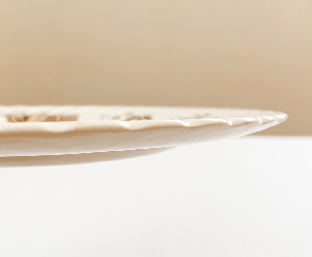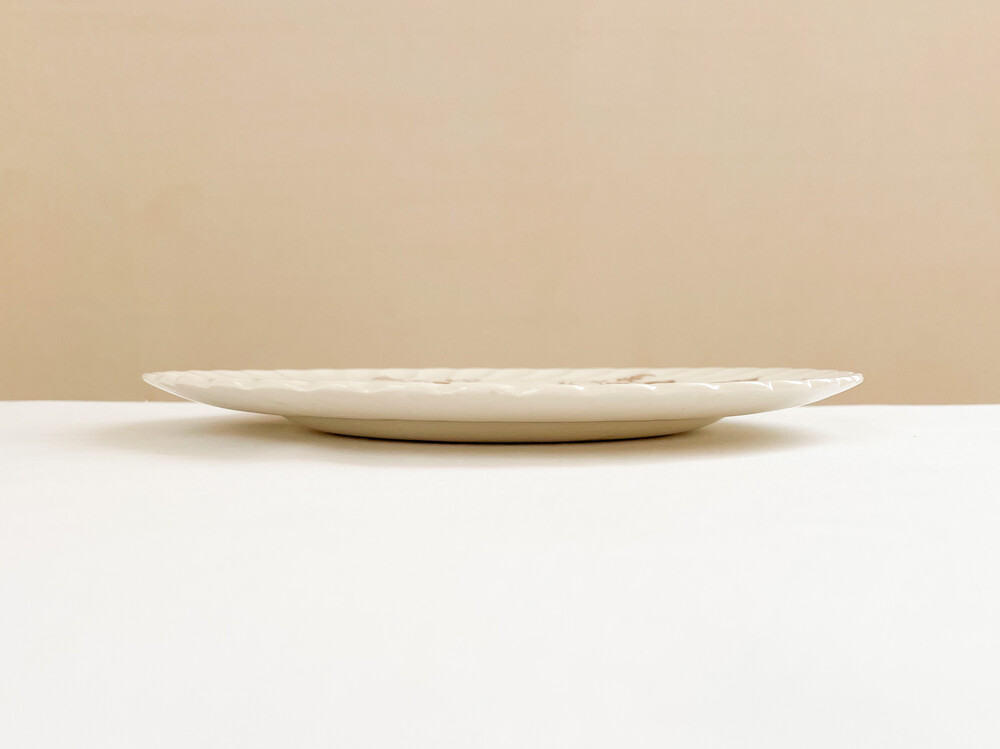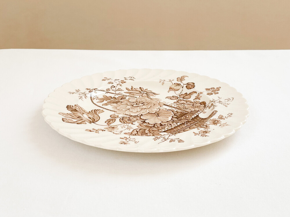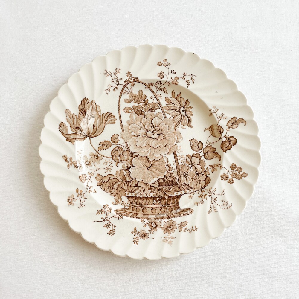 소개해드리는 제품은 1940년대에 만들어진 케이크플레이트입니다. 고전적인 스윌패턴의 넓은 접시위에 클라리스클리프의 아름다운 그림이 섬세한 결로 입혀져있습니다. 바탕이되는 아이언웨어의 따스한 빛과 꽃바구니그림의 부드러운 초콜렛색이 조화롭습니다. 꽃바구니에는 따뜻한 계절을 알려주는 작약, 튤립, 다알리아, 제라늄 꽃송이들이 풍성하고 드라마틱한 실루엣을 그리며 놓여있습니다. 매일 사용하는 넉넉하고 화사한 그릇으로, 아늑하고 우아한 분위기의 꾸며오브제로 놓아두기에 잘 어울립니다.