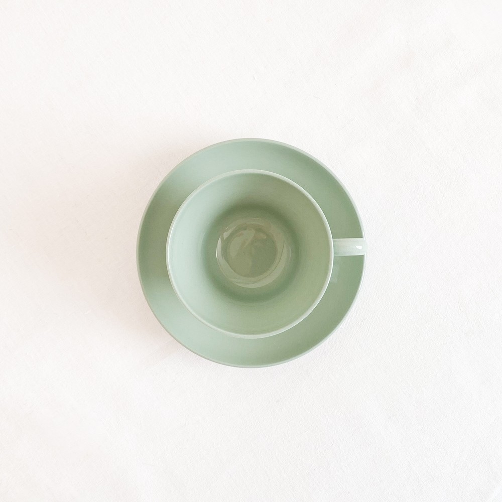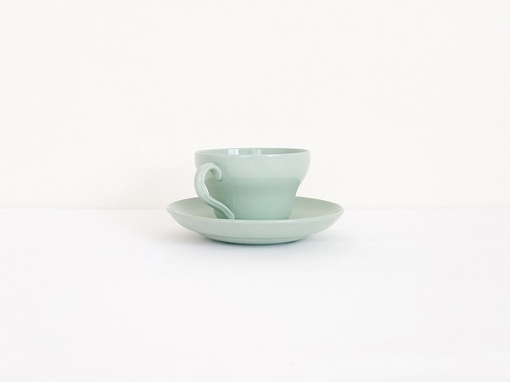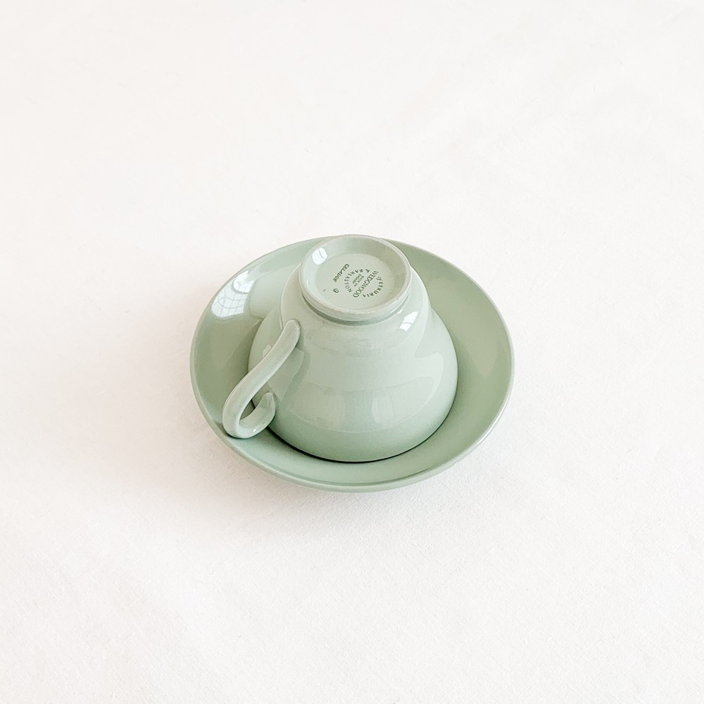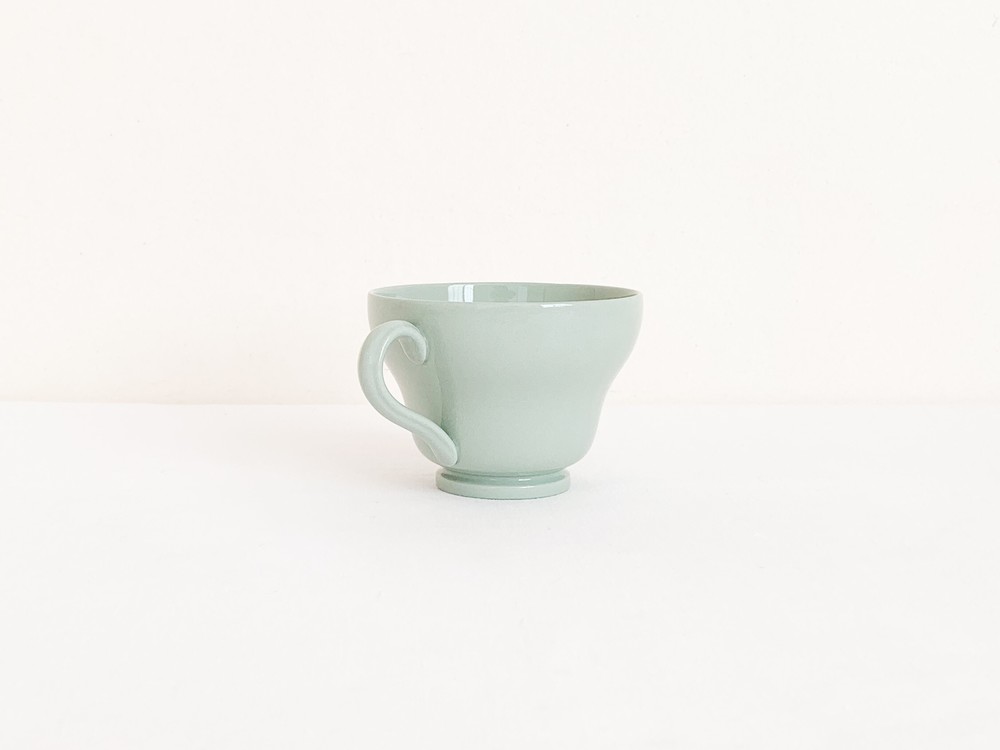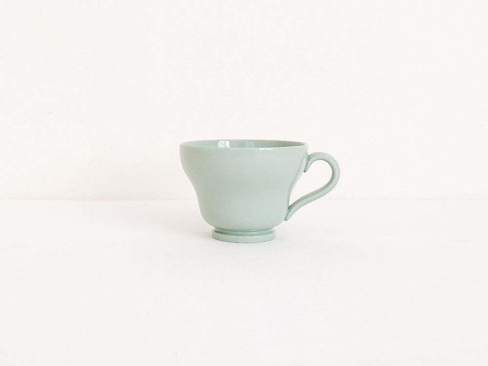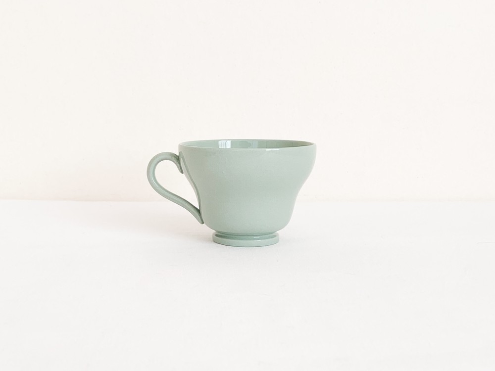 1940년대 초반의 웨지우드 빈티지 찻잔세트입니다. 웨지우드는 1759년 부터 영국의 버슬램지역에서 도자기를 만들어온 브랜드입니다. 고급 티웨어와 식기들, 그리고 도자기 장식품들을 만들며 가치를 쌓아오는 웨지우드는 1760년대 부터 왕실에 도자기를 납품하며 웨지우드-퀸즈웨어 라는 명칭을 얻게됩니다. 섬세한 디자인과 좋은 품질의 도자기를 꾸준히 만들어내며, 영국을 비롯한 도자기라는 카테고리를 대표하는 브랜드로 자리잡게 됩니다. 소개해드리는 제품은 밀도높은 본차이나를 소재로 제작된 것으로, 잘록한 굽이있는 종모양의 찻잔과 오목한 동그라미의 잔받침으로 구성되어있습니다. 아르누보의 영향을 받은 - 여성적인 화려함이 단정한 매무새로 표현된 형태를 살펴볼 수 있으며, 고요한 윈터그린의 유약이 전체에 매끄럽게 입혀져있습니다. 은은하고 차분게 반짝이는, 우아한 분위기가 전해집니다. 짙은 커피나 따끈한 차한잔를 마시는 잔으로, 아이스크림을 동그랗게 담아내는 그릇으로 사용하기에 잘어울립니다.