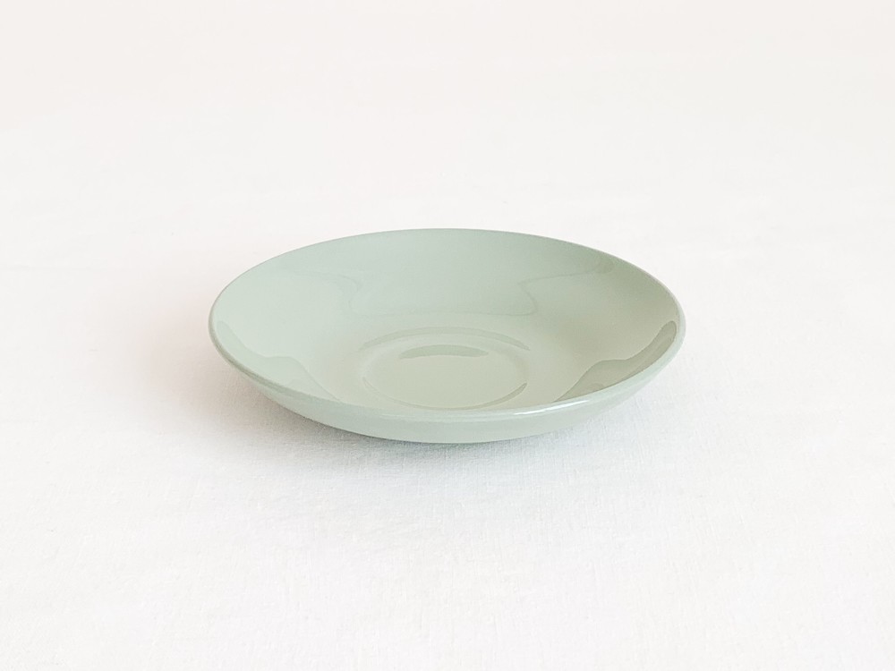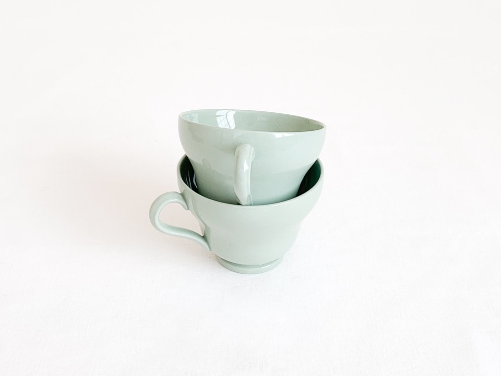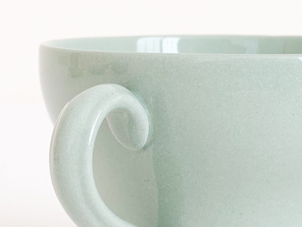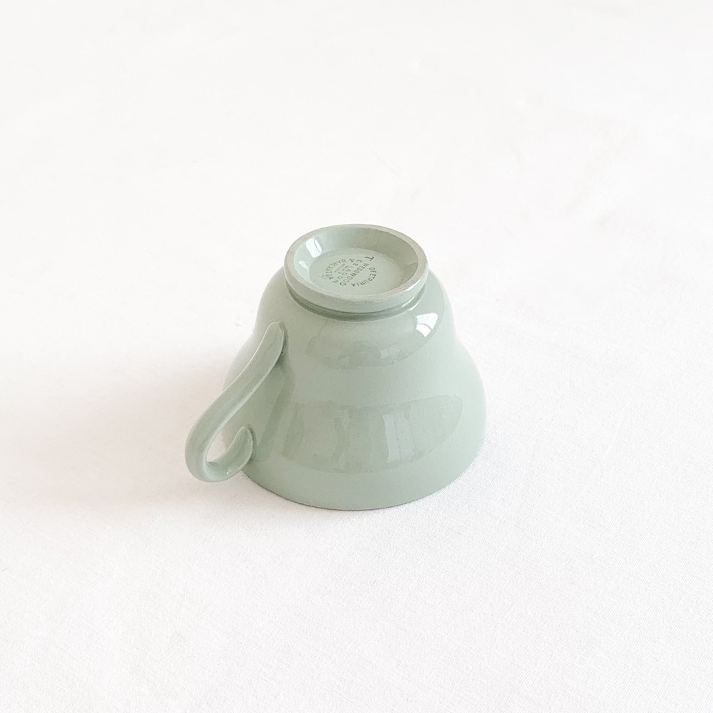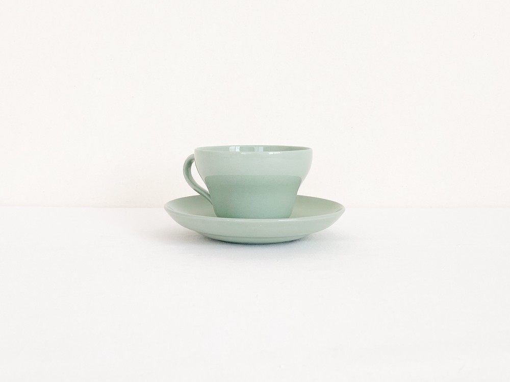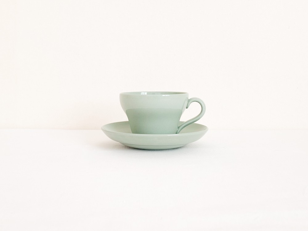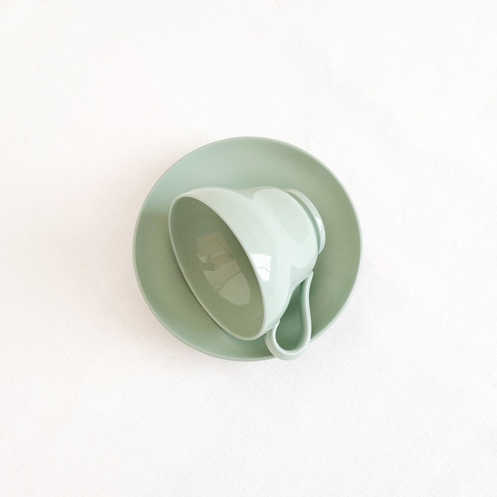 1940년대 초반의 웨지우드 빈티지 찻잔세트입니다. 웨지우드는 1759년 부터 영국의 버슬램지역에서 도자기를 만들어온 브랜드입니다. 고급 티웨어와 식기들, 그리고 도자기 장식품들을 만들며 가치를 쌓아오는 웨지우드는 1760년대 부터 왕실에 도자기를 납품하며 웨지우드-퀸즈웨어 라는 명칭을 얻게됩니다. 섬세한 디자인과 좋은 품질의 도자기를 꾸준히 만들어내며, 영국을 비롯한 도자기라는 카테고리를 대표하는 브랜드로 자리잡게 됩니다. 소개해드리는 제품은 밀도높은 본차이나를 소재로 제작된 것으로, 잘록한 굽이있는 종모양의 찻잔과 오목한 동그라미의 잔받침으로 구성되어있습니다. 아르누보의 영향을 받은 - 여성적인 화려함이 단정한 매무새로 표현된 형태를 살펴볼 수 있으며, 고요한 윈터그린의 유약이 전체에 매끄럽게 입혀져있습니다. 은은하고 차분게 반짝이는, 우아한 분위기가 전해집니다. 짙은 커피나 따끈한 차한잔를 마시는 잔으로, 아이스크림을 동그랗게 담아내는 그릇으로 사용하기에 잘어울립니다.