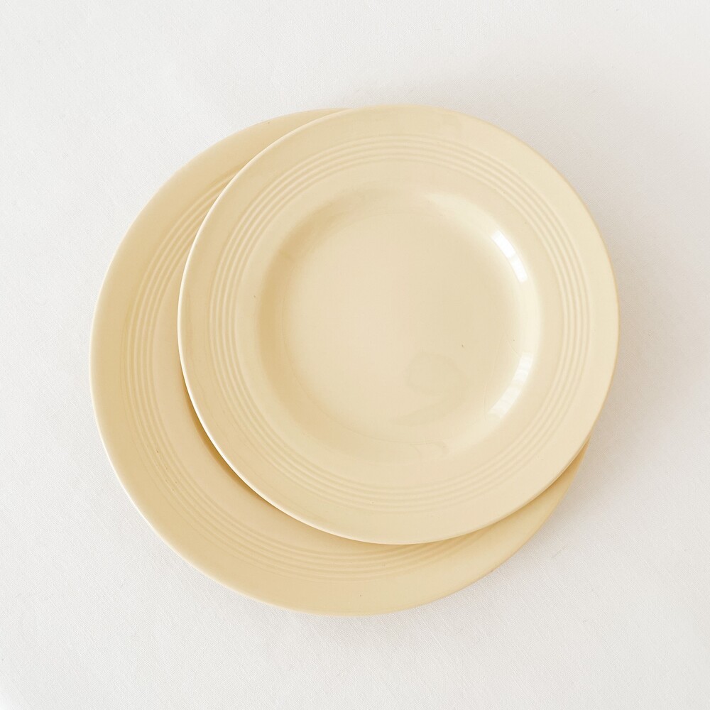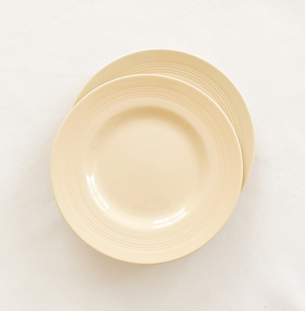 1940년대에 제작된 우즈웨어의 빈티지 접시입니다. 우즈웨어는 1865년부터 잉글랜드의 버슬렘지역에서 본차이나와 포슬린을 만들었던- 우드앤손에서 시작된 본차이나 브랜드입니다. 우드앤손은 시간의 변화와 그에따른 트랜드의 흐름에 맞추어진 새로운 시리즈가 만들어질 때마다 브랜드의 이름에 조금씩 변화를 주었습니다. 소개해드리는 제품은 우드앤손이 색감과 면face의 표현에 중점을 두었던 1940년대 중반의 것으로, 적당한 묵직함을 가진 본차이나를 소재로 합니다. 부드러운 동그라미들의 레이어가 보여지는 접시는, 우드앤손이 1900년대 초반동안 주된 모티브를 얻었던 아르데코의 영향을 받은 모습을 보여줍니다. 화사하고 잔잔한 커스터스색 접시의 가장자리는- 완만하고 섬세한 실루엣으로 펼쳐져있으며, 가지런한 음각의 줄무늬들이 새겨져 있습니다. 우아하고 단정한 분위기를 간직한 제품입니다. 크림을 곁들인 파운드케이크 한조각, 따뜻하게 데워낸 파이를 담아내거나, 매일 사용하는 식사시간의 그릇으로 사용하기에 잘 어울립니다.