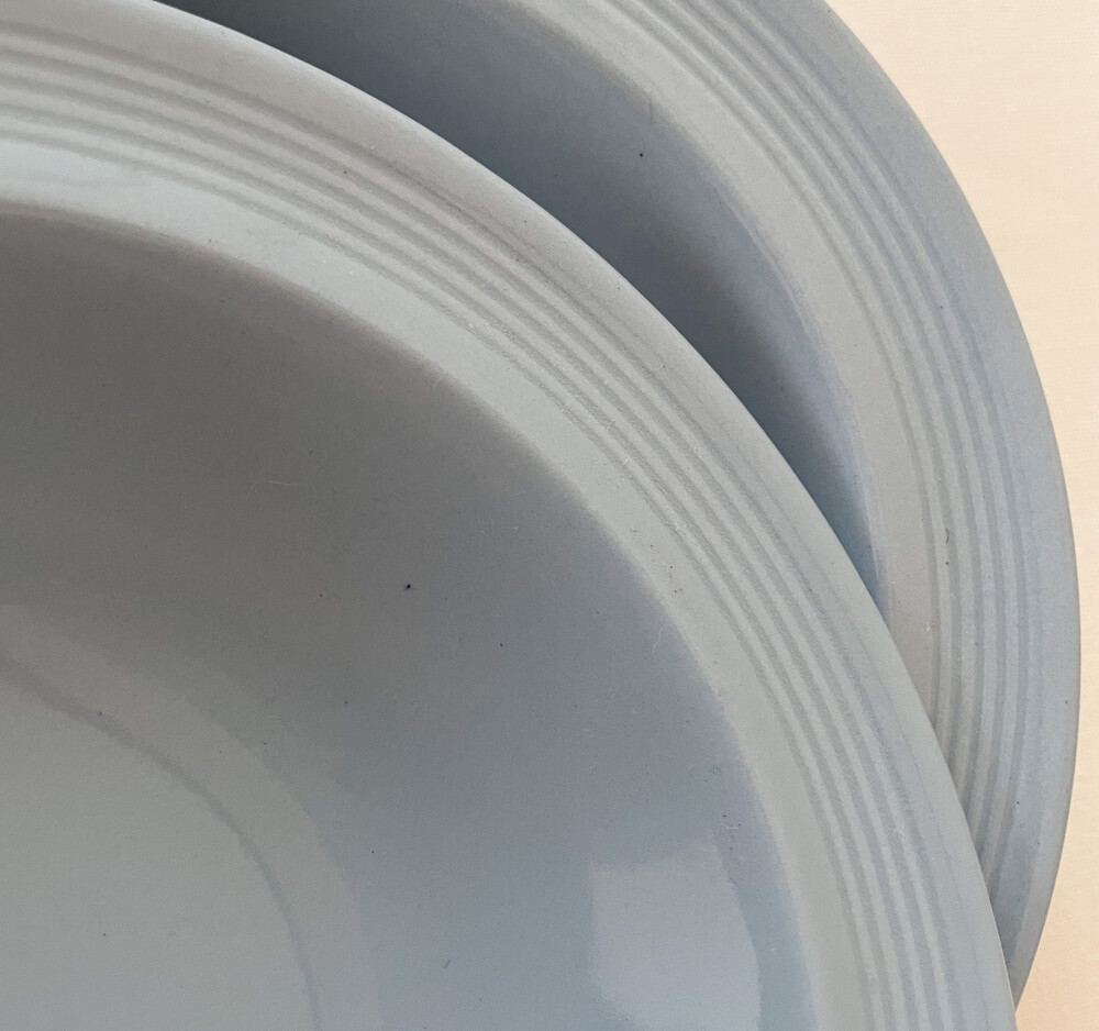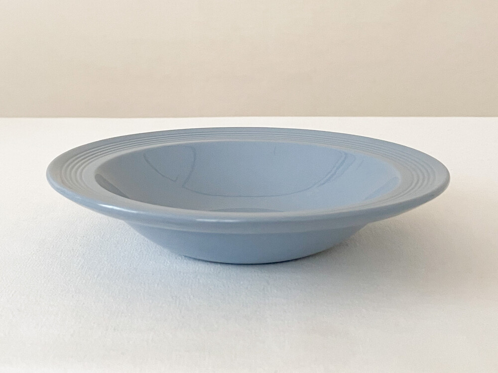 1940년대에 제작된 우즈웨어의 디저트보울 입니다. 우즈웨어는 1865년부터 잉글랜드의 버슬렘지역에서 본차이나와 포슬린을 만들었던- 우드앤손에서 시작된 본차이나 브랜드입니다. 우드앤손은 시간의 변화와 그에따른 트랜드의 흐름에 맞추어진 새로운 시리즈가 만들어질 때마다 브랜드의 이름에 조금씩 변화를 주었습니다. 소개해드리는 제품은는 우드앤손이 색감과 면face의 표현에 중점을 두었던 1940년대 중반의 것으로, 적당한 묵직함을 가진 본차이나를 소재로 합니다. 부드러운 동그라미들의 레이어가 보여지는 보울은, 우드앤손이 1900년대 초반동안 주된 모티브를 얻었던 아르데코의 영향을 받은 모습을 보여줍니다. 전체에 고르게 보여지는 차분하고 우아한 푸른색이 아름다우며, 가장자리는- 완만한 실루엣으로 위를 향해 펼쳐져 가지런한 음각의 줄무늬들이 장식되어 있습니다. 우아하고 단정한 분위기를 간직한 제품입니다. 아이스크림이나 과일을 담아내거나, 정성스런 시간을 담아 만든 따뜻한 수프를 위한 그릇으로 사용하기에 잘 어울립니다.