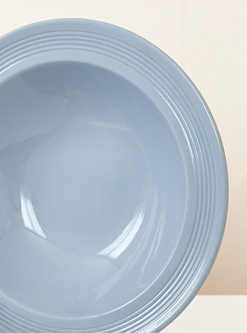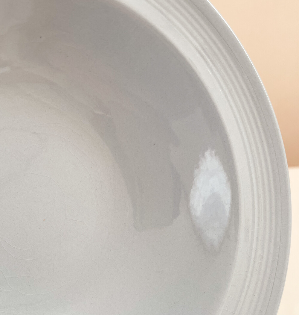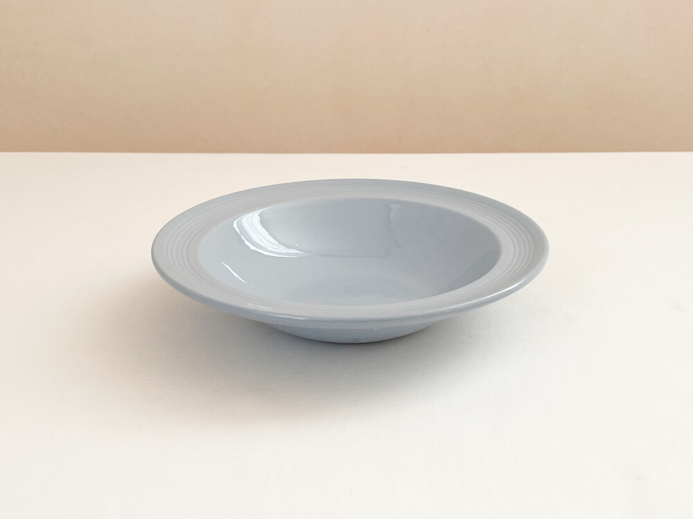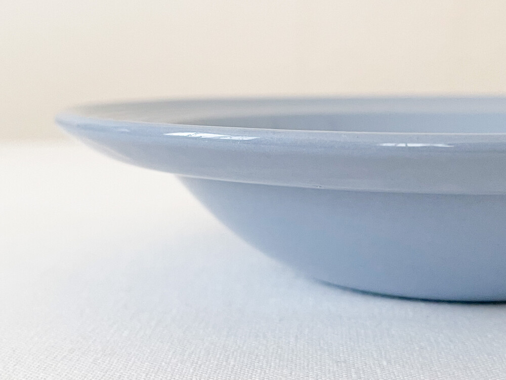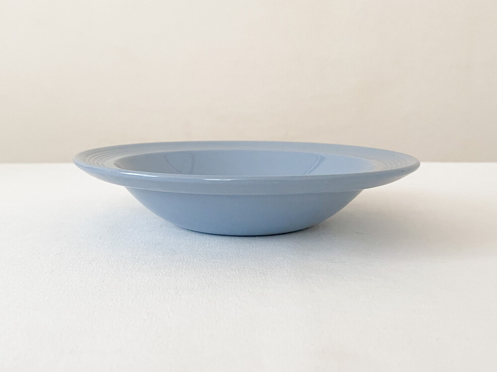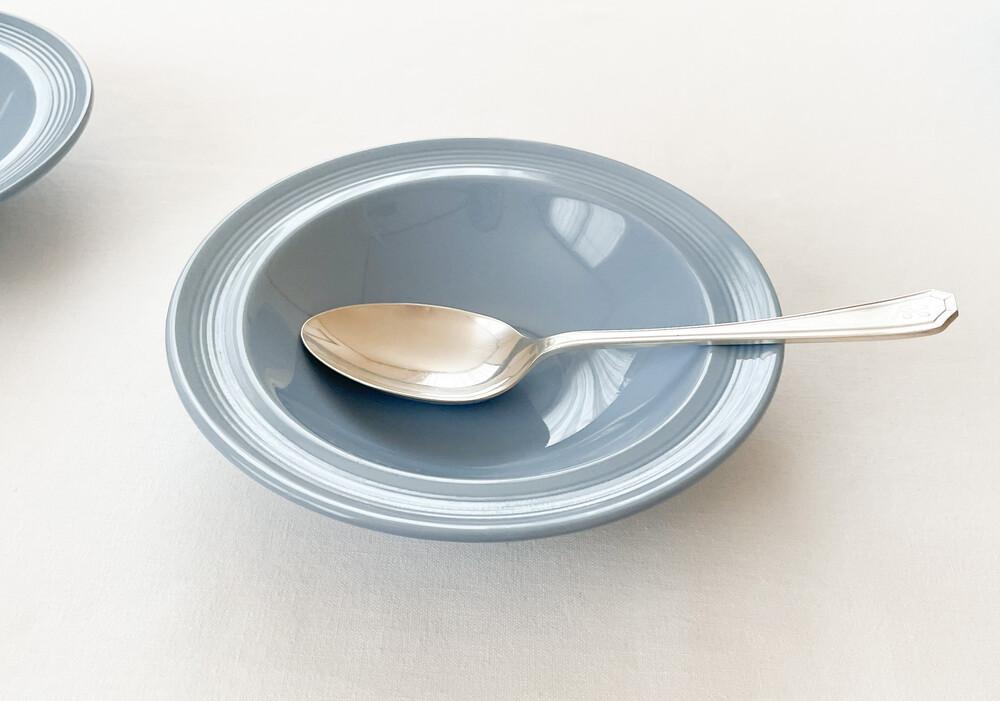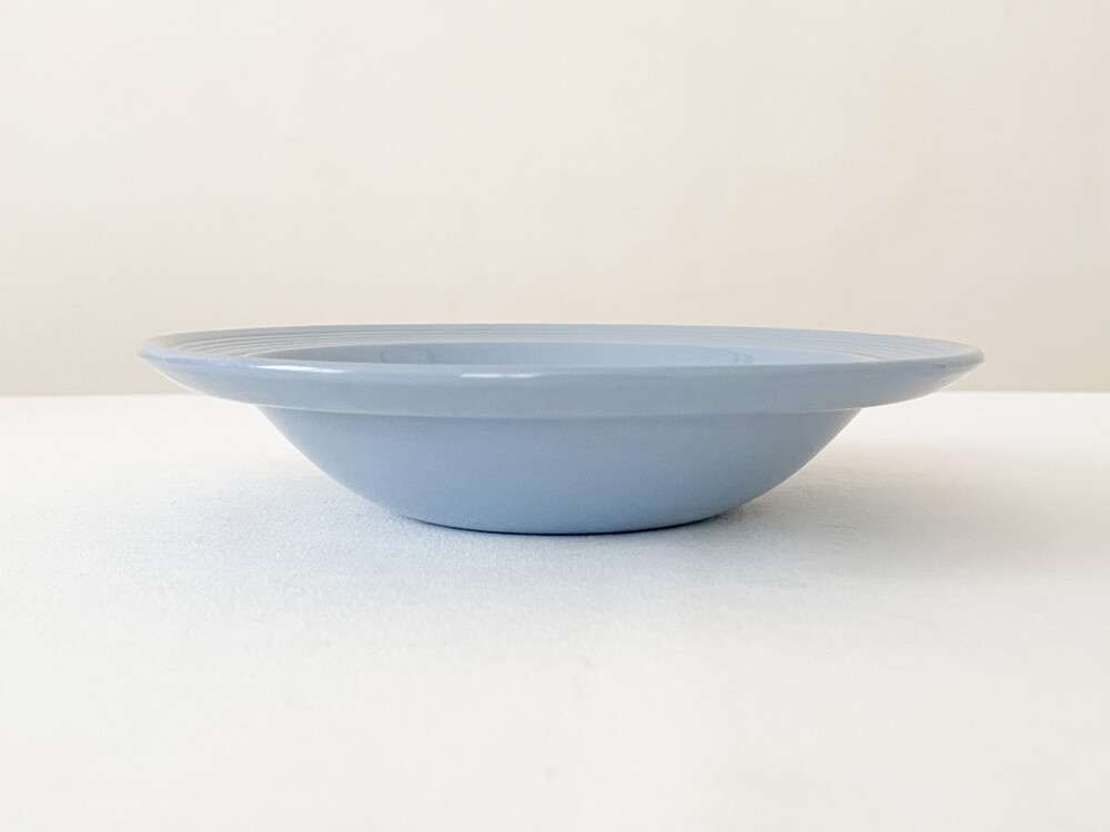 1940년대에 제작된 우즈웨어의 디저트보울 입니다. 우즈웨어는 1865년부터 잉글랜드의 버슬렘지역에서 본차이나와 포슬린을 만들었던- 우드앤손에서 시작된 본차이나 브랜드입니다. 우드앤손은 시간의 변화와 그에따른 트랜드의 흐름에 맞추어진 새로운 시리즈가 만들어질 때마다 브랜드의 이름에 조금씩 변화를 주었습니다. 소개해드리는 제품은는 우드앤손이 색감과 면face의 표현에 중점을 두었던 1940년대 중반의 것으로, 적당한 묵직함을 가진 본차이나를 소재로 합니다. 부드러운 동그라미들의 레이어가 보여지는 보울은, 우드앤손이 1900년대 초반동안 주된 모티브를 얻었던 아르데코의 영향을 받은 모습을 보여줍니다. 전체에 고르게 보여지는 차분하고 우아한 푸른색이 아름다우며, 가장자리는- 완만한 실루엣으로 위를 향해 펼쳐져 가지런한 음각의 줄무늬들이 장식되어 있습니다. 우아하고 단정한 분위기를 간직한 제품입니다. 아이스크림이나 과일을 담아내거나, 정성스런 시간을 담아 만든 따뜻한 수프를 위한 그릇으로 사용하기에 잘 어울립니다.