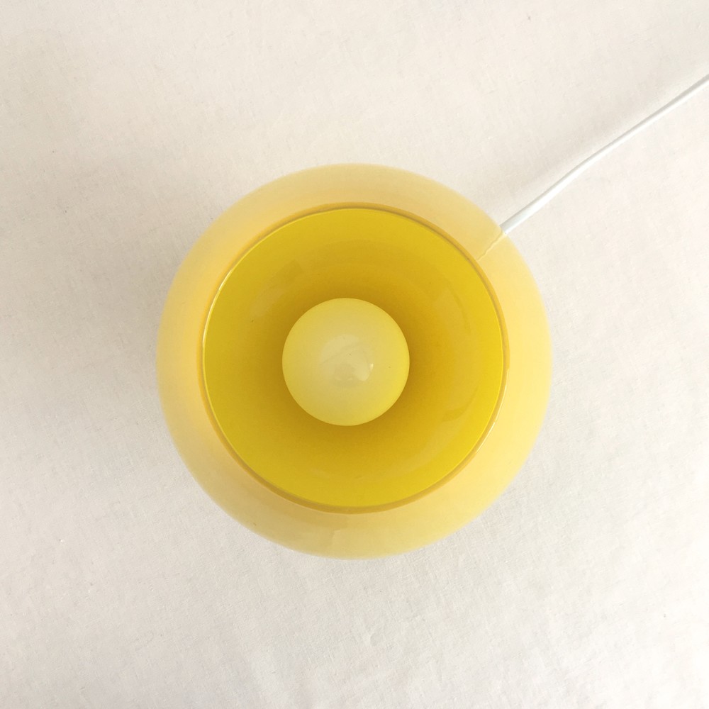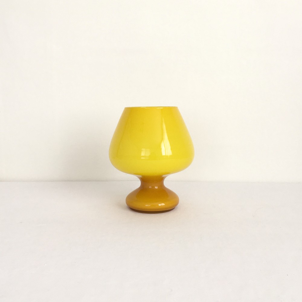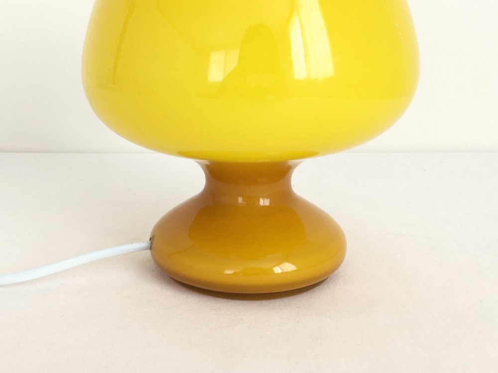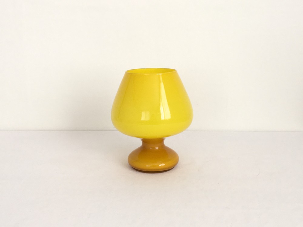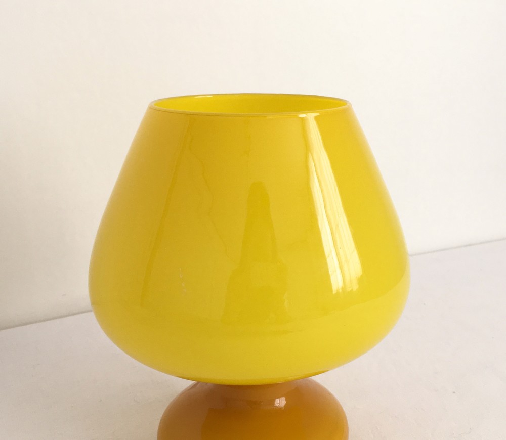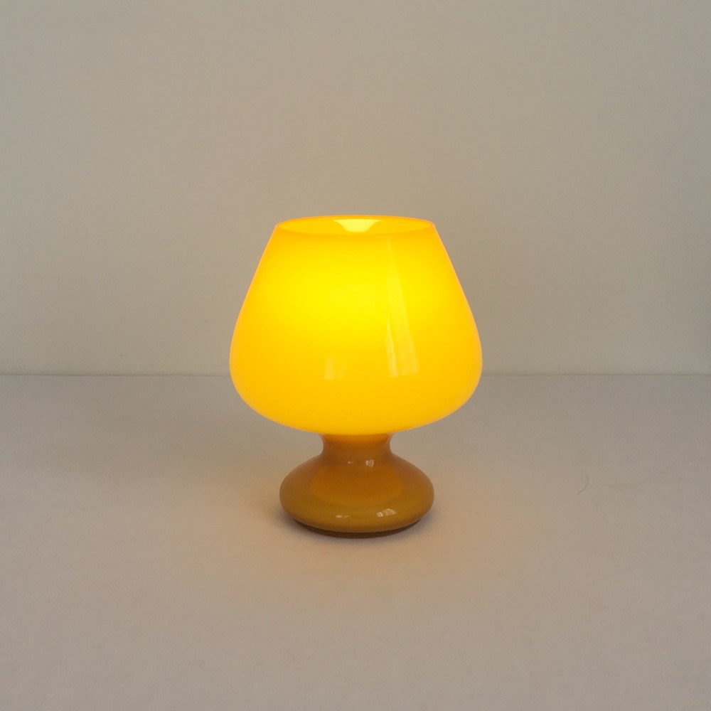 1940년대 후반 영국에서 제작된것으로 전해지는 빈티지 테이블램프입니다. 핸드블로운 기법으로 만들어진 램프는, 셰이드와 베이스의 구분이 없이 전체가 하나의 선으로 연결된 형태를 가지고있습니다 . 전체를 이루는 안정적인 질감의 묵직한 유리는 차분함과 화사함을 함께 전해주는 빛나는 노란색을 가지고 있으며, 램프의 베이스에서부터 셰이드의 가장자리까지 이어지는 선의 연결을 따라 펼쳐지는 아름다운 그라데이션을 살펴볼 수 있습니다. 국내에서 안전하게 사용할 수 있도록 인증이 된 플러그-전선-스위치-소켓으로 수리가 완료되었으며, 램프가가진 색감과 잘 어울리는 밝고 따뜻한 계열의 전구가 사용된제품입니다. 침대나 소파 곁에두는- 차분한 시간을위한 잔잔한 조명으로 잘 어울리며, 단정한 그릇들이 놓인 테이블위를 빛내주는 조명으로 사용하기에도 알맞습니다.