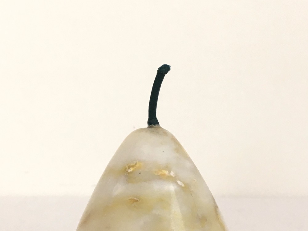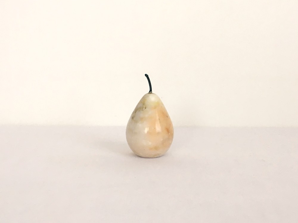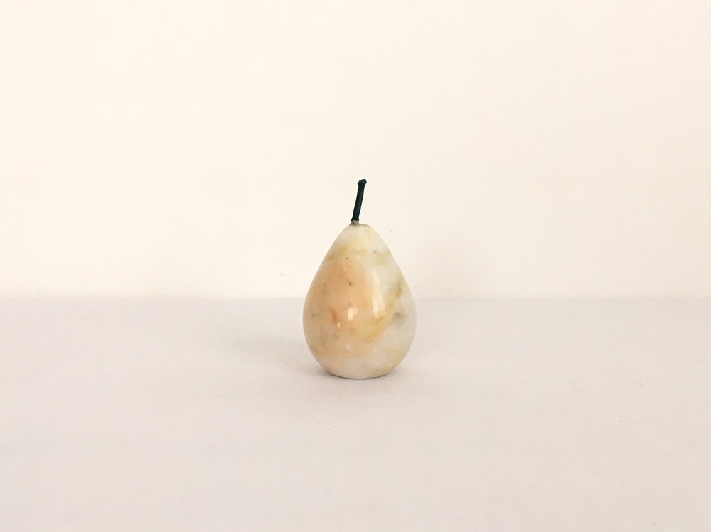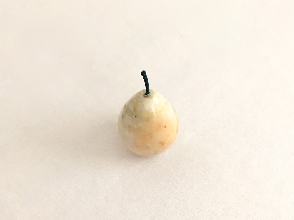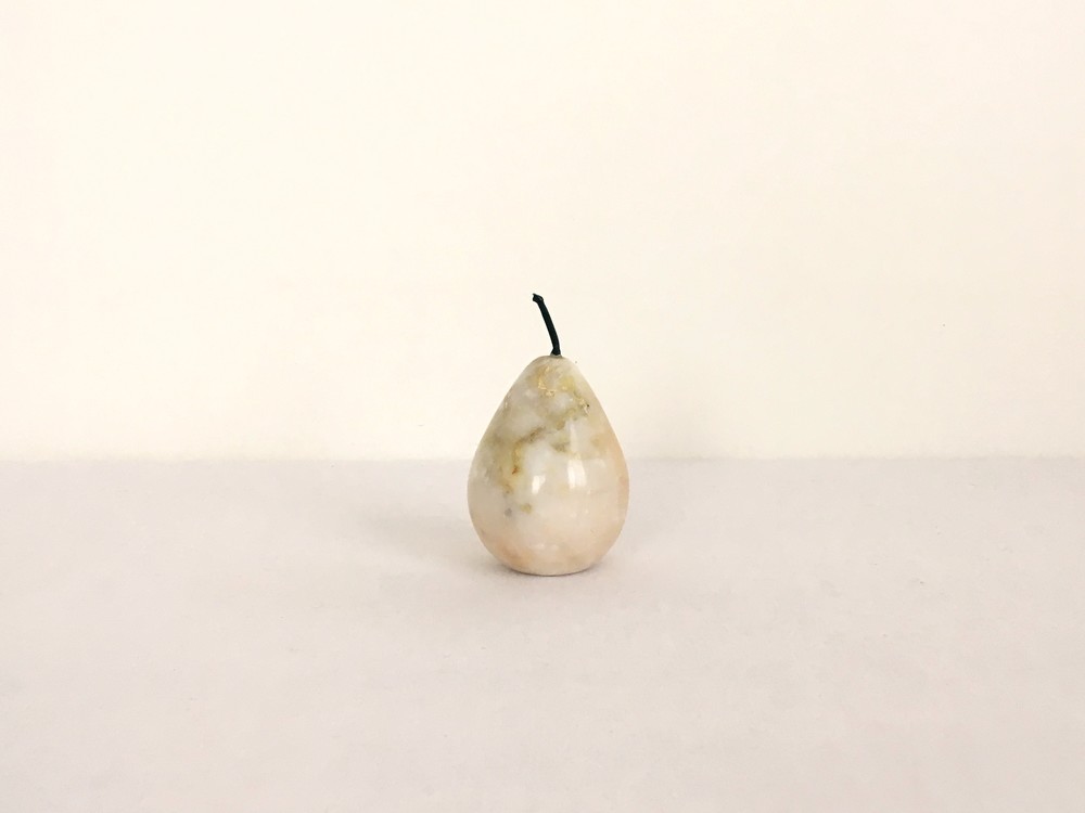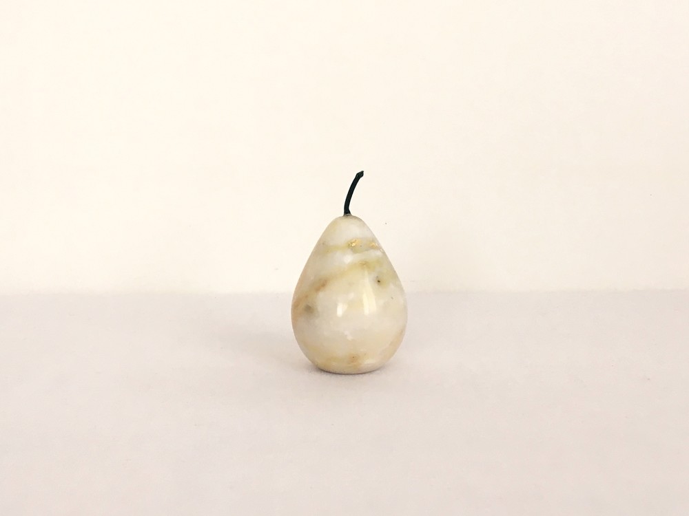 1950년대 영국에서 제작된 빈티지 문진입니다. 아이보리를 바탕으로, 살구색과 금빛이 도는 엷은 올리브색, 드문드문 보이는 하얀색과 크림색으로 연결되는- 화사하고 따스한 빛들이 펼쳐진 대리석을 소재로 만들어졌습니다. 물방울 모양으로 다듬어진 서양배열매는 전체를 감싸고 있는 부드러운 공기의 흐름이 보여지며, 열매의 윗 부분에는 전체의 흐름과 잘어울리는- 차분하지만 선명한 짙은초록의 러버소재를 사용한 스템이 연결되어있습니다. 자연스럽게 펼쳐진 대리석의 무늬들과 매끄러운표면, 완벽하진 않지만 바라보기에 편안한 대칭으로 만들어진 단정한 모양이 전해주는 묵묵하고 아름다운 분위기를 가지고있습니다. 책상위의 종이들이나 식탁위에서 사용하는 테이블클로스를 고정시켜두거나 읽던 책의 페이지를 표시해두는 본래의 용도로 사용하며 아주 일상적인 공간들에 특별함을 더해주는 역할을하기에 적당하고, 어떠한 공간의 분위기를 만들어주는 오브제로 두기에도 잘 어울립니다.