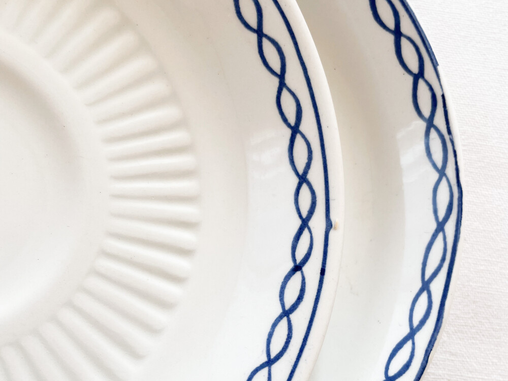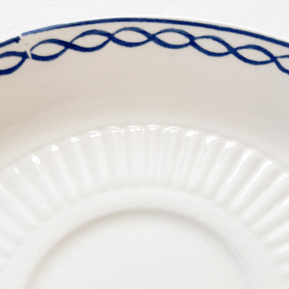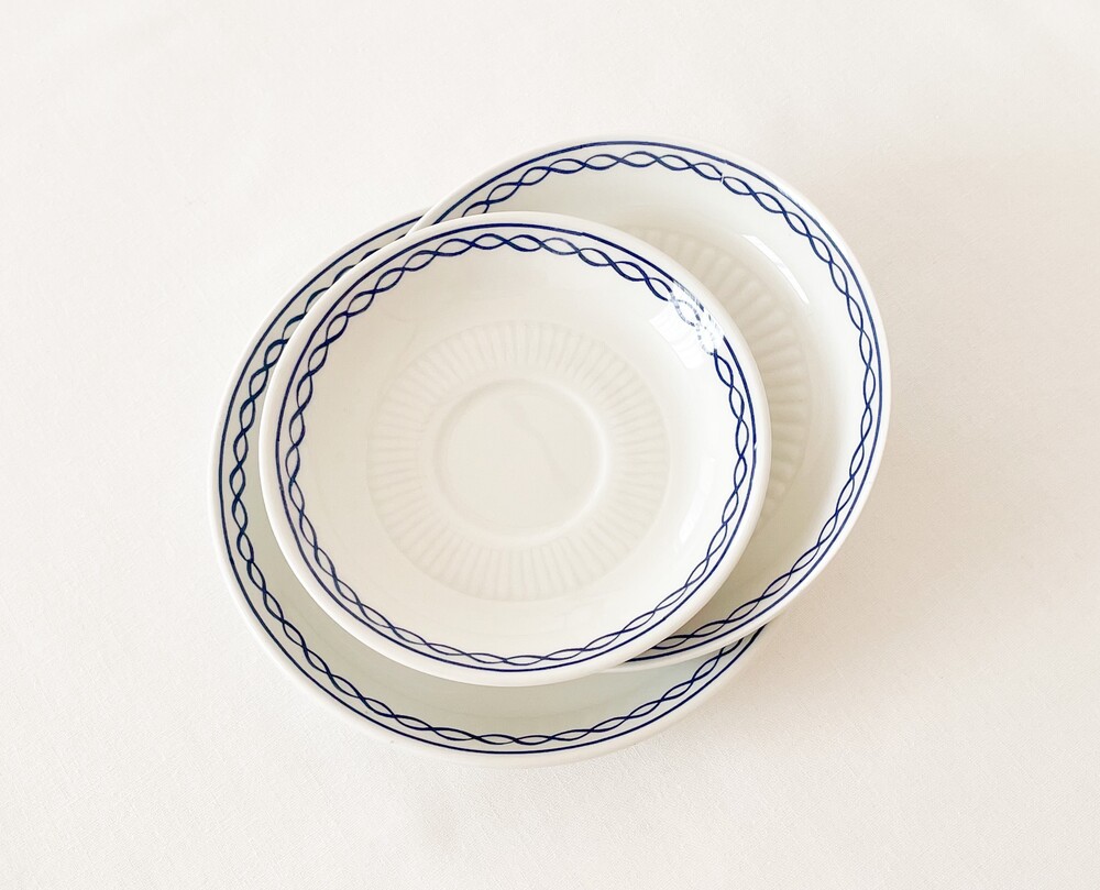 아담스는 1446년부터 아담형제의 집 정원에서 만들어지기 시작한, 영국의 테이블웨어 브랜드입니다. 이후 영국 도자기의 중심지라고 불려지는 스토크 온 트렌트에 스튜디오를 갖추며, 재료의 연구와 좋은 디자인을 찾아내는 본격적인 활동을 만들어 나갔습니다. 신고전주의에서 영향을 받은 철학적인 배경과 함께 고대의 기하학적인 꽃무늬에서 영감을 받은 패턴을 만들고 기록하며, 섬세함이 기반이된- 영국적 화려함과 무게감이 담긴 디자인을 보여주었습니다. 또한 아이언웨어(포슬린만큼 얇고 섬세한 표현이 가능한 아주 튼튼한 제질의 도자기)에 대한 기술력에 대해서도 수세기을 거친 발전을 지속하며 명성을 쌓습니다. 소개해드리는 제품은 1950년대 중반- 1960년대 초중반 까지의 기간동안 만들어진 잔받침 입니다. 유백색의 아이언웨어를 소재로 하며, 오목하고 동그란 모양을 가지고 있습니다. 섬세한 율동감이 실린 펼쳐지고 정돈되는 아름다운 실루엣이 보여지며- 전체의 화사한 분위기와 잘 어울리는 양각의 빗살무늬와 고전적인 파랑의 꼬임무늬가 나란히 장식되어있습니다. 아담스가 추구했던, 고전의 무게로 부터 시작 된 우아한 아름다움이 깃들어있는 제품입니다. 단정한 모습의 찻잔이나 맑은 유리잔과 겹쳐내는 잔받침으로, 디저트를 담아내는 그릇으로 사용하기에 알맞으며- 초를 켜거나 작은 장신구를 보관하는 트레이로 놓아두기에도 잘 어울립니다.
