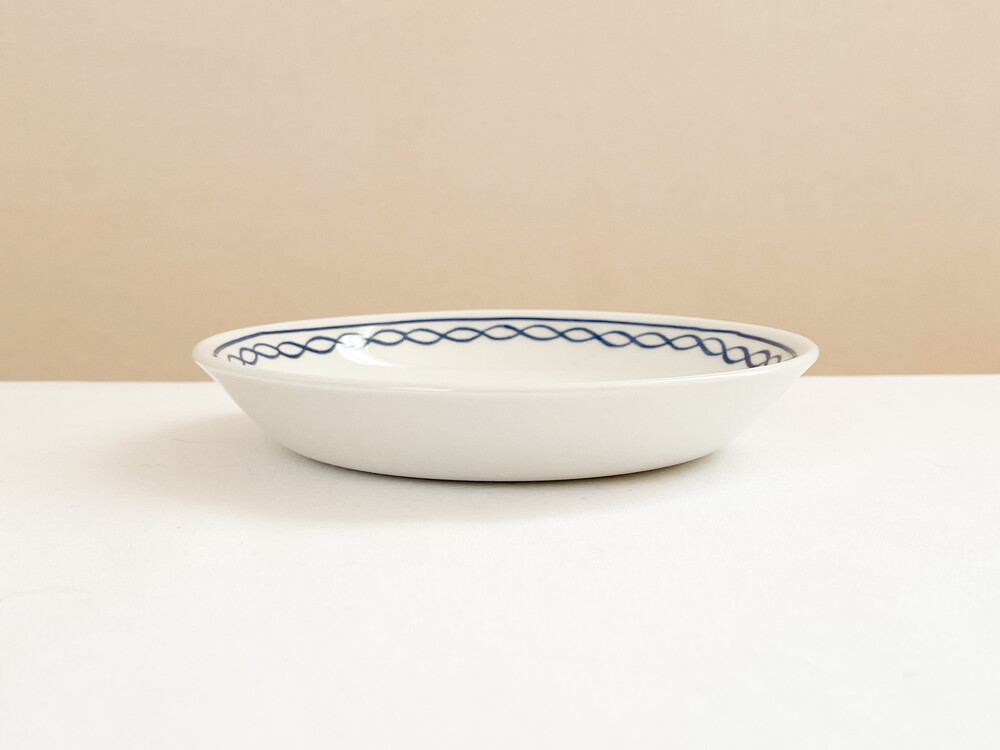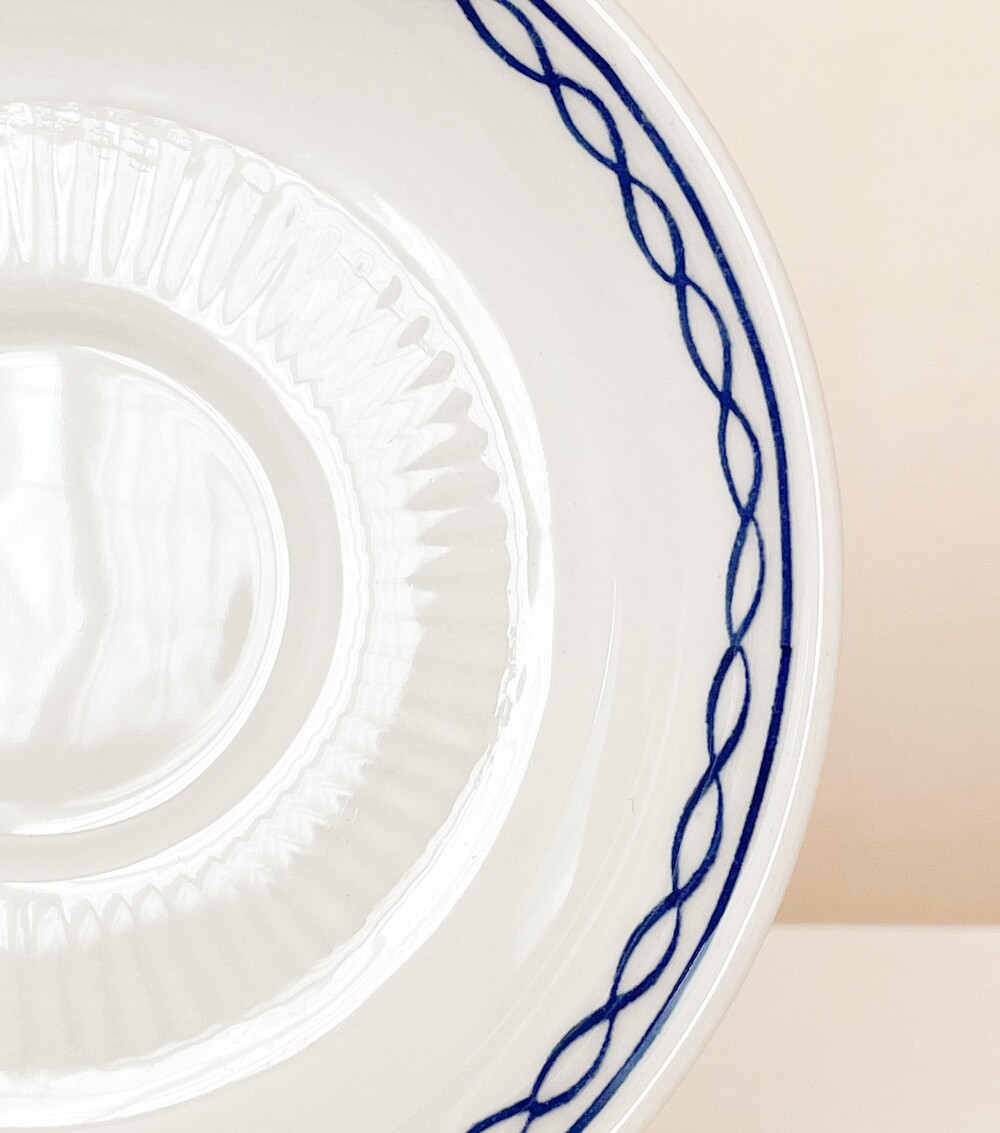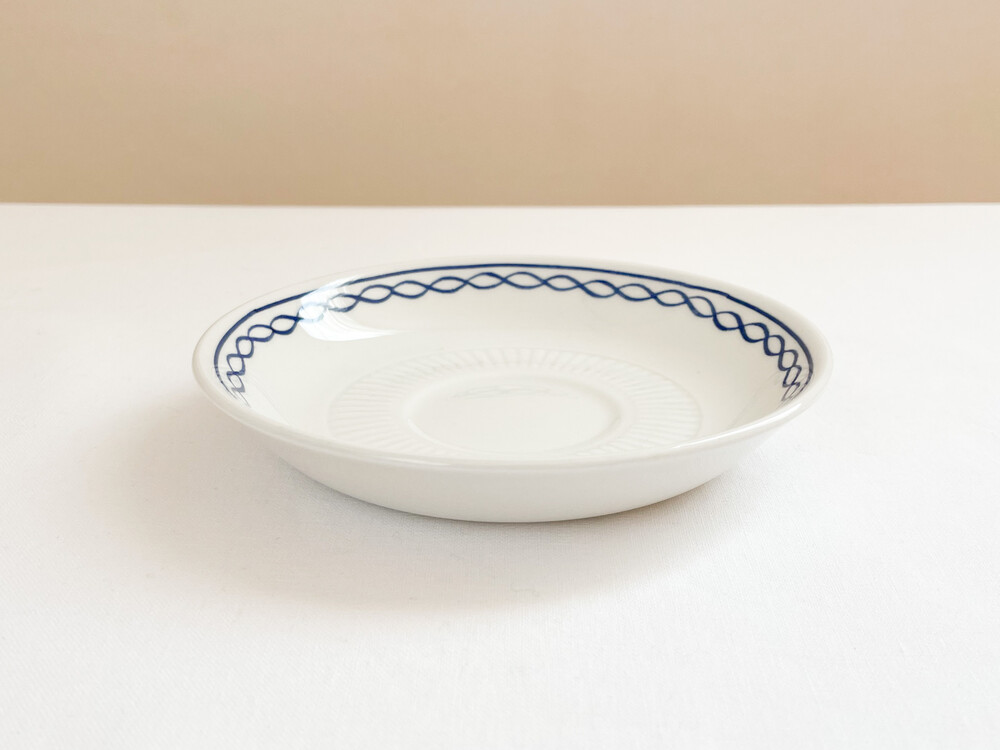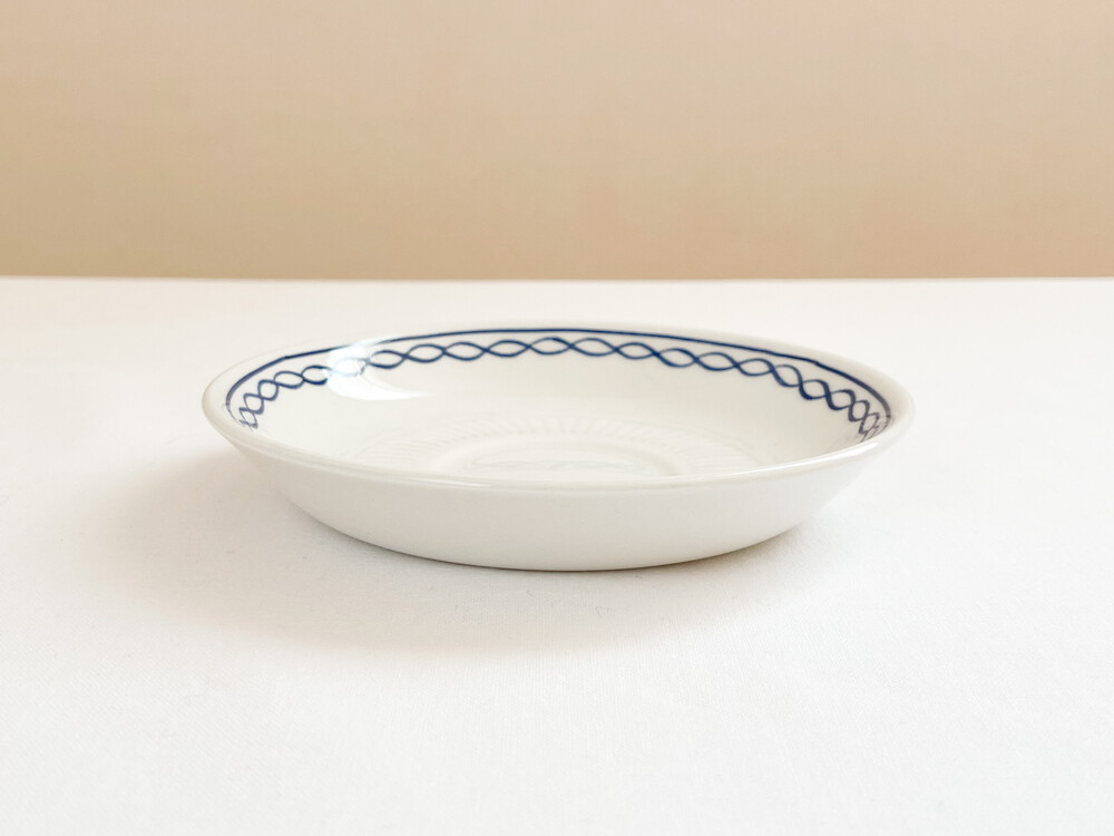 아담스는 1446년부터 아담형제의 집 정원에서 만들어지기 시작한, 영국의 테이블웨어 브랜드입니다. 이후 영국 도자기의 중심지라고 불려지는 스토크 온 트렌트에 스튜디오를 갖추며, 재료의 연구와 좋은 디자인을 찾아내는 본격적인 활동을 만들어 나갔습니다. 신고전주의에서 영향을 받은 철학적인 배경과 함께 고대의 기하학적인 꽃무늬에서 영감을 받은 패턴을 만들고 기록하며, 섬세함이 기반이된- 영국적 화려함과 무게감이 담긴 디자인을 보여주었습니다. 또한 아이언웨어(포슬린만큼 얇고 섬세한 표현이 가능한 아주 튼튼한 제질의 도자기)에 대한 기술력에 대해서도 수세기을 거친 발전을 지속하며 명성을 쌓습니다. 소개해드리는 제품은 1950년대 중반- 1960년대 초중반 까지의 기간동안 만들어진 잔받침 입니다. 유백색의 아이언웨어를 소재로 하며, 오목하고 동그란 모양을 가지고 있습니다. 섬세한 율동감이 실린 펼쳐지고 정돈되는 아름다운 실루엣이 보여지며- 전체의 화사한 분위기와 잘 어울리는 양각의 빗살무늬와 고전적인 파랑의 꼬임무늬가 나란히 장식되어있습니다. 아담스가 추구했던, 고전의 무게로 부터 시작 된 우아한 아름다움이 깃들어있는 제품입니다. 단정한 모습의 찻잔이나 맑은 유리잔과 겹쳐내는 잔받침으로, 디저트를 담아내는 그릇으로 사용하기에 알맞으며- 초를 켜거나 작은 장신구를 보관하는 트레이로 놓아두기에도 잘 어울립니다.
