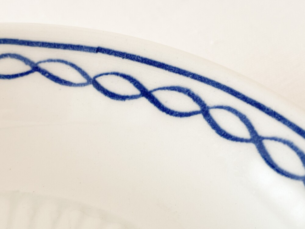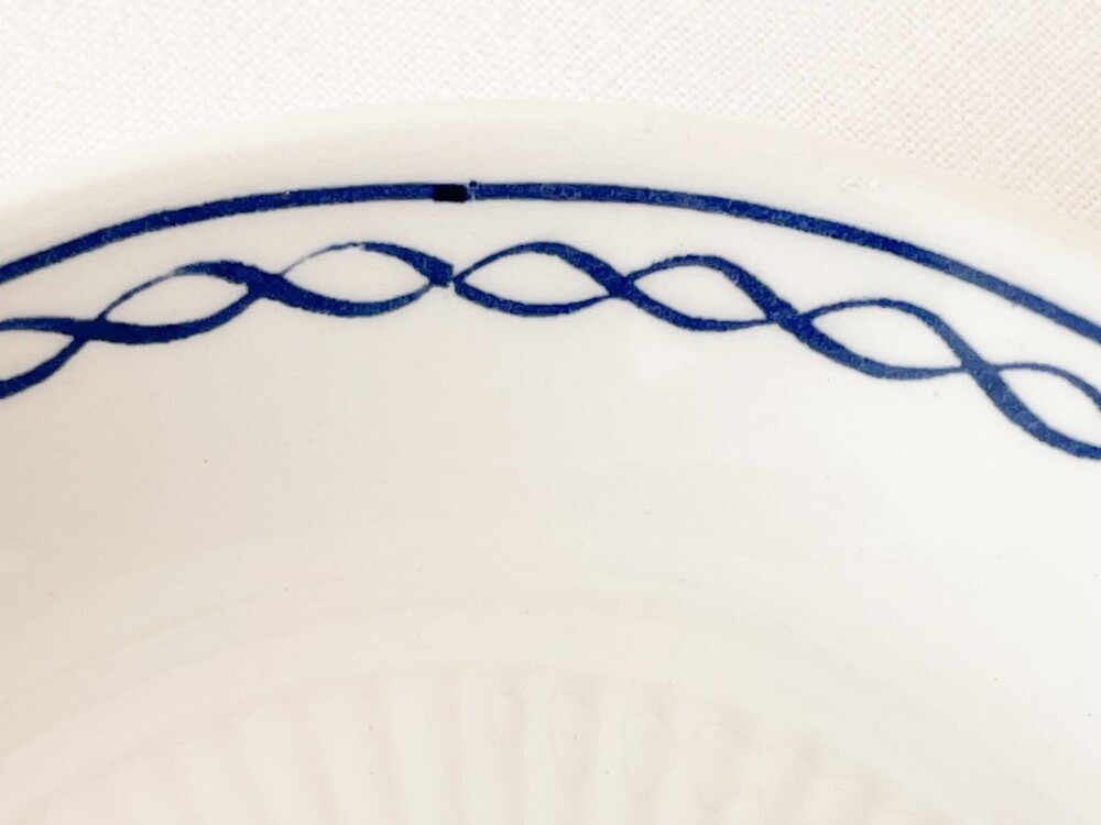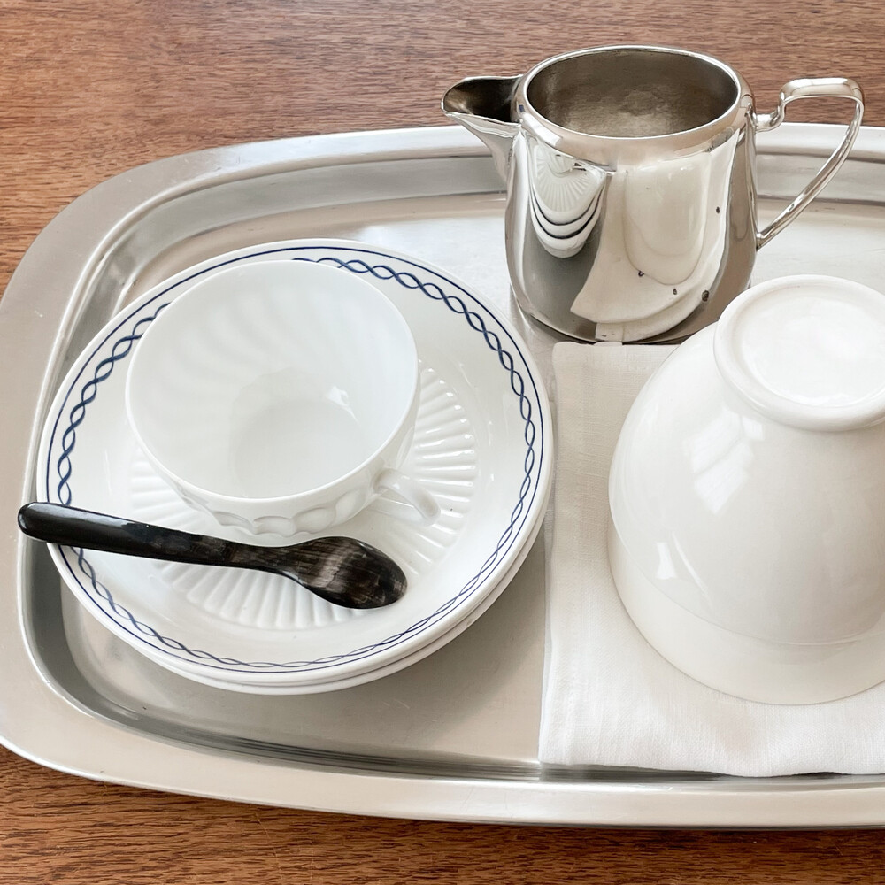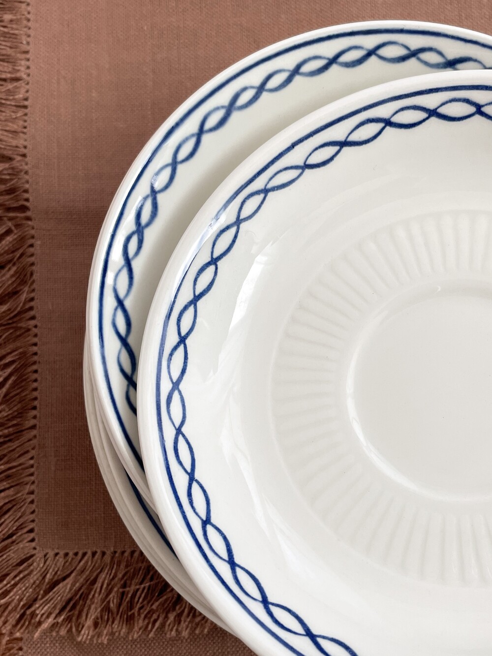 아담스는 1446년부터 아담형제의 집 정원에서 만들어지기 시작한, 영국의 테이블웨어 브랜드입니다. 이후 영국 도자기의 중심지라고 불려지는 스토크 온 트렌트에 스튜디오를 갖추며, 재료의 연구와 좋은 디자인을 찾아내는 본격적인 활동을 만들어 나갔습니다. 신고전주의에서 영향을 받은 철학적인 배경과 함께 고대의 기하학적인 꽃무늬에서 영감을 받은 패턴을 만들고 기록하며, 섬세함이 기반이된- 영국적 화려함과 무게감이 담긴 디자인을 보여주었습니다. 또한 아이언웨어(포슬린만큼 얇고 섬세한 표현이 가능한 아주 튼튼한 제질의 도자기)에 대한 기술력에 대해서도 수세기을 거친 발전을 지속하며 명성을 쌓습니다. 소개해드리는 제품은 1950년대 중반- 1960년대 초중반 까지의 기간동안 만들어진 잔받침 입니다. 유백색의 아이언웨어를 소재로 하며, 오목하고 동그란 모양을 가지고 있습니다. 섬세한 율동감이 실린 펼쳐지고 정돈되는 아름다운 실루엣이 보여지며- 전체의 화사한 분위기와 잘 어울리는 양각의 빗살무늬와 고전적인 파랑의 꼬임무늬가 나란히 장식되어있습니다. 아담스가 추구했던, 고전의 무게로 부터 시작 된 우아한 아름다움이 깃들어있는 제품입니다. 단정한 모습의 찻잔이나 맑은 유리잔과 겹쳐내는 잔받침으로, 디저트를 담아내는 그릇으로 사용하기에 알맞으며- 초를 켜거나 작은 장신구를 보관하는 트레이로 놓아두기에도 잘 어울립니다.