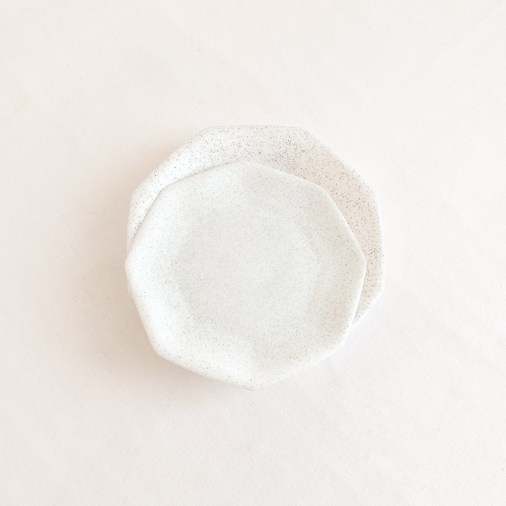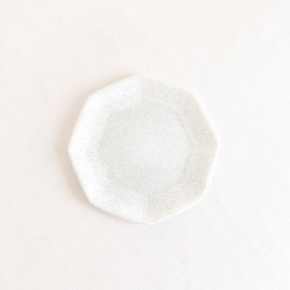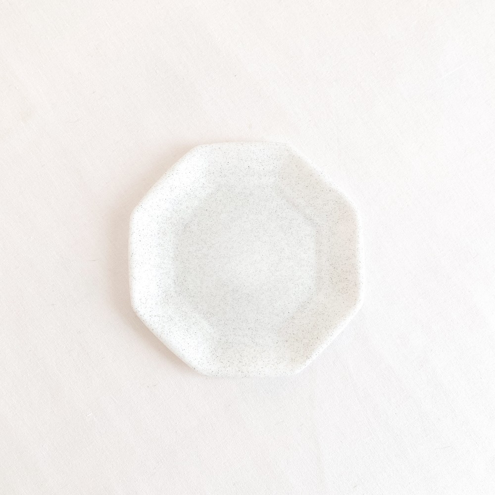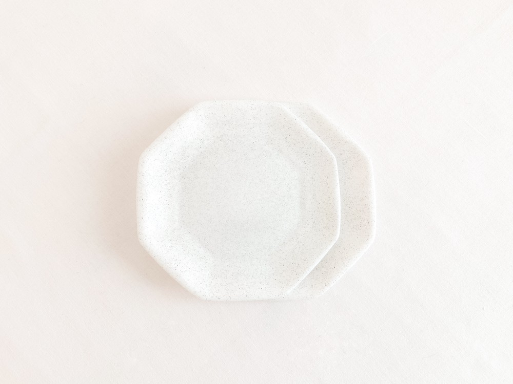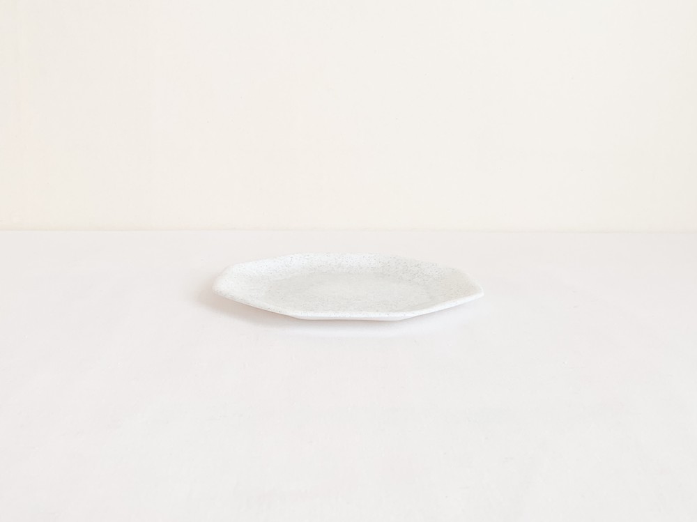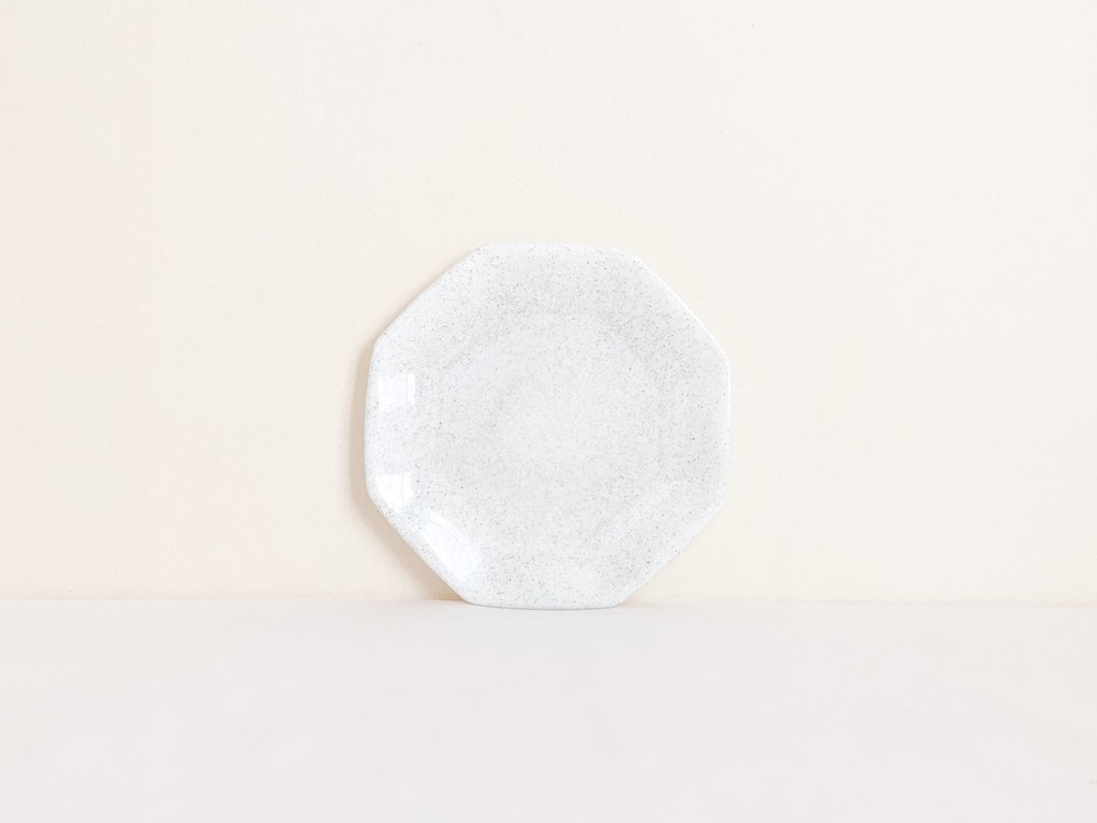 아코팔은 1825년 프랑스 북부의 아르크지방에서 시작된 브랜드입니다. 각 공정의 마스터들이 모여 샴페인잔이나 와인잔같은 스템웨어를 만들며 명성을 쌓아간 아코팔은 아르크 인터네셔널로 브랜드를 확장하며 현재까지도 인기가 있는 워킹글라스를 비롯한 루미낙, 알코록등 적당한 꾸밈을 가진 실용적인 글라스웨어들 제작하였습니다. 소개해드리는 접시는 1950년대의 것으로, 투명도가 거의없는- 아코팔 특유의 뽀얀 하얀색의 강화유리를 소재로합니다. 평평한 다각형으로 펼펴진 접시는- 둥글게 연결된 섬세한 분할의 면들이 모여 형태를 이루고, 안쪽에 짙은회색의 작은 스파클링무늬들이 입혀져 있습니다. 소재와 모양, 색감과 무늬가 가진- 서로다른 온도들의 조화로움이 아름답습니다. 아이스크림 한스푼을 얹은 파이나 잼토스트를 담아내는 그릇으로 잘어울리며, 식탁위의 클로스나 커틀러리를 정돈하는 트레이로 사용하기에도 알맞습니다.