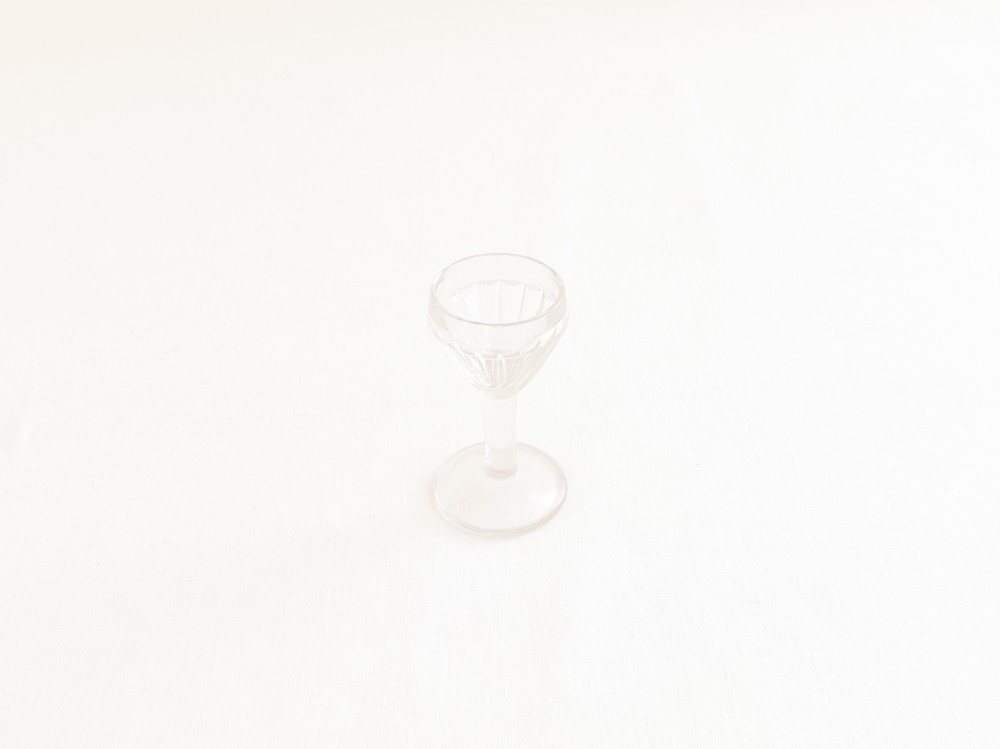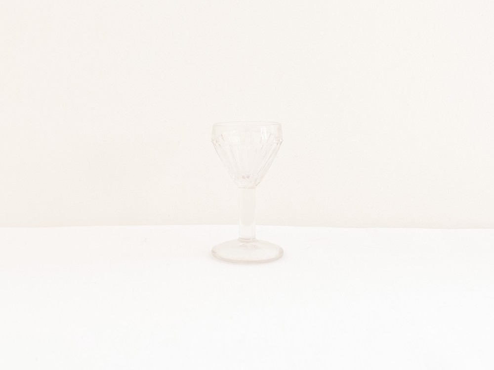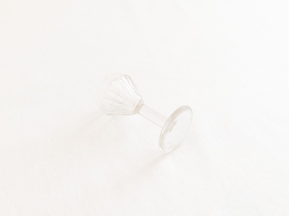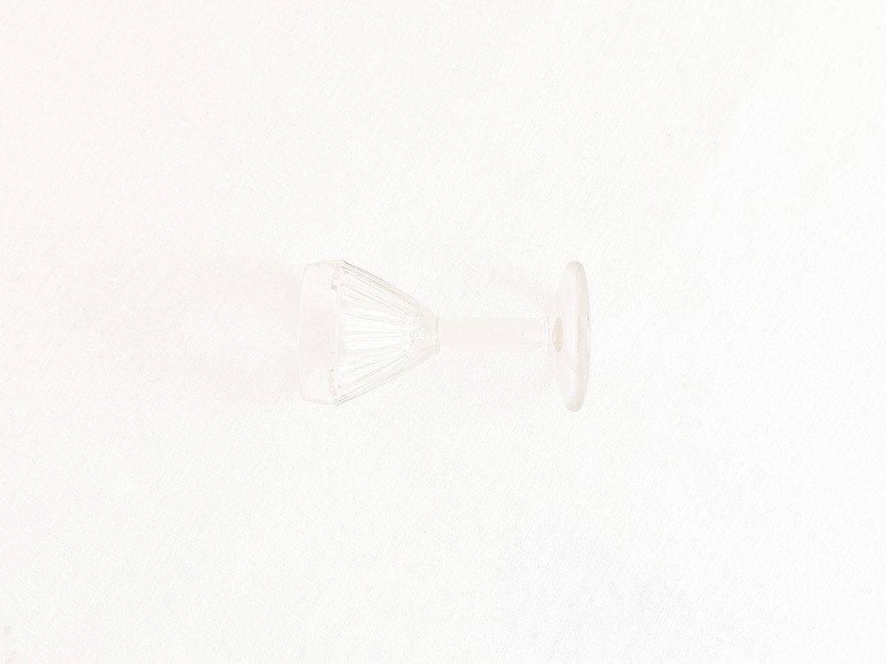알코록은 1825년, 프랑스 북부지역에서 유리제품들을 제작했던 Arc를 전신으로 하는 브랜드로- 편하게 사용할 수 있는 내구성, 유리가 가지고 있는 고유의 미감, 실용적이며 제너럴한 모습을 가진 유리소재의 테이블웨어를 만들었습니다. 소개해드리는 제품은 1950년대 초반에 만들어진 작은 술잔입니다. 투명하고 도톰한 강화유리를 소재로한 유리컵은 고깔모양의 보울, 기다란 비율의 반듯한 스템, 평평한 동그라미의 베이스로 구성되었습니다. 셰리나 독주를 마시는 숏글라스의 정형적인 모습과 실용적인 소재가 만들어내는 적당한 균형을 살펴볼 수 있습니다. 보울에는 꽃잎을 닮은 가지런한 장식들이 새겨져 유리의 반짝임을 더욱 돋보이게 합니다.
