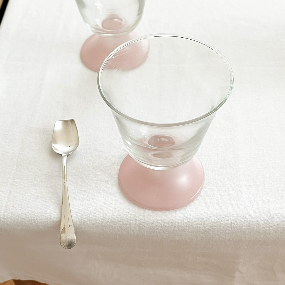 1950년대의 빈티지 선디글라스입니다. 말갛고 매끄러운 투명함이 담긴 유리를 소재로 만들어진 제품으로, 유연한 선들로 이루어진 매끄러운 실루엣으로 완성 되었습니다. 벨모양의 보울과 낮고 둥근 스템-베이스로 구성되어있으며, 맑은 빛이 스며있는 투명한 유리와 보송한 질감의 밝은 분홍빛이 아름답게 어울립니다. 묵직한 무게가 전해지는 안정감있는 두께의 유리로 만들어져, 매일의 식탁에서 편하게 사용하기에 알맞습니다. 주스나 와인을 위한 잔으로, 휴일의 아이스크림을 위한 컵으로 잘 어울립니다.