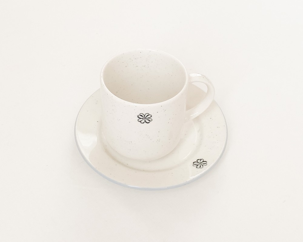 1950년대 영국에서 만들어진 빈티지 스탬프를 모티브로 제작된 찻잔 입니다. 여러용도로 편하게 사용하기에 알맞은 스톤웨어를 소재로 만들어진 제품으로, 몰드를 사용해 모양을 만들어내고, 여러번에 걸쳐 결을 다듬어낸 후 무늬와 유약을 입혀 오랜시간 동안 구워내는 과정을 동해 완성이 됩니다. 제품이 만들어지는데에는, 프랑스 Anneyron지역의 순도높은(제작의 편리성을 위해 섞이게 되는 흙과 물이외의 물질이 섞이지 않음을 뜻합니다) 흙과 유약 그리고 화학제품이 첨가되지 않은 안료가 사용됩니다. 둥글고 단정한 선으로 다듬어진 컵은 넉넉하고 둥근 실루엣과 여유있는 손잡이로 모양을 이루고 있습니다. 컵의 한켠에는 바살트를 재료로한 따스한 검정의 클로버 무늬가 새겨졌으며, 겉면에는 잔잔한 스페클 무늬가 보여집니다. 오랜시간이 담긴 스탬프 특유의 자연스런 결, 담담한 실루엣과 색들로부터 여운이 전해집니다. 매일의 식사시간, 그리고 정성을 담아 준비한 특별한 테이블을 위한 다정한 그릇으로 사용하기에 잘 어울립니다.