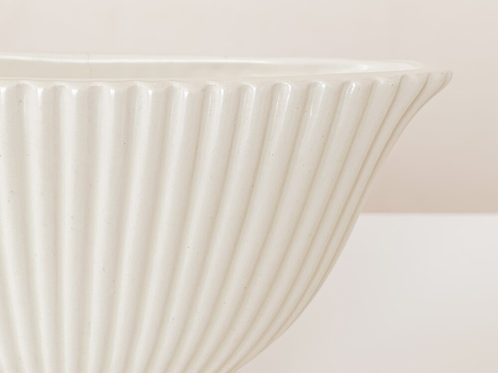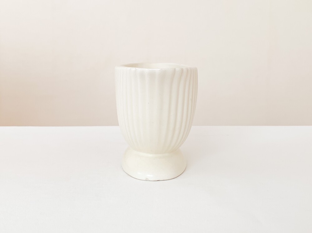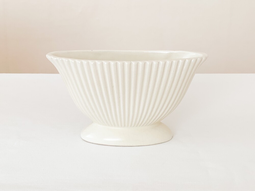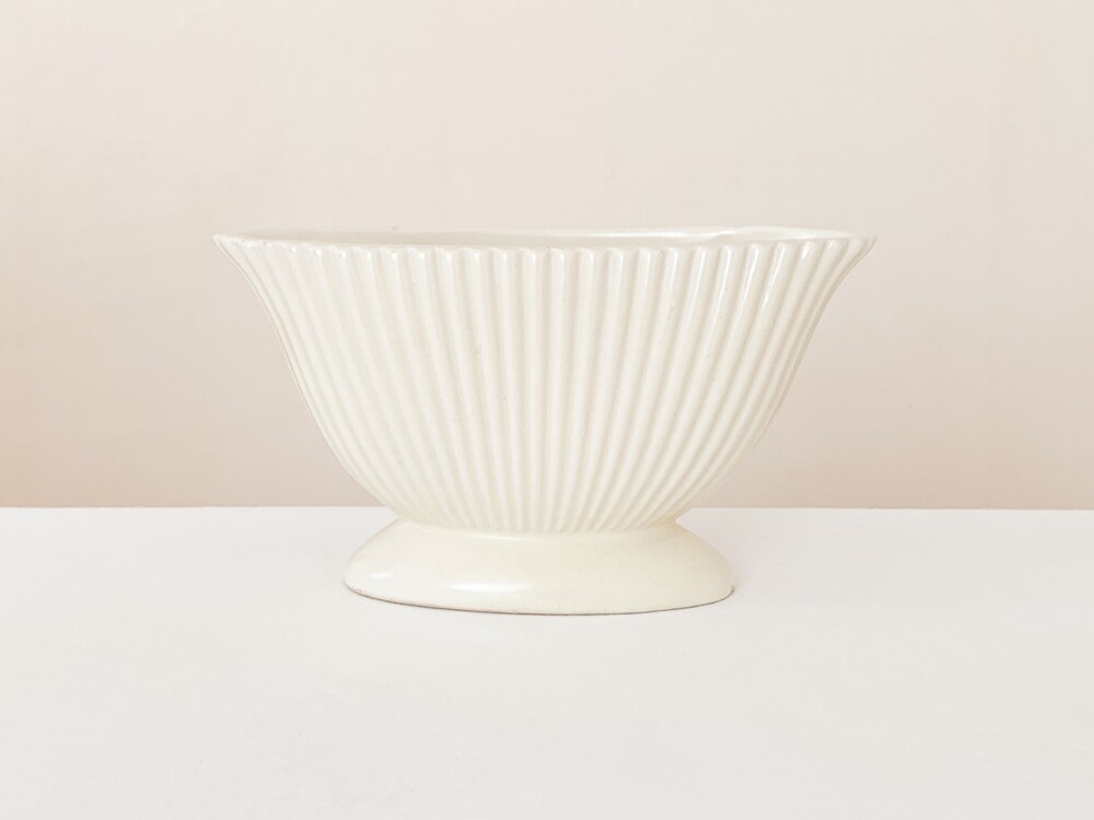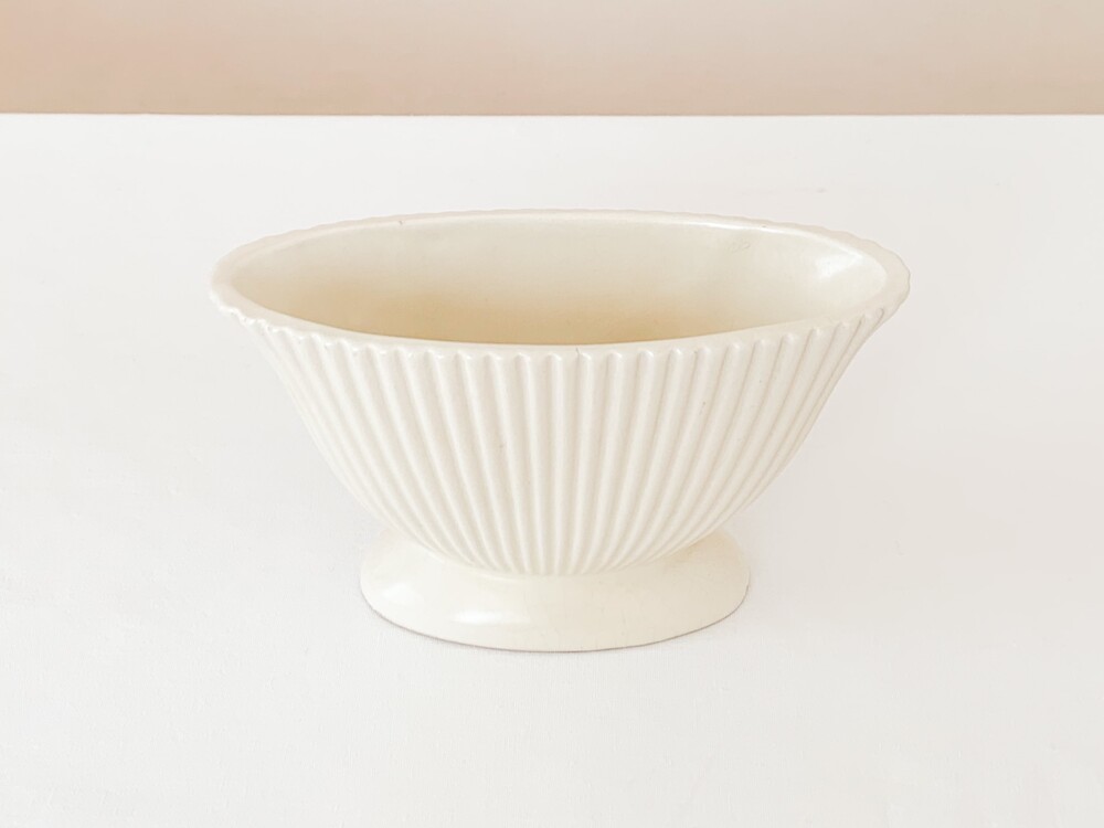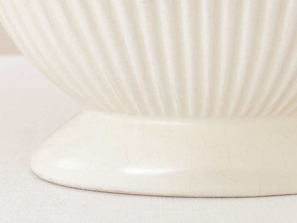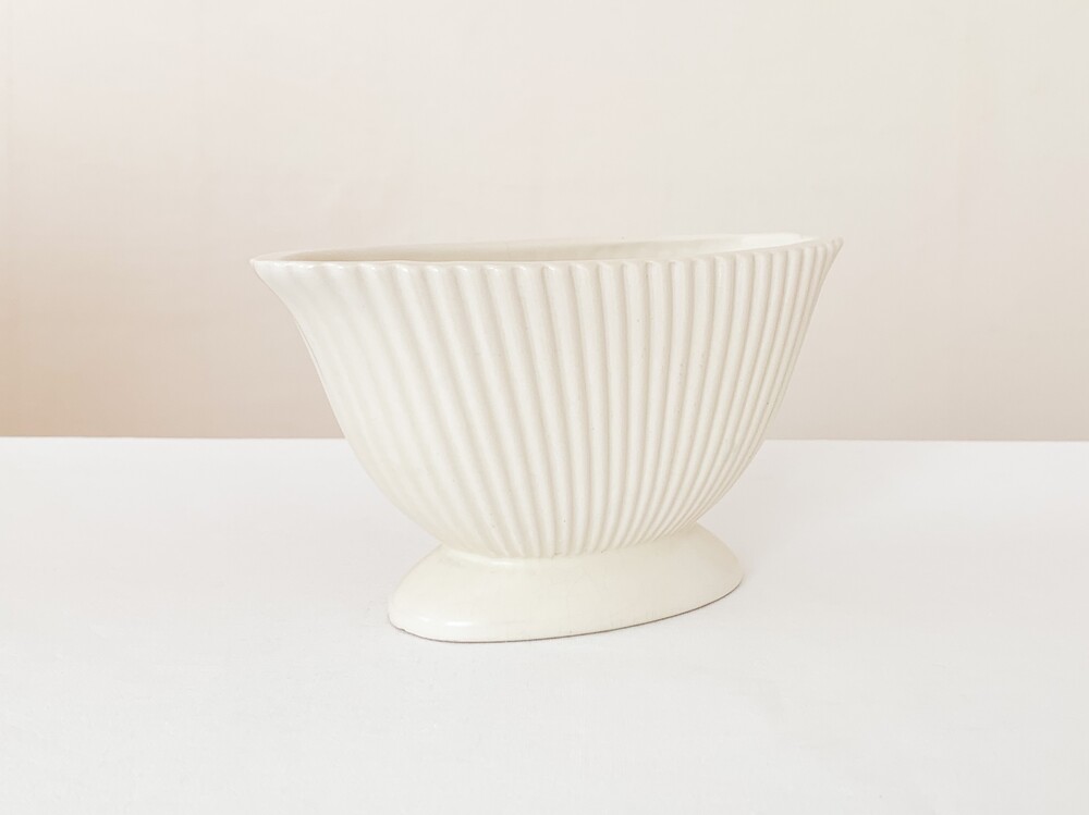 1950년대에 만들어진 다트머스 포터리의 빈티지 화병입니다. 다트머스 포터리는, 1947년 잉글랜드 데본지역에서 스튜디오 규모의 기념품 가게로 시작 된 브랜드입니다. 다트머스는 데본지역의 항구 이름으로, 이름과 장소 그리고 기념품가게라는 정체성을 잘 보여주는- 바다와 항구에서 관찰 할 수 있는 형태와 색을 사용해 도자기들을 만들었습니다. 세심한 관찰로 얻어낸 다채로운 색과 섬세하고 독특한 형태, 영감을 얻은 장소로 부터 전해지는 활기차고 편안한 감수성의 도자기들은- 천천히 명성을 높혀가며 단순히 기념품 가게의 위치를 넘고, 어떤 지역의 풍경을 담아내는 도구를 넘어 특별한 모습의 수집품과 아름답고 사용하기에 편한 테이블웨어들로 큰 인기를 가지게 됩니다. 소개해드리는 제품은 조가비를 모티브로 만들어진 것으로, 단단한 내구성을 가진 스톤웨어를 소재로합니다. 오랜 시간이 만들어낸 온화한 밝은 빛이 담겨있는- 따뜻한 아이보리가 아름다우며, 가지런한 줄무늬가 담담하고 우아한 터치로 겉면에 장식되어 있습니다. 기다란 타원형의 바디는 책장이나 좁은 선반에 놓아두기에도 적당해, 취향과 용도에 맞는 다양한 모습으로의 사용이 가능합니다. 다트머스특유의 느긋하고 화사한 정서가 잘 보여지는 제품으로- 과일이나 초콜릿같은 간식을 담아두는 식탁위의 바스켓으로, 풍성한 실루엣을 가진 꽃 몇송이를 담아두는 화병으로 잘 어울립니다.