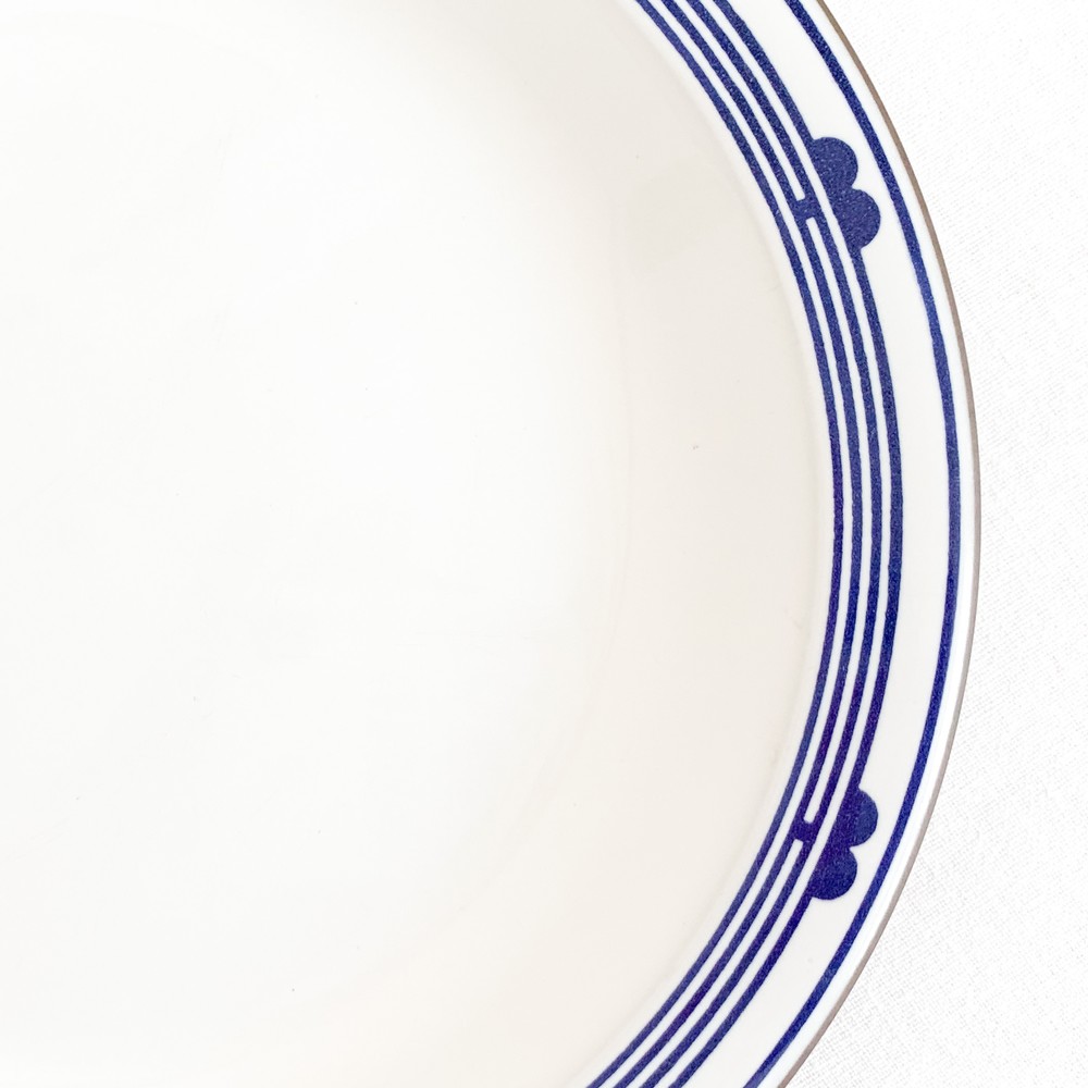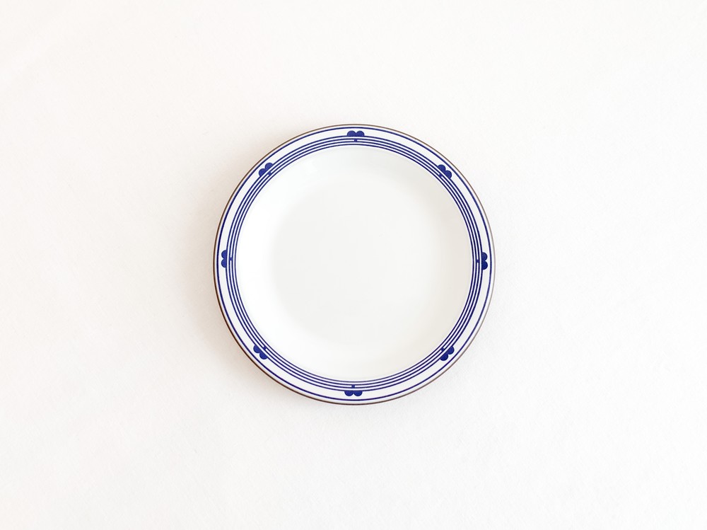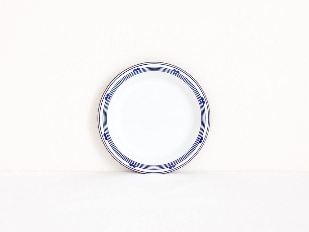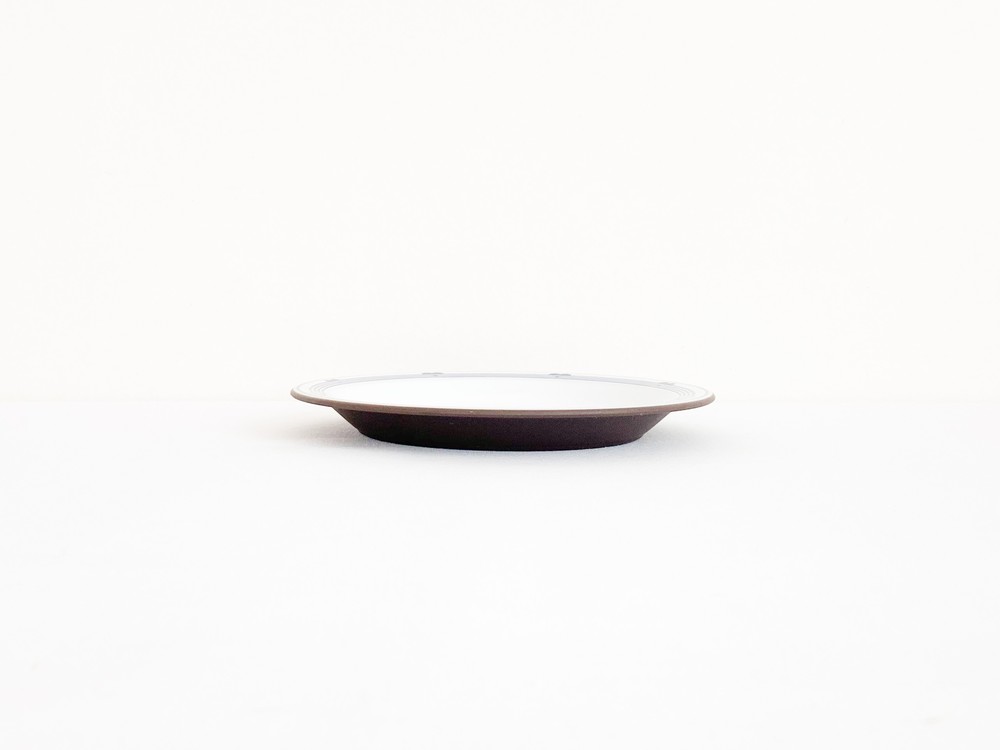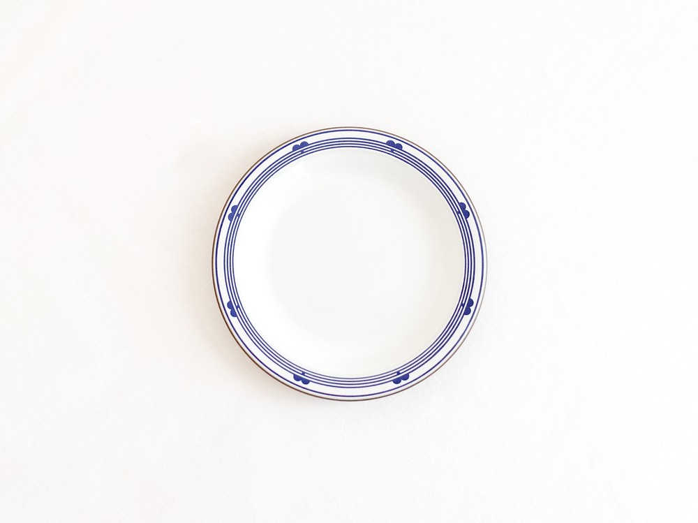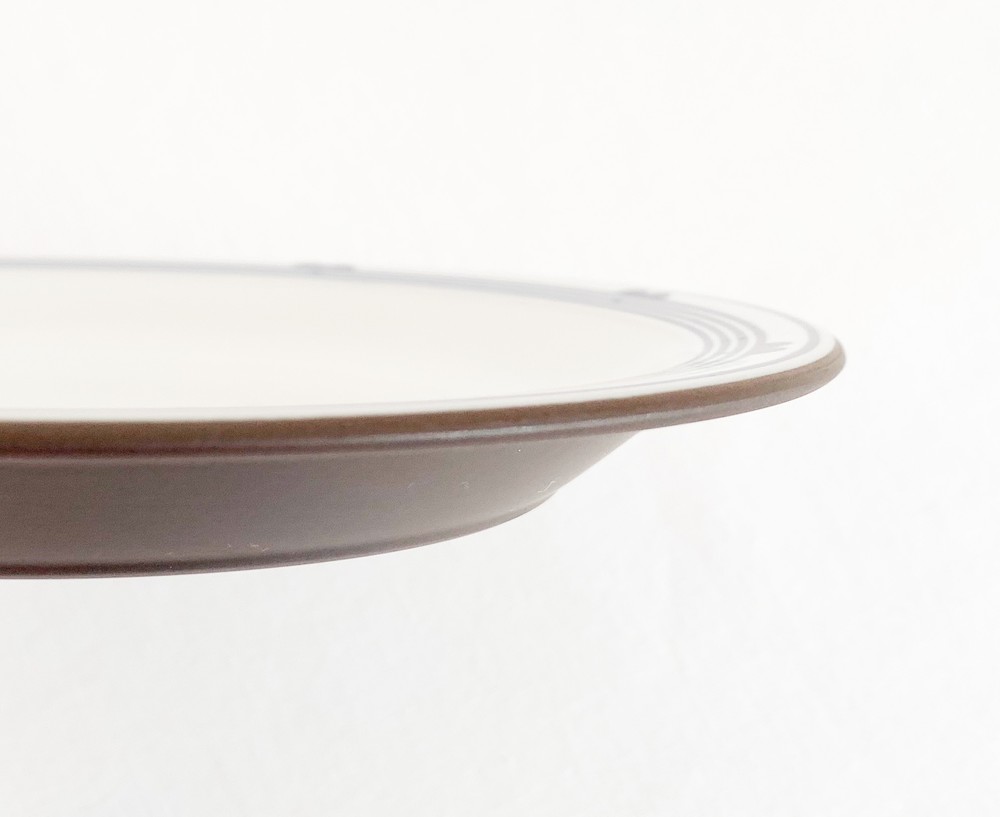 혼시의 빈티지 브레드플레이트입니다. 혼시는 1949년부터 잉글랜드 서쪽의 바닷가 마을 혼시에서, 해변의 기념품이 될만한 도자기인형이나 화병을 제작하던 하우스 브랜드 입니다. 좋은 재료, 좋은 디자인으로 유명세를 가지게되며 1950년부터 테이블웨어를 생산하기 시작했습니다. 매뉴팩쳐와 아트피스사이의 적당한 지점을 찾아보고자 했던 혼시는 예술대학 학생들을 디자이너로 영입하고, '현대적인 우아함' 그리고 '정원에서 보내는 차마시는 시간'을 모티브로한 세련된 제품들을 만들었습니다. 그에 걸맞는 멋진 테이블웨어들은 영국의 주요 박물관에서도 소장하고 있을 만큼 높은 가치가 유지되고 있습니다. 소개해드리는 접시는 1950년대 중반에 제작되었습니다. 적당한 묵직함의 스톤웨어를 소재로하며, 혼시 특유의 단정한 균형을 가진 선들이 보여집니다. 넓고 둥근 접시의 안쪽에는 매끄러운 광택의 새하얀 유약이 입혀져있으며, 바깥면에는 바탕이 되는 초콜렛색 스톤웨어가 보송한 질감으로 드러나있습니다. 단정하고 좁은 폭으로 다듬어진 접시의 가장자리에는, 깨끗하고 밝은 전체의 분위기와 잘 어울리는수평선과 구름을 닮은 경쾌한 파랑의 무늬가 그려졌습니다. 잼과 버터를 바른 토스트나 간결한 샌드위치를 담아내는 그릇으로 잘 어울립니다.