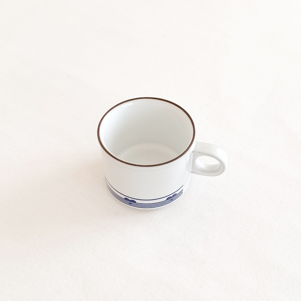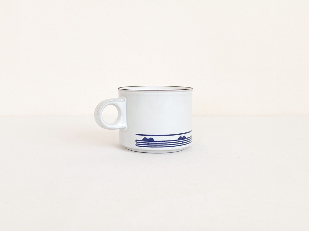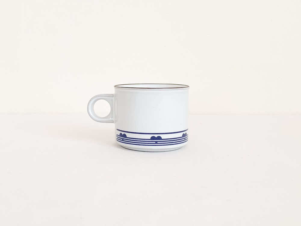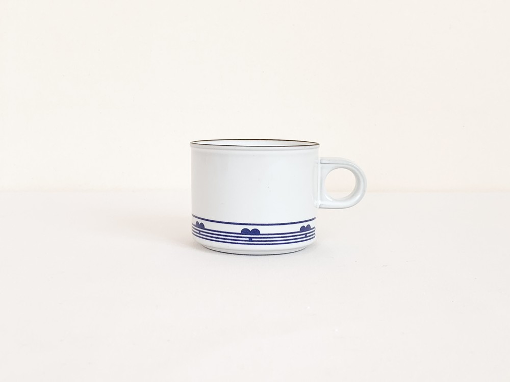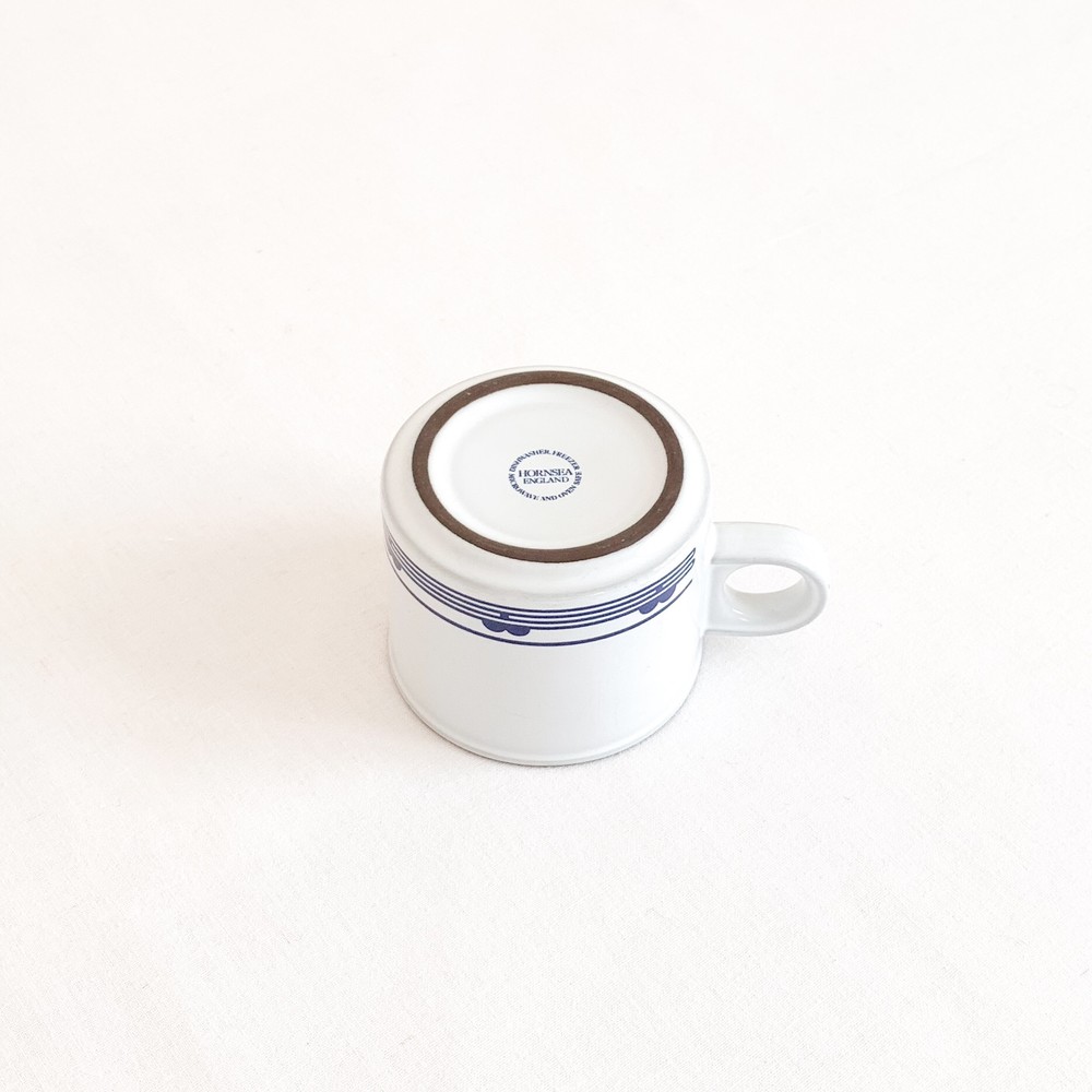 혼시의 빈티지 찻잔세트입니다. 혼시는 1949년부터 잉글랜드 서쪽의 바닷가 마을 혼시에서, 해변의 기념품이 될만한 도자기인형이나 화병을 제작하던 하우스 브랜드 입니다. 좋은 재료, 좋은 디자인으로 유명세를 가지게되며 1950년부터 테이블웨어를 생산하기 시작했습니다. 매뉴팩쳐와 아트피스사이의 적당한 지점을 찾아보고자 했던 혼시는 예술대학 학생들을 디자이너로 영입하고, '현대적인 우아함' 그리고 '정원에서 보내는 차마시는 시간'을 모티브로한 세련된 제품들을 만들었습니다. 그에 걸맞는 멋진 테이블웨어들은 영국의 주요 박물관에서도 소장하고 있을 만큼 높은 가치가 유지되고 있습니다. 소개해드리는 찻잔은 1950년대 중반에 제작되었습니다. 적당한 묵직함의 스톤웨어를 소재로하며, 혼시 특유의 단정한 균형을 가진 선들이 보여집니다. 표면에 매끄러운 광택의 새하얀 유약이 입혀진 잔과 잔받침의 가장자리에는 바탕이 되는 초콜렛색 스톤웨어가 보송한 질감으로 드러나 있으며, 둘레에는 수평선과 구름이 떠오르는 경쾌한 파랑의 무늬가 그려져 있습니다. 깨끗하고 밝은, 포근한 분위기를 전해주는 넉넉한 크기의 찻잔으로- 핫초콜렛을 넘실거리도록 담아 마시기거나, 뮤즐리나 오트밀을 담아내는 간결한 아침의 그릇으로 사용하기에 잘 어울립니다.