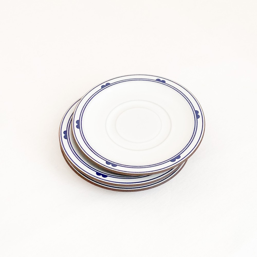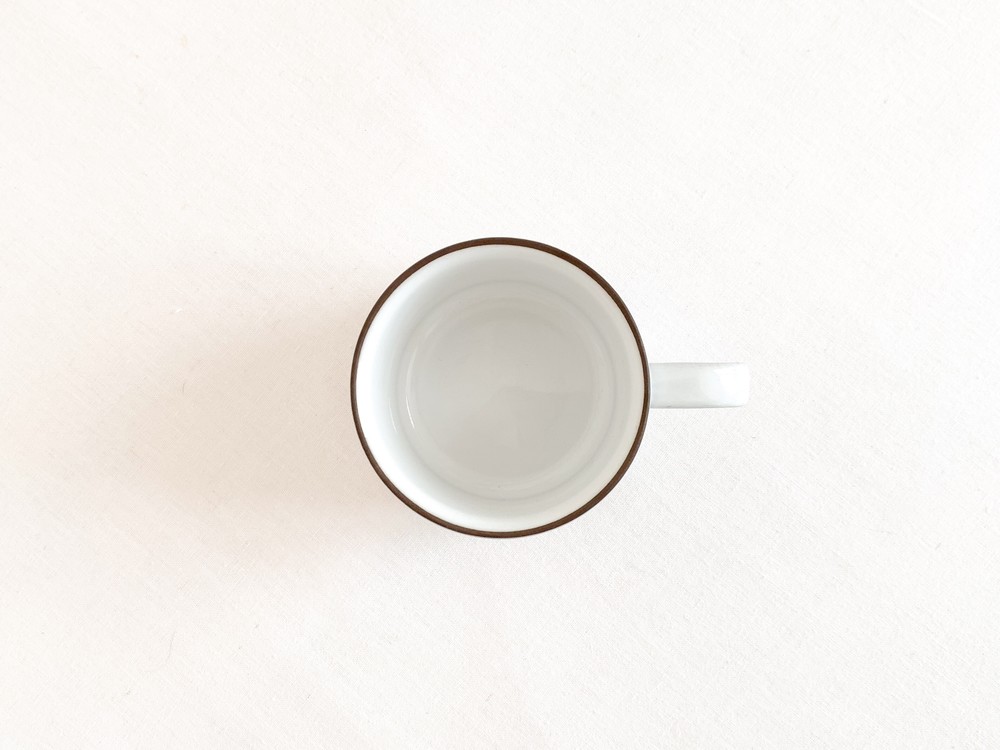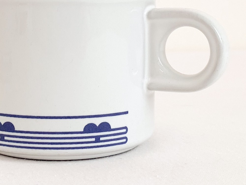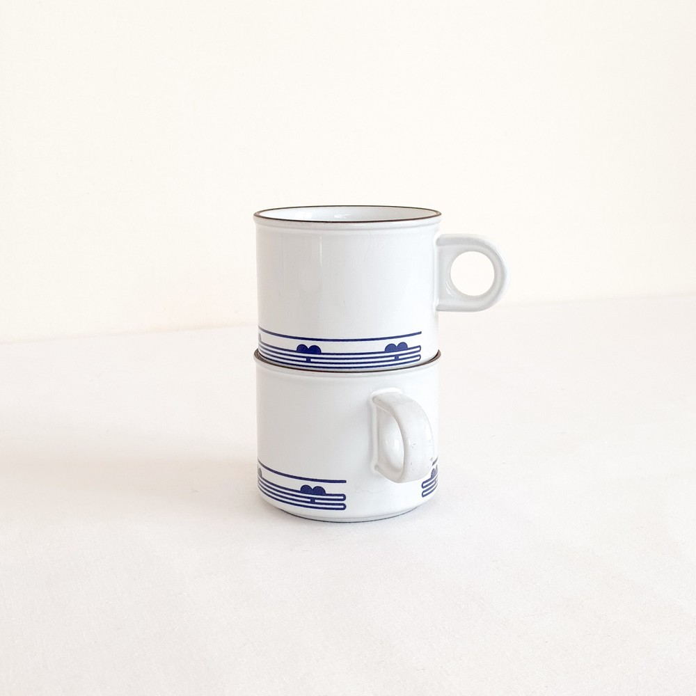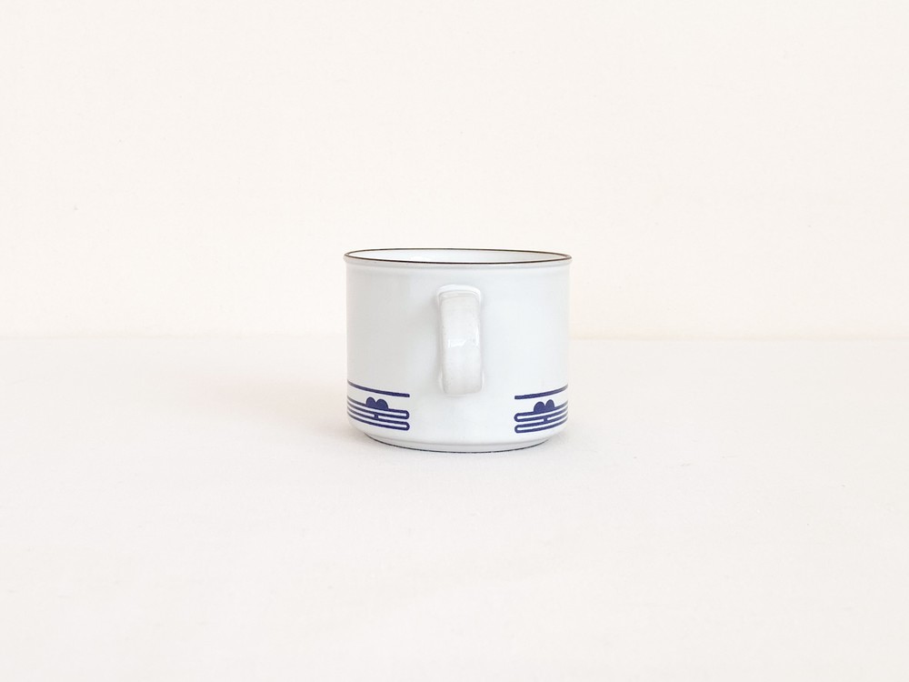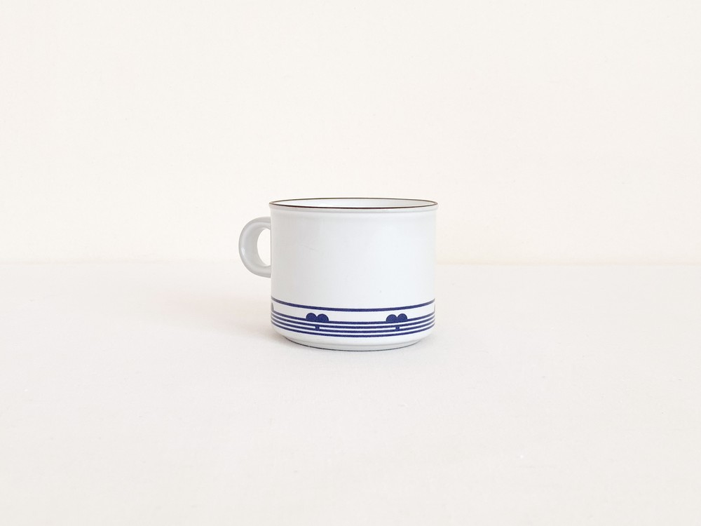 혼시의 빈티지 찻잔세트입니다. 혼시는 1949년부터 잉글랜드 서쪽의 바닷가 마을 혼시에서, 해변의 기념품이 될만한 도자기인형이나 화병을 제작하던 하우스 브랜드 입니다. 좋은 재료, 좋은 디자인으로 유명세를 가지게되며 1950년부터 테이블웨어를 생산하기 시작했습니다. 매뉴팩쳐와 아트피스사이의 적당한 지점을 찾아보고자 했던 혼시는 예술대학 학생들을 디자이너로 영입하고, '현대적인 우아함' 그리고 '정원에서 보내는 차마시는 시간'을 모티브로한 세련된 제품들을 만들었습니다. 그에 걸맞는 멋진 테이블웨어들은 영국의 주요 박물관에서도 소장하고 있을 만큼 높은 가치가 유지되고 있습니다. 소개해드리는 찻잔은 1950년대 중반에 제작되었습니다. 적당한 묵직함의 스톤웨어를 소재로하며, 혼시 특유의 단정한 균형을 가진 선들이 보여집니다. 표면에 매끄러운 광택의 새하얀 유약이 입혀진 잔과 잔받침의 가장자리에는 바탕이 되는 초콜렛색 스톤웨어가 보송한 질감으로 드러나 있으며, 둘레에는 수평선과 구름이 떠오르는 경쾌한 파랑의 무늬가 그려져 있습니다. 깨끗하고 밝은, 포근한 분위기를 전해주는 넉넉한 크기의 찻잔으로- 핫초콜렛을 넘실거리도록 담아 마시기거나, 뮤즐리나 오트밀을 담아내는 간결한 아침의 그릇으로 사용하기에 잘 어울립니다.