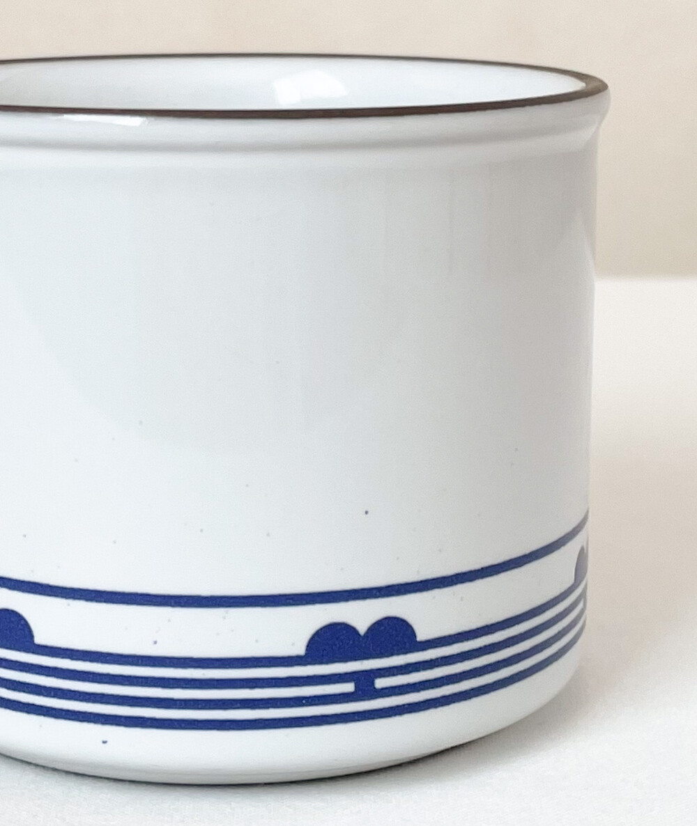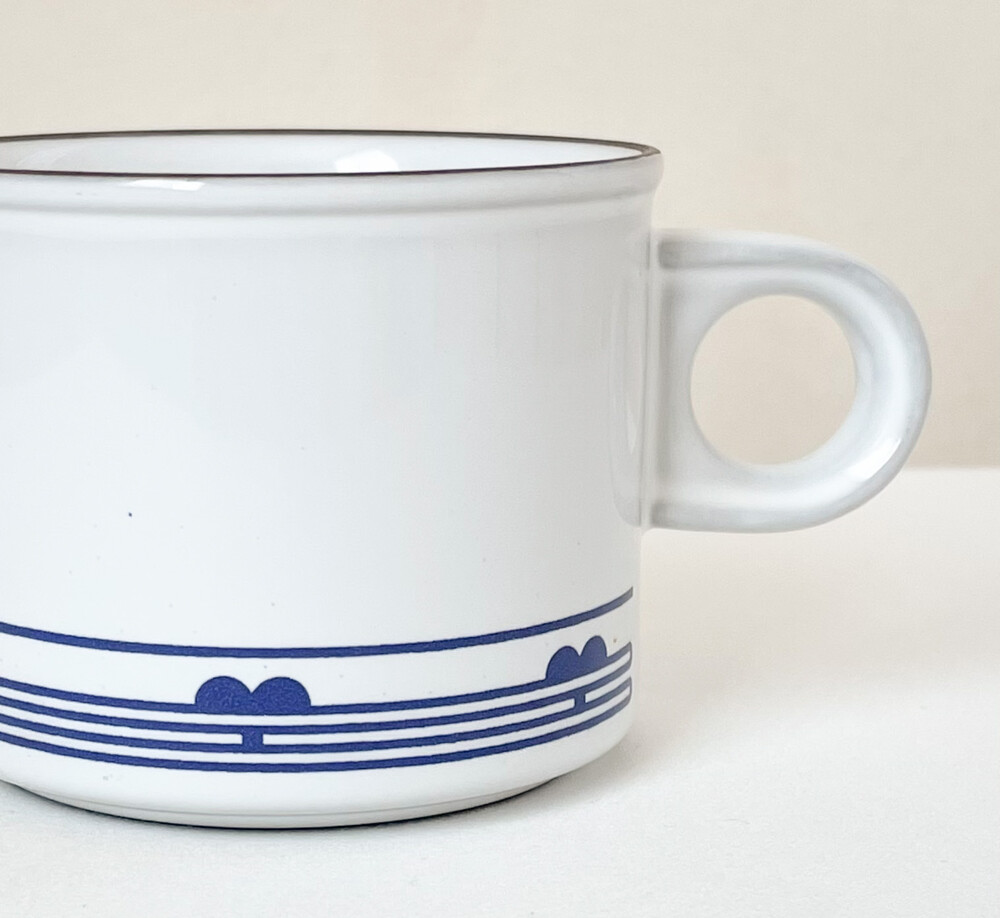 혼시는 1949년부터 잉글랜드 서쪽의 바닷가 마을 혼시에서, 해변의 기념품이 될만한 도자기인형이나 화병을 제작하던 하우스 브랜드 입니다. 좋은 재료, 좋은 디자인으로 유명세를 가지게되며 1950년부터 테이블웨어를 생산하기 시작했습니다. 매뉴팩쳐와 아트피스사이의 적당한 지점을 찾아보고자 했던 혼시는 예술대학 학생들을 디자이너로 영입하고, '현대적인 우아함' 그리고 '정원에서 보내는 차마시는 시간'을 모티브로한 세련된 제품들을 만들었습니다. 그에 걸맞는 멋진 테이블웨어들은 영국의 주요 박물관에서도 소장하고 있을 만큼 높은 가치가 유지되고 있습니다. 소개해드리는 찻잔은 1950년대 중반에 제작되었습니다. 적당한 묵직함의 스톤웨어를 소재로하며, 혼시 특유의 단정한 균형을 가진 선들이 보여집니다. 표면에 매끄러운 광택의 새하얀 유약이 입혀진 잔과 잔받침의 가장자리에는 바탕이 되는 초콜렛색 스톤웨어가 보송한 질감으로 드러나 있으며, 둘레에는 수평선과 구름이 떠오르는 경쾌한 파랑의 무늬가 그려져 있습니다. 깨끗하고 밝은, 포근한 분위기를 전해주는 넉넉한 크기의 제품으로- 핫초콜렛을 넘실거리도록 담아 마시기거나, 뮤즐리나 오트밀 또는 간결한 토스트를 담아내는 아침시간의 그릇으로 사용하기에 잘 어울립니다.