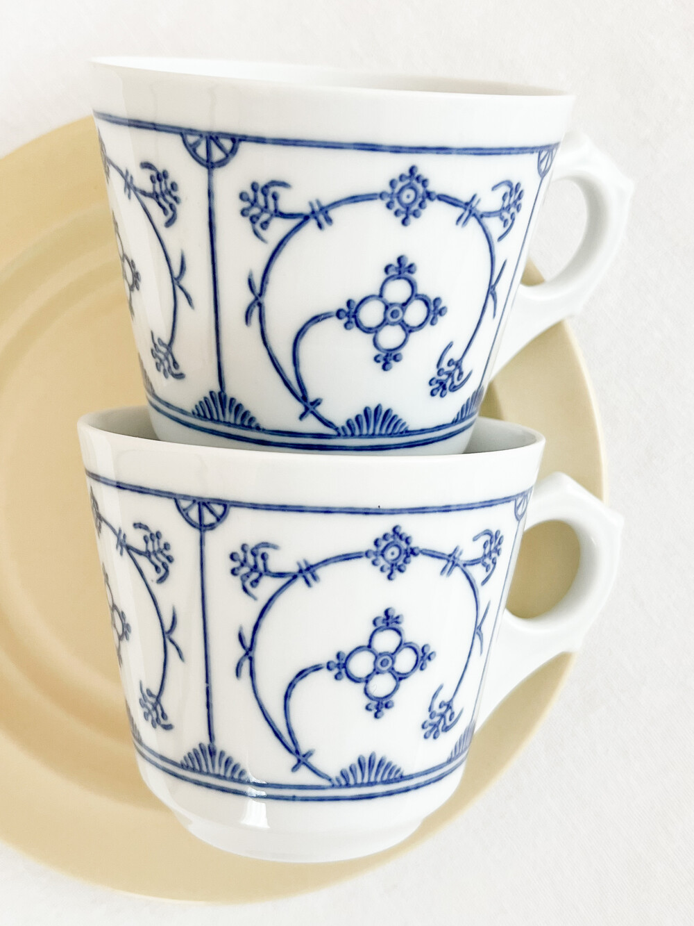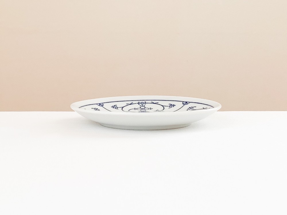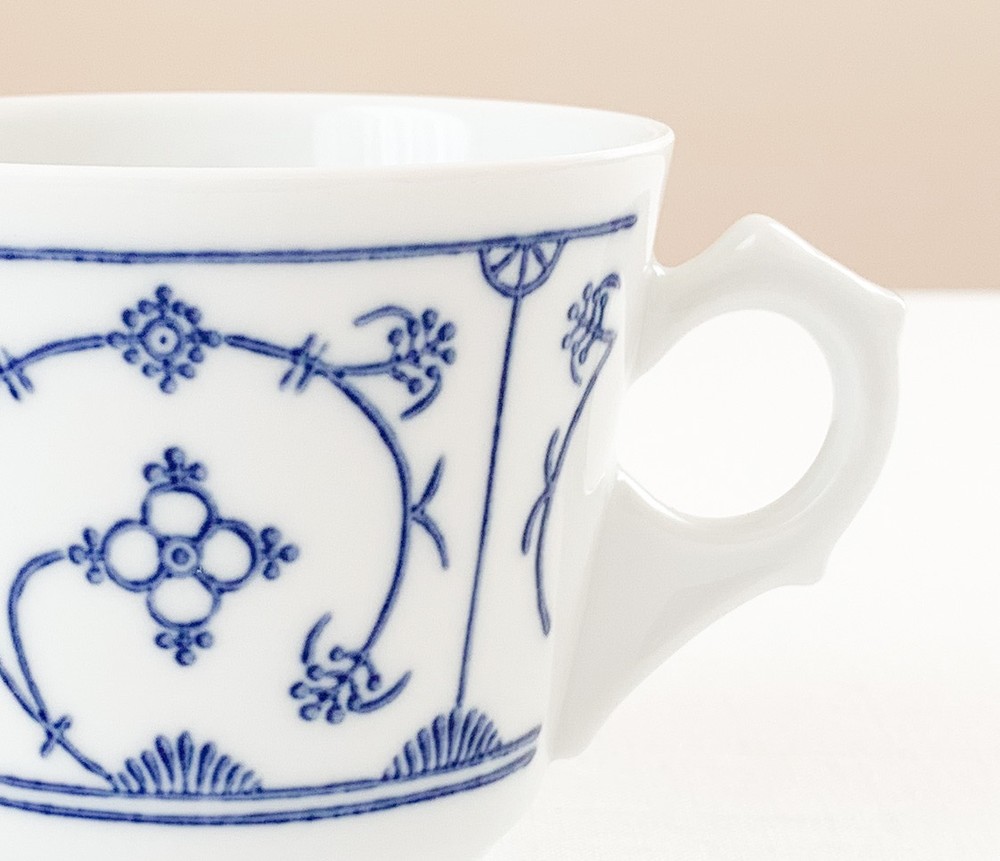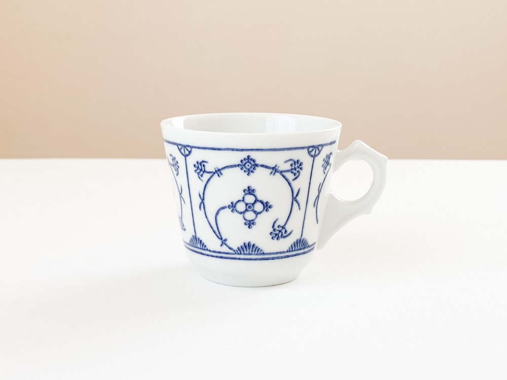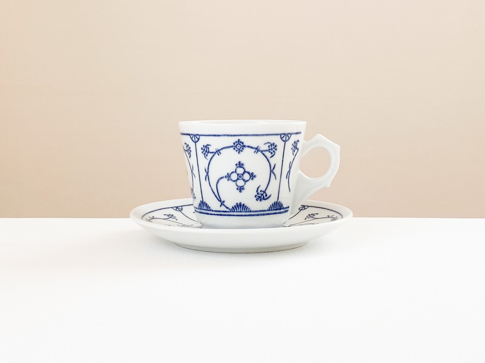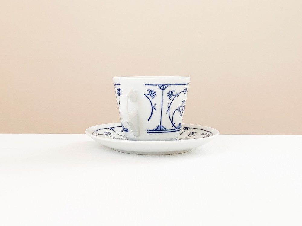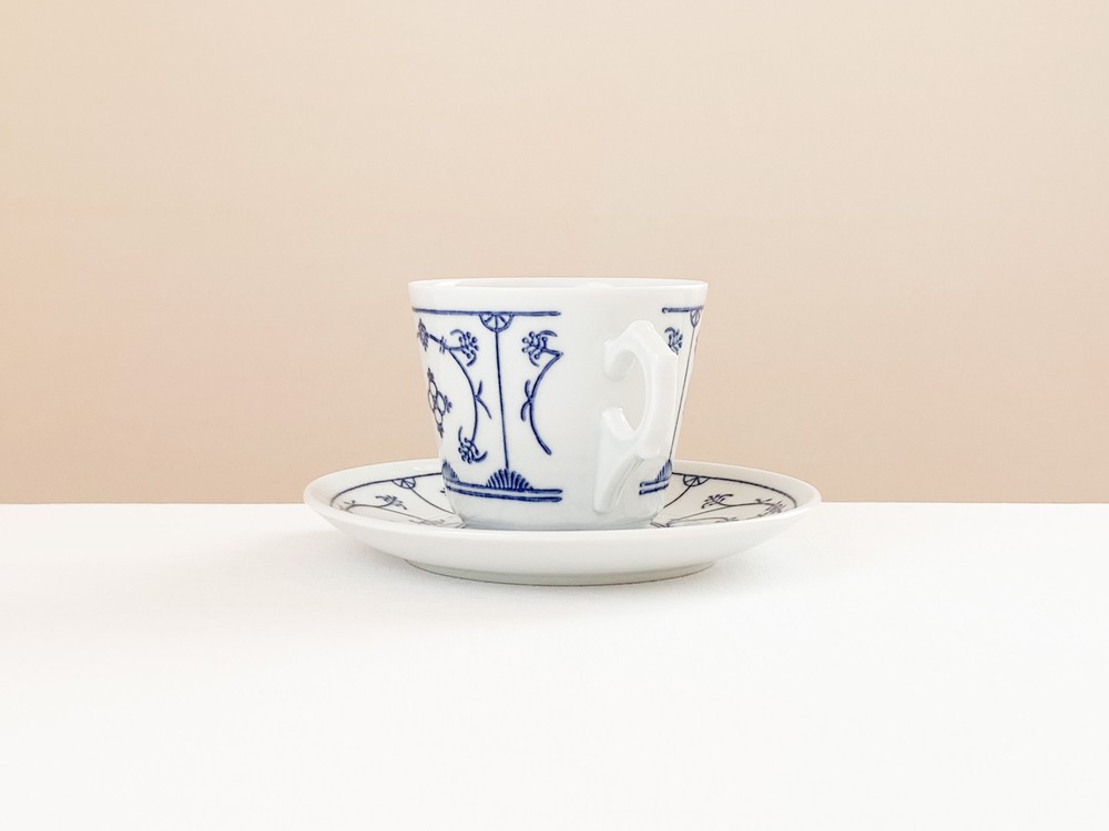 1844년부터 독일의 튀링겐 지방에서 테이블웨어를 만들어온 칼라의 빈티지 찻잔세트입니다. 칼라는 제품이 제작되는 각각의 공정에 맞는 마스터들에의해 세심하게 도자기가 만들어지는 방식을 지켜오며, 고전적인 코발트 블루의 줄기과 꽃무늬를 하얀 포슬린 위에 그려넣은 테이블웨어들로, 독일을 대표하는 파인포슬린 브랜드로 자리하게 됩니다. 소개해 드리는 찻잔세트는 1950년대 초반에 만들어 졌습니다. 전형적인 칼라의 분위기를 보여주는 코발트 블루의 무늬로 꾸며져 있으며, 위를 향해 살짝 넓어지는 찻잔과 넓직하고 단정한 실루엣의 잔받침으로 구성 된 제품입니다. 창백하고 맑은 하얀색 포슬린 위에 꽃과 식물의 줄기을 모티프로한 무늬가 롤러스탬프를 사용해 새겨지고, 투명한 유약이 고운결로 입혀져있습니다. 균형있는 형태와 정확한 면분할안에 조금은 불규칙하게 펼쳐진 무늬의 배열과 단정함을 바탕으로한 화려하고 우아한 표현들이 보여집니다. 짙은 커피를 마시거나 아이스크림을 담아내는 잔으로, 작은 물건들을 보관하거나 초를 켜는 트레이로 사용하기에도 잘 어울립니다.
