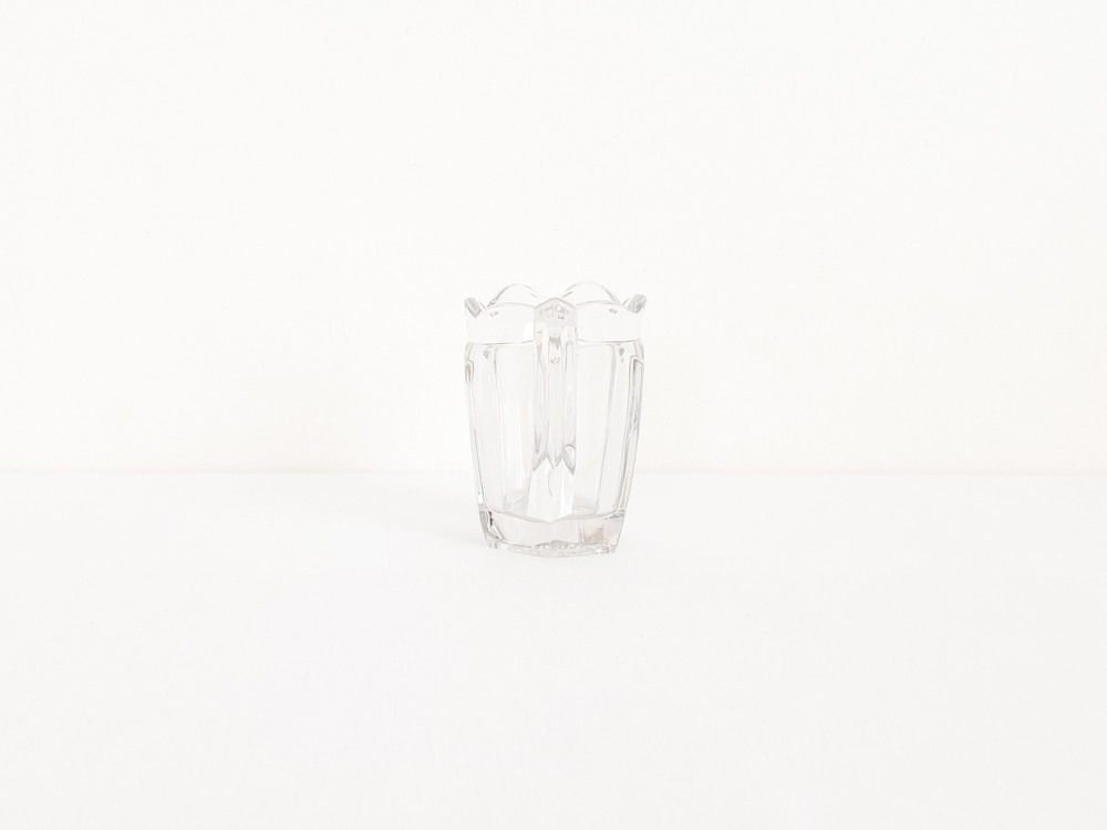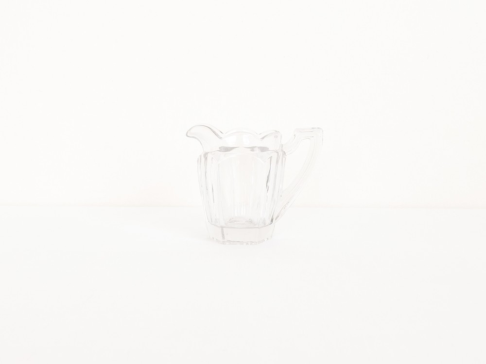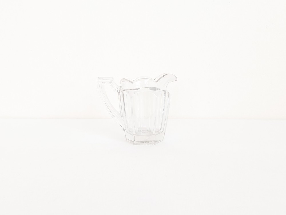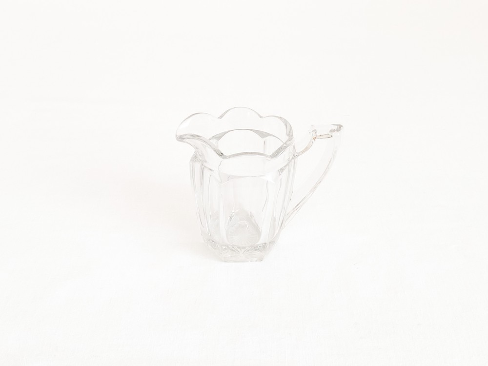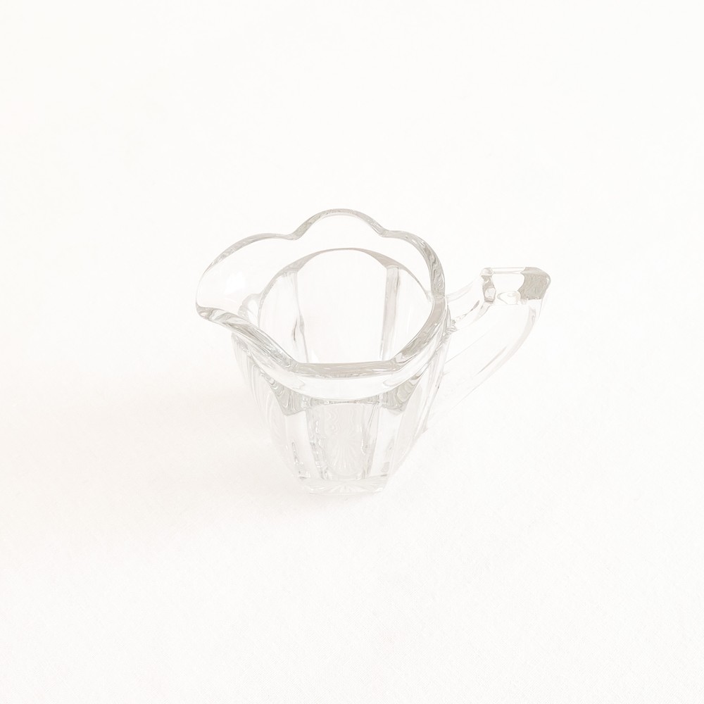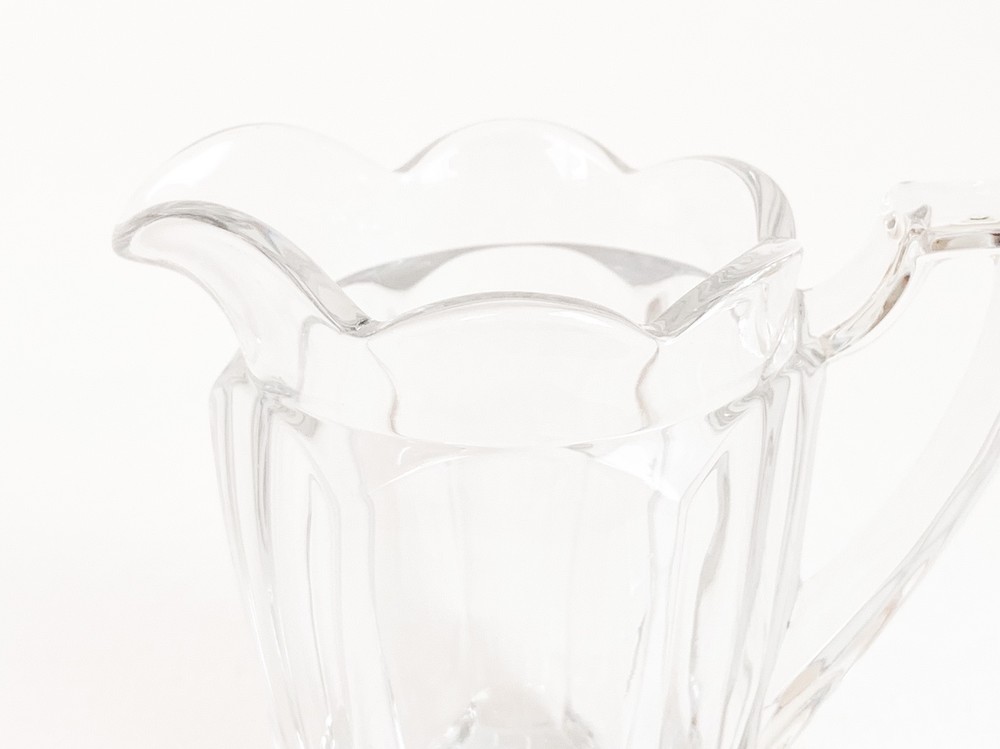 1950년대 중후반의 것으로 전해지는 빈티지 저그입니다. 깊은 투명함을 가진 강화유리를 소재로하는 제품으로, 테이블을 장식하는 레이스를 모티브로 만들어졌습니다. 활짝 핀 꽃잎의 모습을 떠올리는 저그는- 둥근 리듬으로 펼쳐진 가장자리와 스파우트, 그와 연결되며 반짝이도록 나뉜 면들을 보여주는 보울, 단정하며 섬세한 실루엣의 손잡이로 구성되어있습니다. 소재에서 전해지는 깨끗함을 바탕으로 전해지는 적당히 묵직한 화려함과 우아한 분위기를 가지고 있는 제품입니다., 계절의 꽃 몇송이를 담아두는 화병으로 사용하기에 잘 어울립니다.