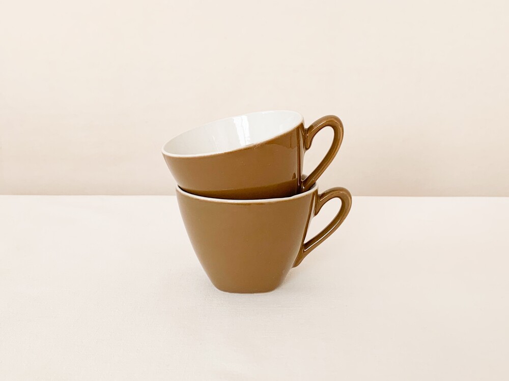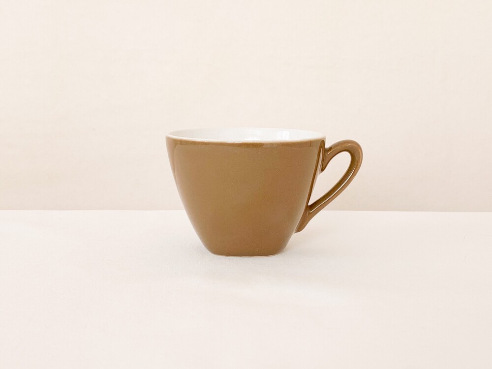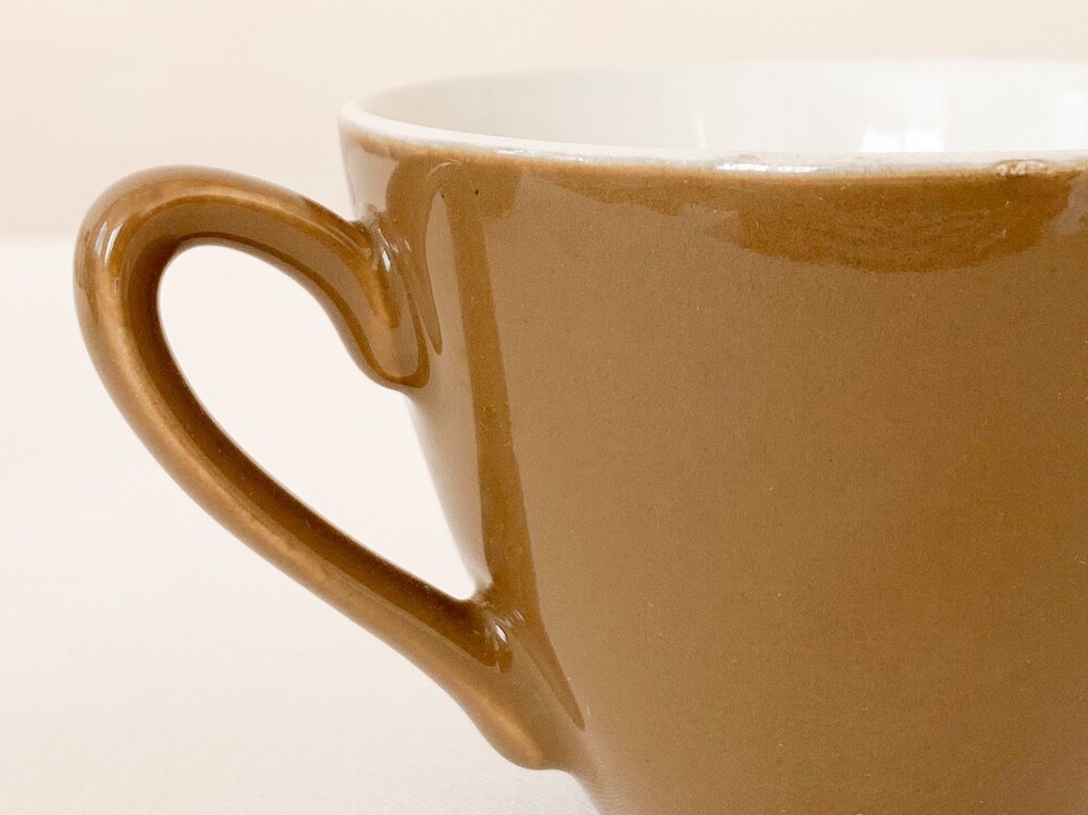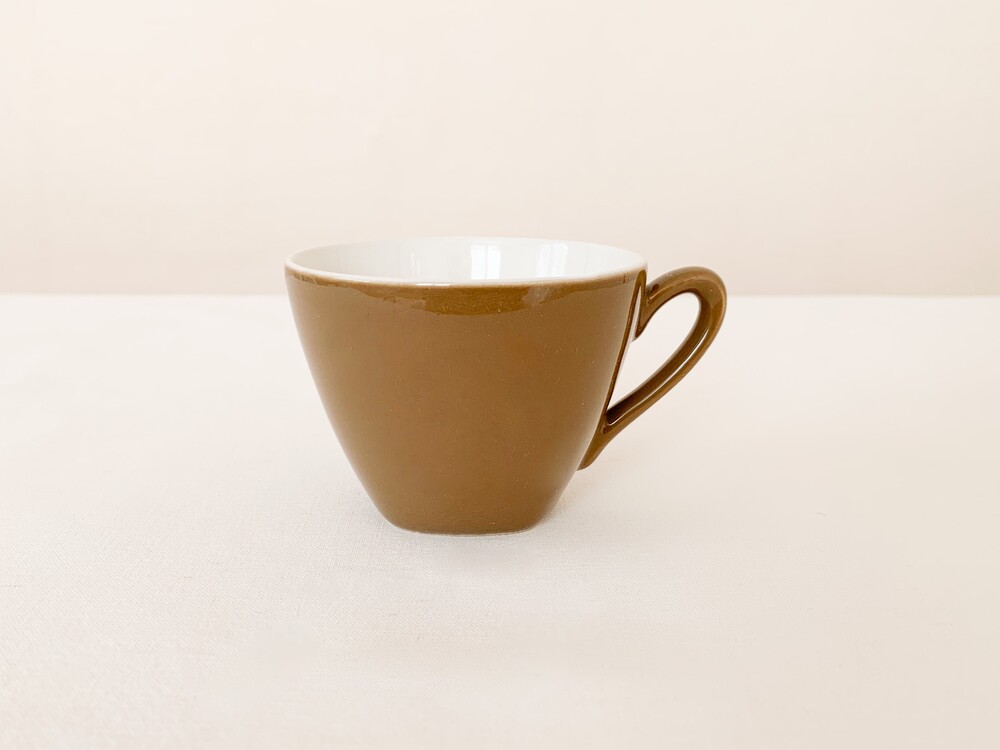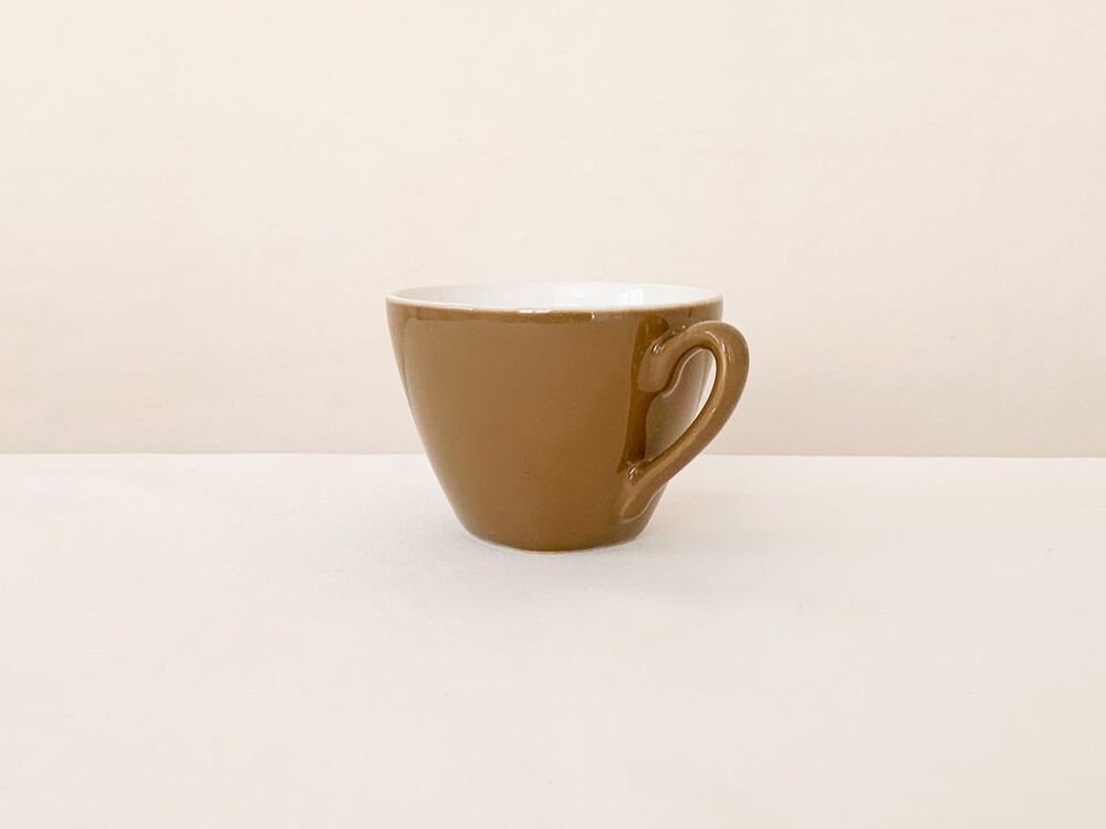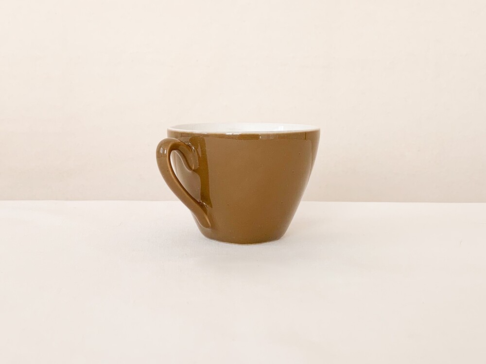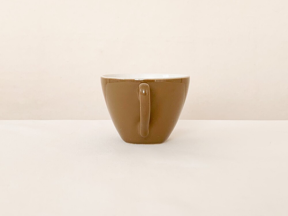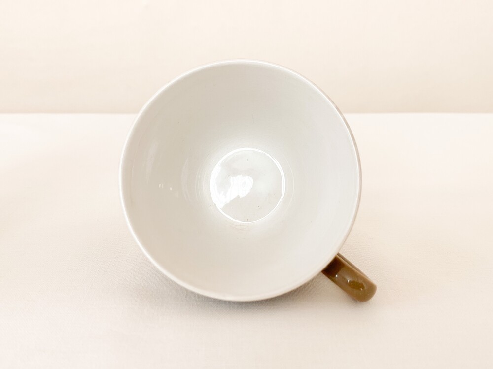 미드윈터는 잉글랜드 중부지방의 버슬렘지역에서 1910년에 부터 시작된, 그 당시의 세련된 트렌드를 이끌어가던 테이블웨어 브랜드입니다. 소개해드리는 커피컵은 1950년대에 제작된 제품으로, 깨끗한 아이보리의 스톤웨어를 소재로 합니다. 위를 향해 넓어지는 보울, 그와 잘 어울리는 흐름의 가벼운 손잡이가 보기좋은 리듬을 만들어냅니다. 잔의 겉면에는 보드라운 초콜렛색이 고르게 보여지고, 가장 바깥면에는 색감이 돋보일 수 있는 맑은 유약이 얇게 입혀져 있습니다. 매끄러운 질감과 사뿐한 실루엣, 차분한 색감으로 부터 전해지는 편안하고 다정한 분위기를 간직한 제품입니다. 짙은 커피나 차를 마시는 잔으로, 과일이나 요거트를 담아내는 식사시간의 조그마한 그릇으로 사용하기에 잘 어울립니다.
