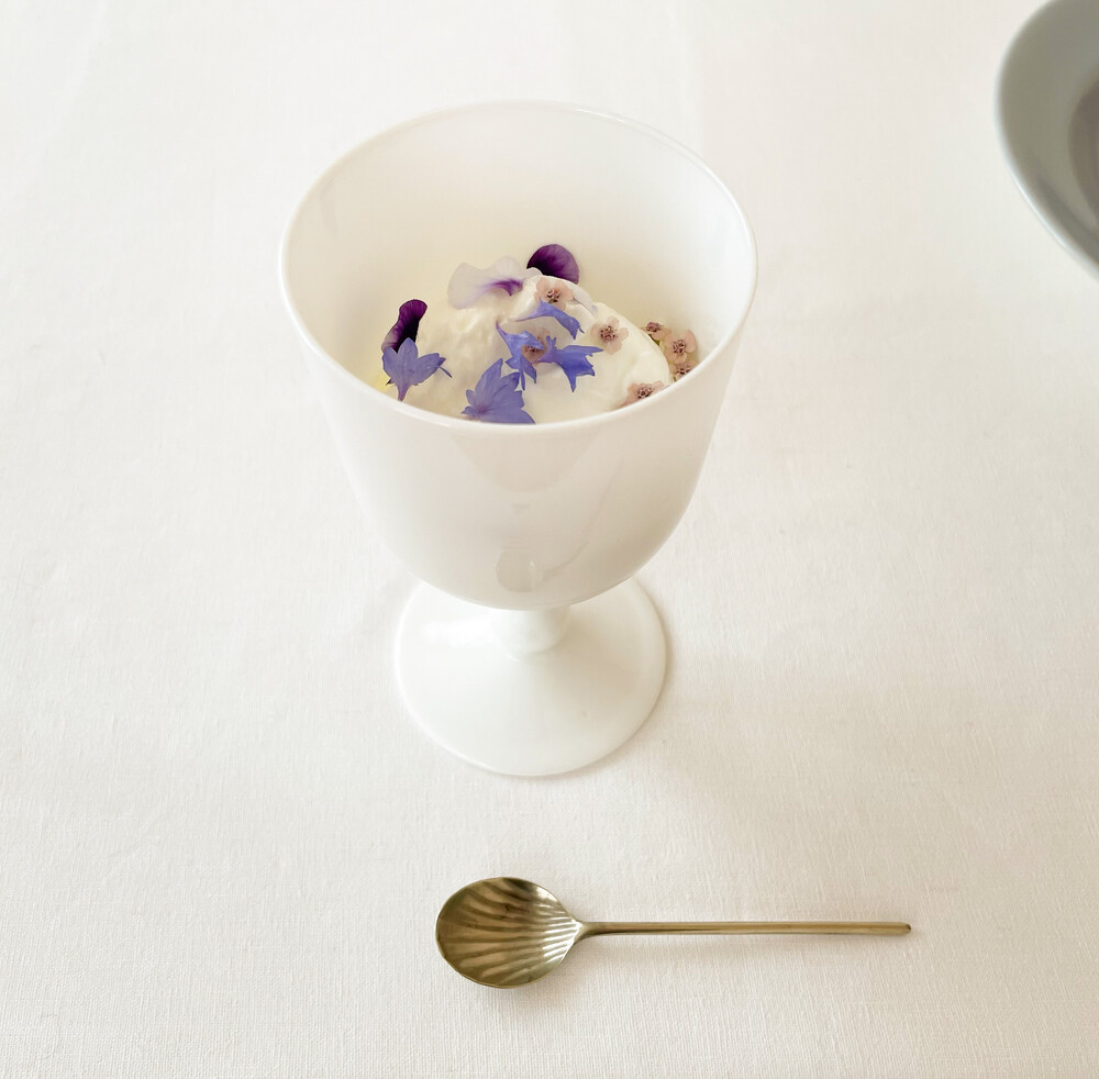 1950년대 프랑스에서 제작된 빈티지 밀크글라스 고블렛 입니다. 묵직하고 단단한 질감의 밀크글라스를 소재로하며, 여리고 부드러운 선으로 이루어진 단정한 실루엣을 보여줍니다. 다른빛이 섞이지 않은 깨끗한 하얀색의 고블렛은 아주 곱고 섬세한 결을 가지고 있으며, 밀크글라스에서는 보기 드문 핸드블로운 기법을 통해 모양을 갖추었습니다. 비율과 구성에 있어 고전적인 형식을 취하고 있으나 작은 부분들에는 동시대의 터치가 담겨있는- 우아하고 세련된 모습이 보여집니다. 시간과 날씨에 따른 빛과 컵안에 담겨진 무언가의 일렁임에 따라 섬세하고 아름다운 흐름을 전해주는 제품입니다. 선명한색의 주스나 와인을 마시는 잔으로, 아이스크림이나 과일을 담아내는 디저트 컵으로 사용하기에 잘 어울립니다.