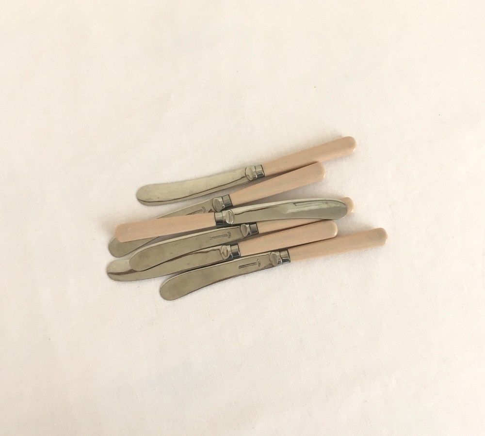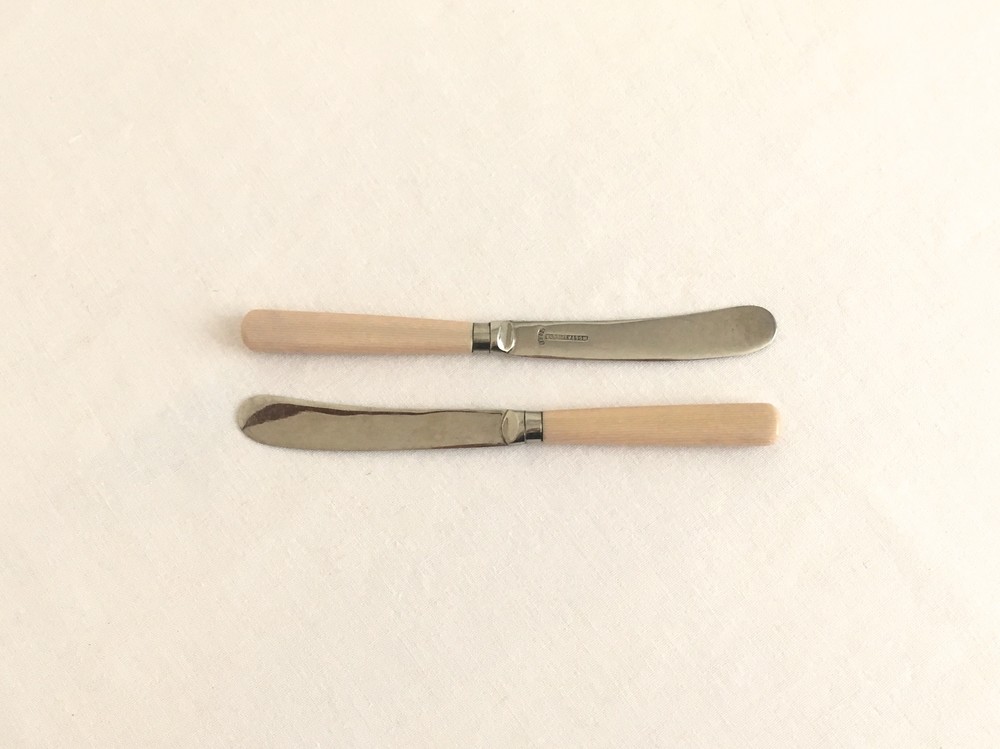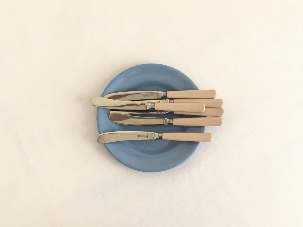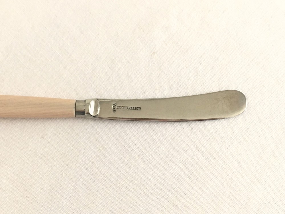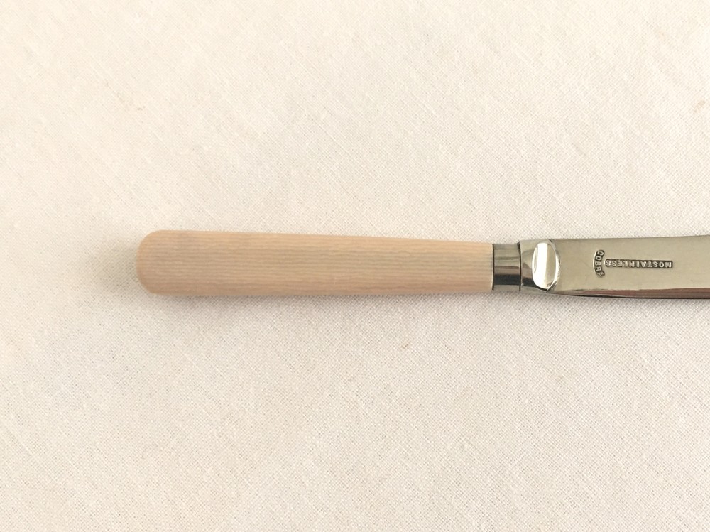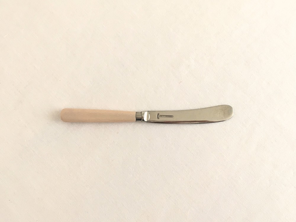 1950년대 초반에 만들어진것으로 전해지는 모스테인리스의 빈티지 나이프입니다. 모스테인리스는 1940년대에서 1960년대 동안 생활 가까이에서 필요한 스테인리스제품을 만들었던 런던기반의 브랜드로, most와 stainless가 더해진 단순하고 귀여운 네이밍을 가지고 있기도합니다. 소개해드리는 제품은 잼과 버터을 바르기위한 작은 나이프로, 윤기있는 베이클라이트 손잡이와 견고한 스테인리스스틸을 소재로 합니다. 밝고 단정한 빛의 베이지의 손잡이에는 가로방향의 줄무늬가 가느다란결로 스며들어있으며 손에 잡기 편한 볼록하고 둥근 모양으로 다듬어져있습니다. 최소한의 요소로 손잡이과 날을 견고하게 연결하는 링을따라 이어진 나이프의 날은 잼과 버터를 바르는 용도에 적당한 굴곡을 가지고있습니다. 단조롭고 평범한, 표준화된 형태에 세심한 선들과 색을 더해 특별한 분위기가 완성된 제품입니다. 도톰하고 바삭하게 구워낸 브리오슈와 파운드케이크에 잼과버터를 더하는 나이프로 사용하기에 알맞으며, 케이크나 파이와 함께내는 디저트 나이프로도 잘 어울립니다.