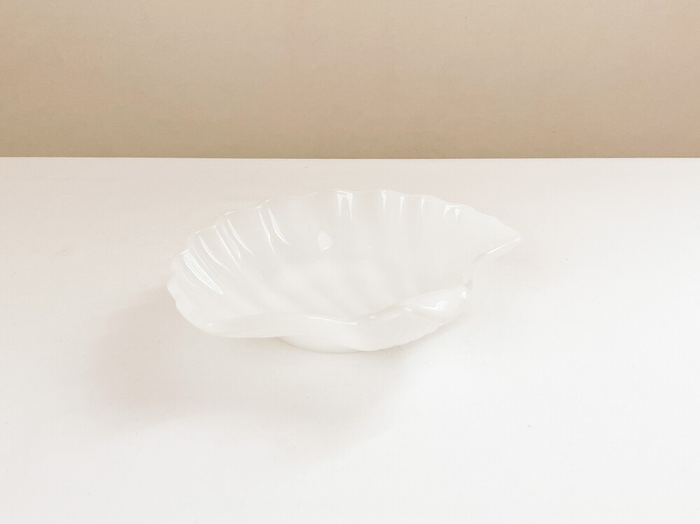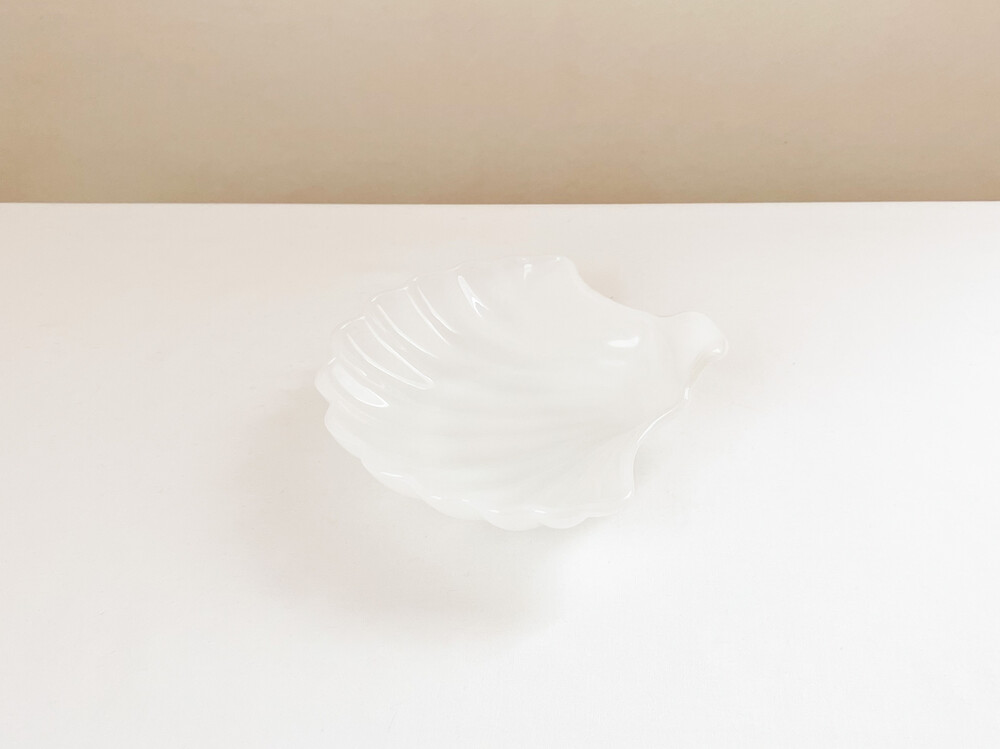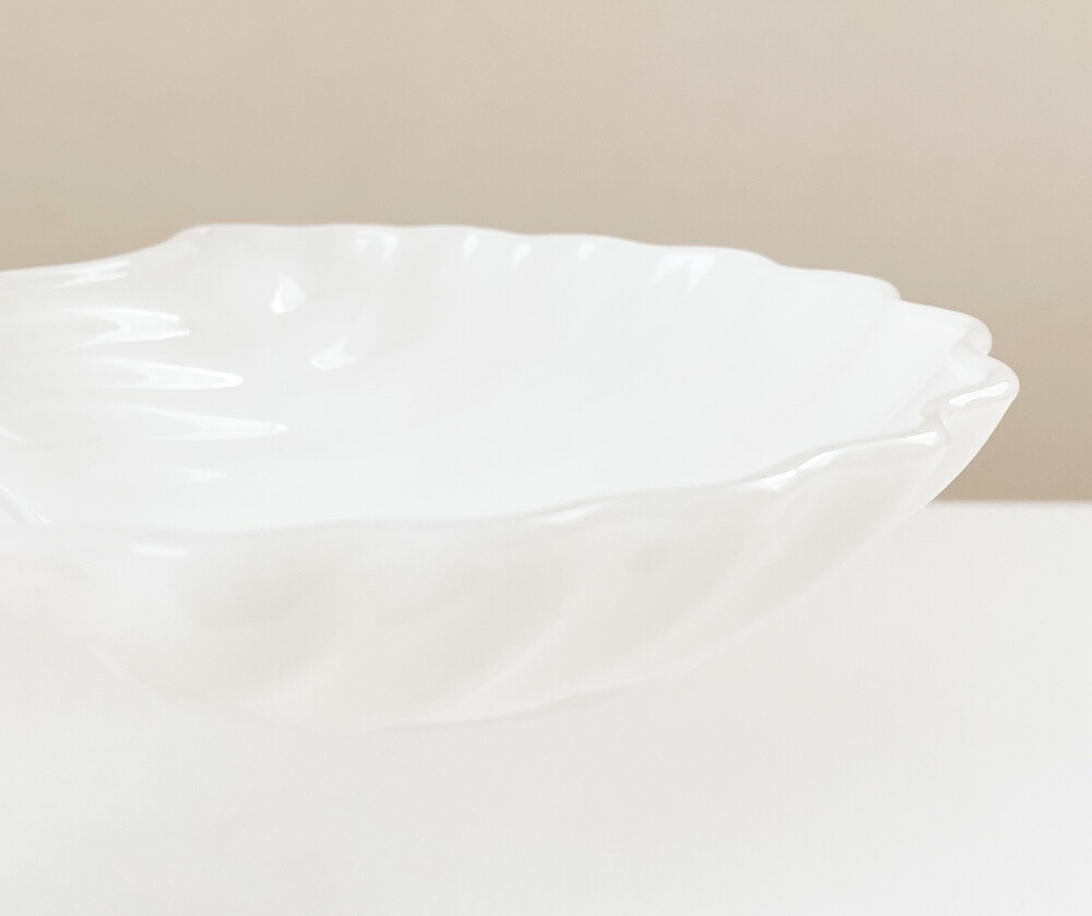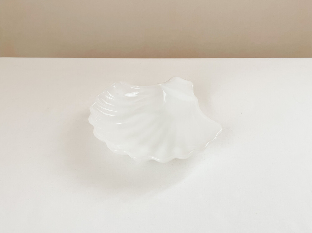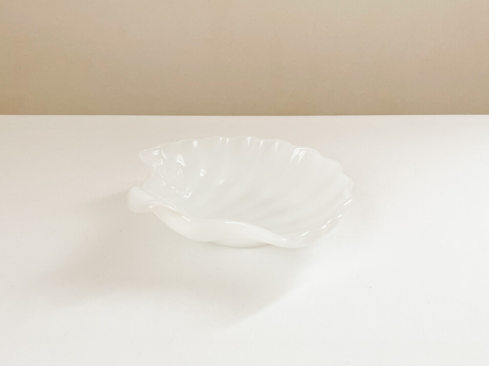 1950년대 영국에서 만들어진 쉘디쉬입니다. 매끄러운 질감과 은은한 투명함을 가진 오팔린글라스를 소재로 하며, 흐르는듯 부드럽고 가지런한 곡선들이 펼쳐져 있는 조가비 모양을 가지고 있습니다. 흔치않은 넉넉한 크기와 단단한 소재는 일상에서 여러 용도로 활용하기에 알맞으며, 수집품으로서 매우 높은 가치를 가지고 있기도 합니다. 소재와 모티브에 담겨있는 여유롭고 동화적인 감정, 놓여지는 공간의 빛을 머금어 보드랍게 내보여주는 오팔린글라스 고유의 화사한 분위기가 아름답습니다. 욕실이나 세면대의 비누를 담아두는 넉넉한 접시나 티테이블의 디저트 트레이로, 여름날 저녁의 선선한 바람과 함께 하는 식사시간의 그릇으로 사용하기에 잘 어울립니다.