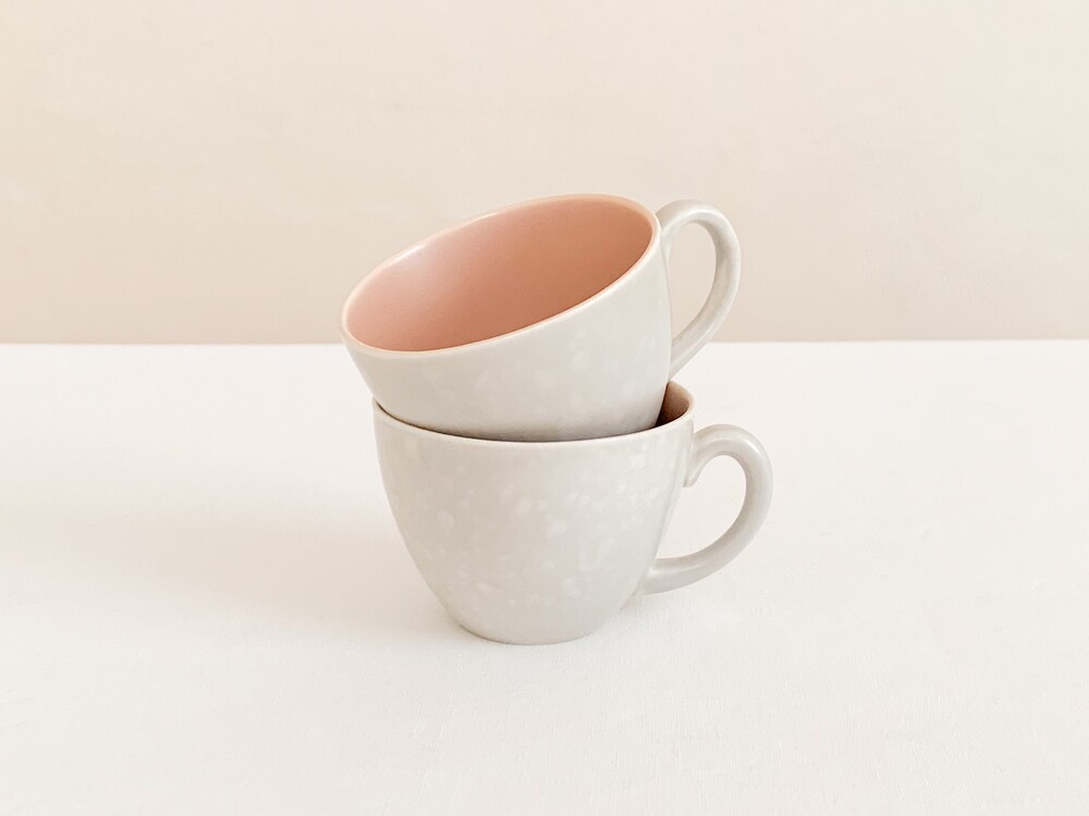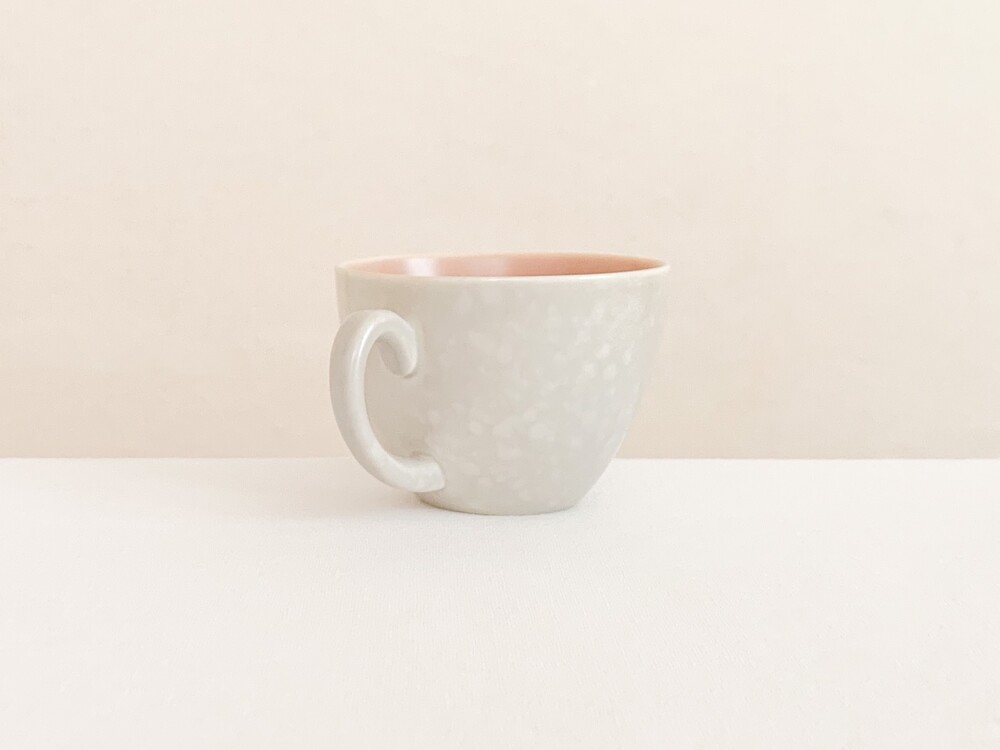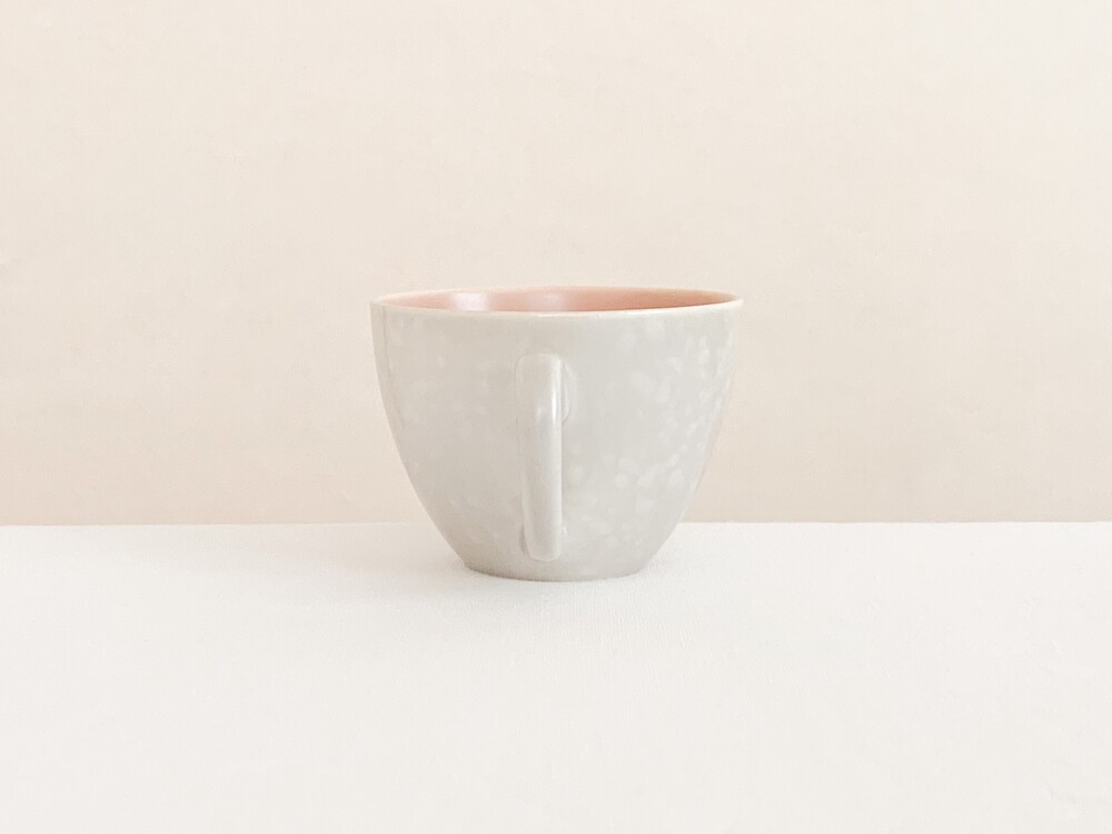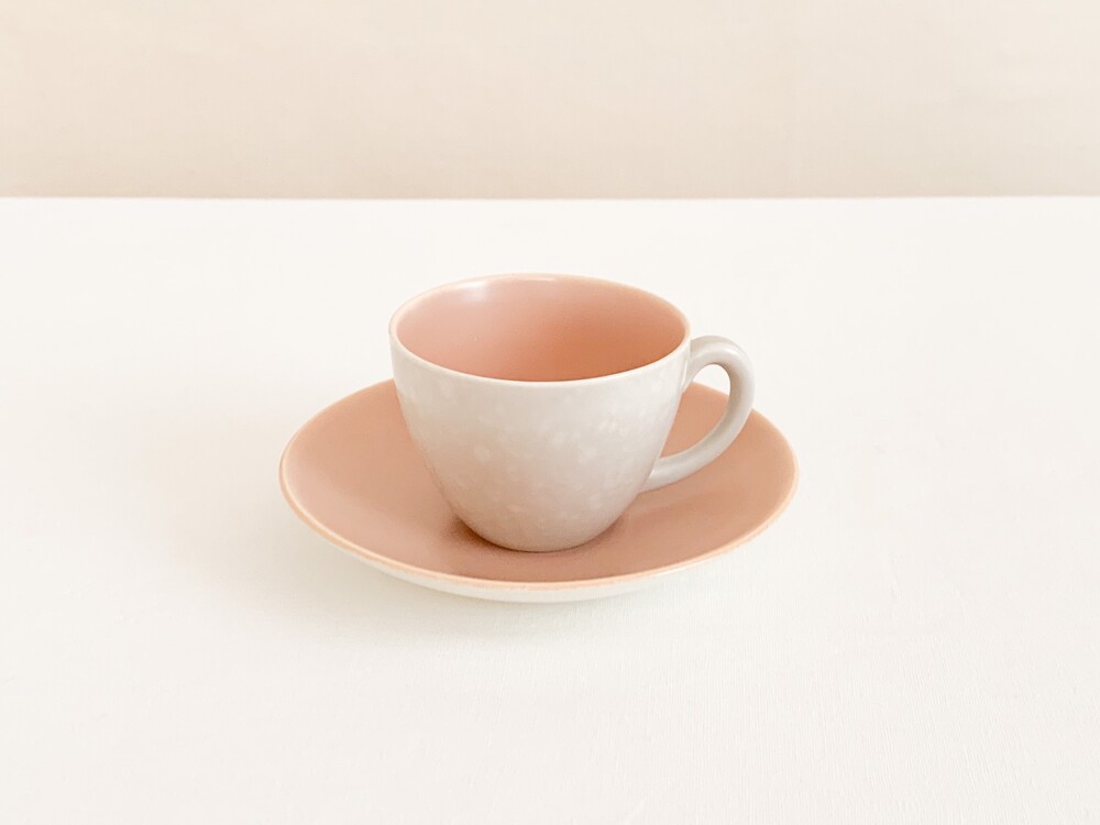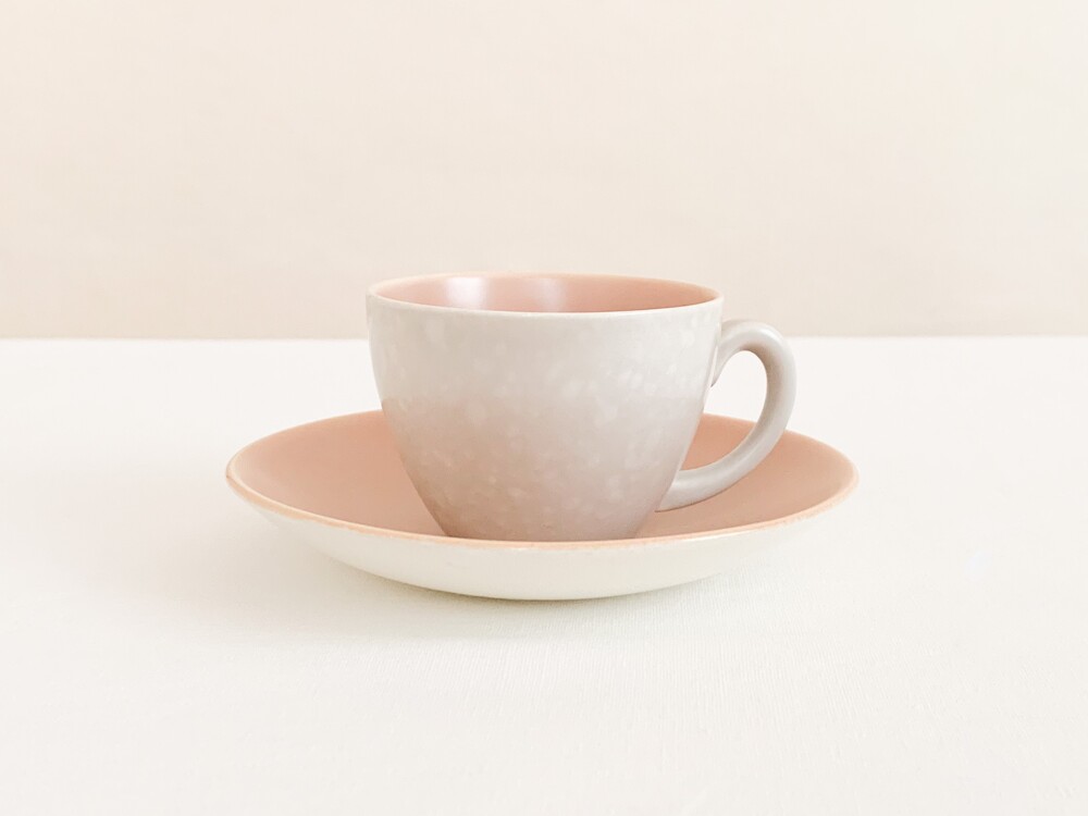 엷은분홍과 일렁이는 회색으로 장식된 풀의 커피컵세트입니다. 풀은 1873년 건축용 도자기장식이나 타일을 만드는 회사로 시작되었고, 1900년대 초반부터 도자기 테이블웨어를 만들었던 영국의 브랜드입니다. 건축용 도자기제품을 만들었던 역사를 가지고 있는만큼 튼튼한 제질과 실용성, 그리고 기본에서 벗어나지 않은- 세련된 디자인을 특징으로 합니다. 소개해 드리는 제품은 1950년대 중반에 제작되었습니다. 둥글고 단정하며 우아한 선을 살펴볼 수 있으며, 손에 편하게 들리는 모양으로 빚어진 손잡이가 있는 컵, 잔을 살짝 감싸안는듯 살며시 위를향해 펼쳐진 잔받침으로 구성되어있습니다. 컵과 잔받침의 안쪽은 바탕이 되는 소재가 은근히 비쳐나는 차분한 분홍빛으로, 컵의 겉면은 밝은 회색과 뽀얀크림색의 잔잔한 무늬가 입혀져있으며- 벨벳과 같은 은은한 광택을 가지고 있습니다. 잔잔하고 조용한 분위기를 가진 제품으로, 아이스크림을 둥글게 담아내거나, 뜨거운 커피를 위한잔으로 잘 어울립니다.