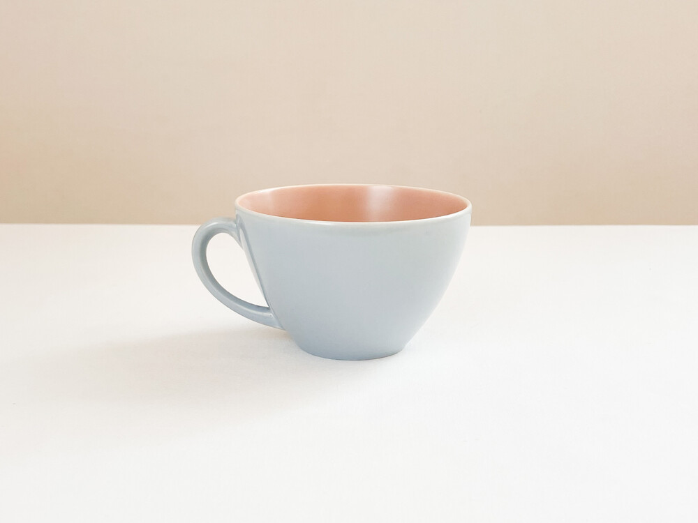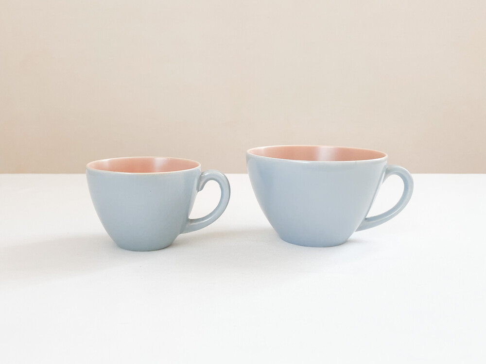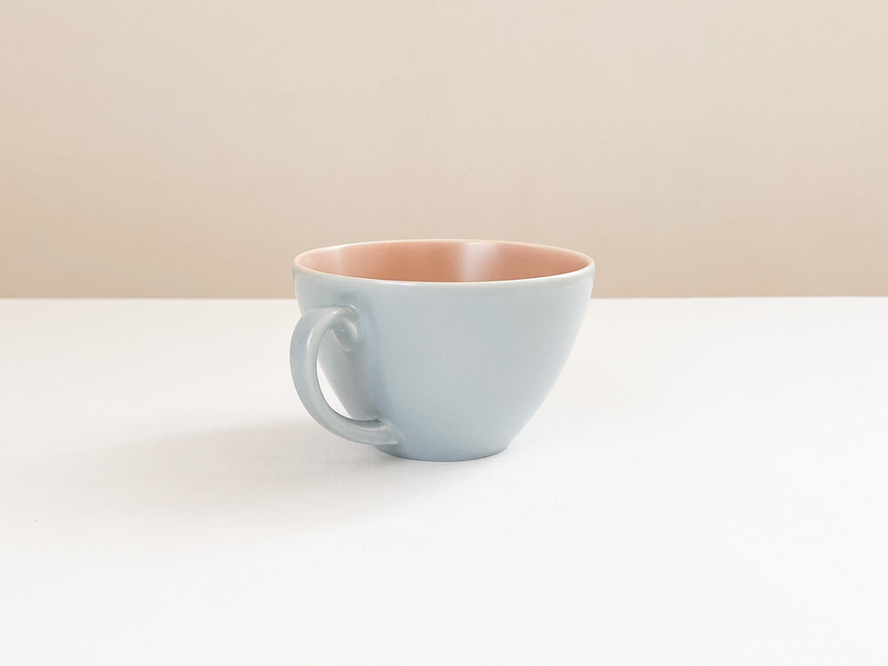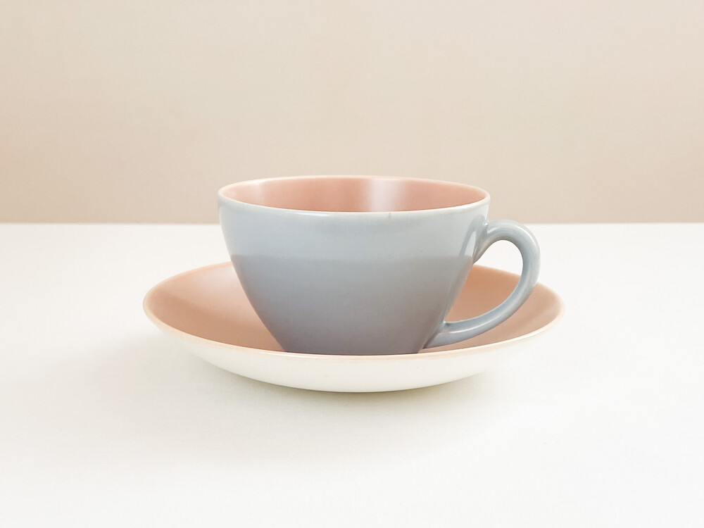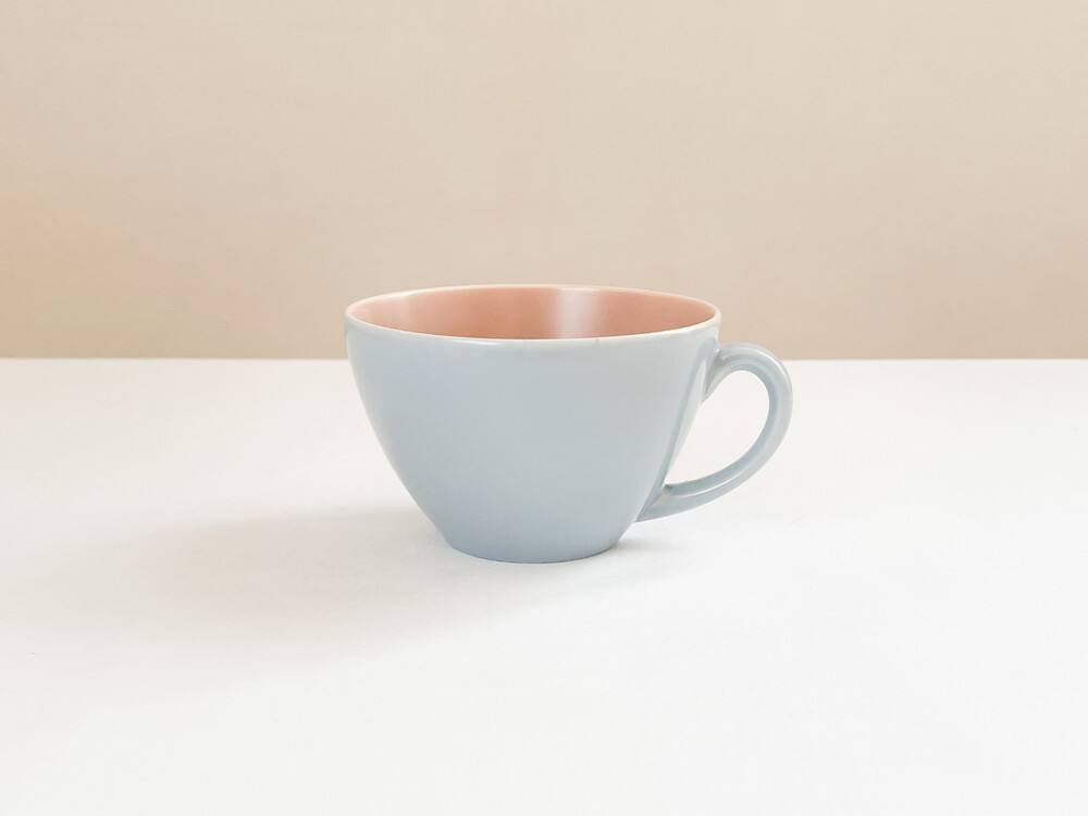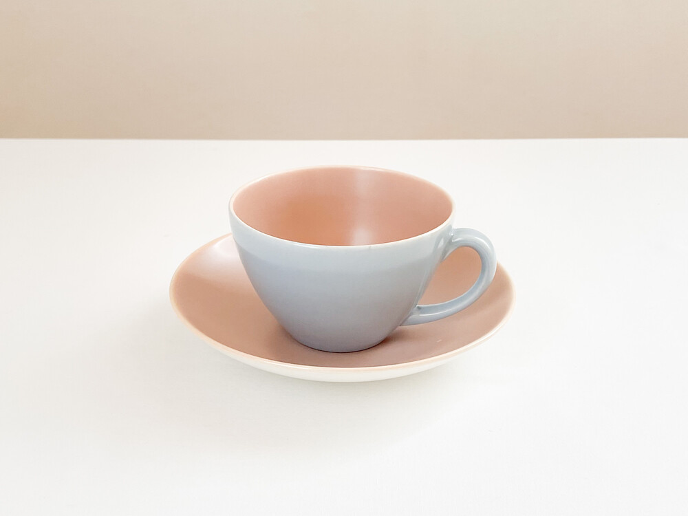 풀은 1873년 건축용 도자기장식이나 타일을 만드는 회사로 시작된- 1900년대 초반부터 테이블웨어를 만들었던 영국의 도자기 브랜드로, 깊이있는 색감들과 튼튼한 내구성을 특징으로 하며, 보여지는 모습에서 그리고 그안에 담겨있는 내용들(용도나 제작방식 등 보여지는 모습을 위해 가져야할 과정 등)에서도 보편적인 영국의 정체성을 잘 보여줍니다. 소개해드리는 찻잔세트는 풀이 본격적으로 정체성을 갖추어가기 시작했던 1950년대에 만들어졌습니다. 이시기에 주로 만들었었던 트윈톤시리즈 중 아주 희소성있는 한 가지로, 안개에 덮인듯한 엷은푸른색과 흐린분홍이 함께보여지는 제품입니다. 얇고 단단한 스톤웨어를 소재로하며 군더더기 없이 매끄러운 모습의 둥근 찻잔과 잔을 살며시 감싸는 듯 아래에서 위로 펼쳐진 모양의 잔받침으로 이루어졌습니다. 아름다운 색감이 돋보일 수 있는- 보드라운 광택을 가진 유약으로 마무리가 되어있으며, 바탕이되는 도자기의 크림색이 잔입구의 둘레와 잔받침의 가장자리에 드러나 만들어진 은근한 줄무늬가 보여집니다. 두 가지 색의 어울림에서 전해지는 잔잔한 결, 둥글고 고운 실루엣으로 부터 살펴 볼 수 있는 우아한 정서를 간직하고 있습니다.