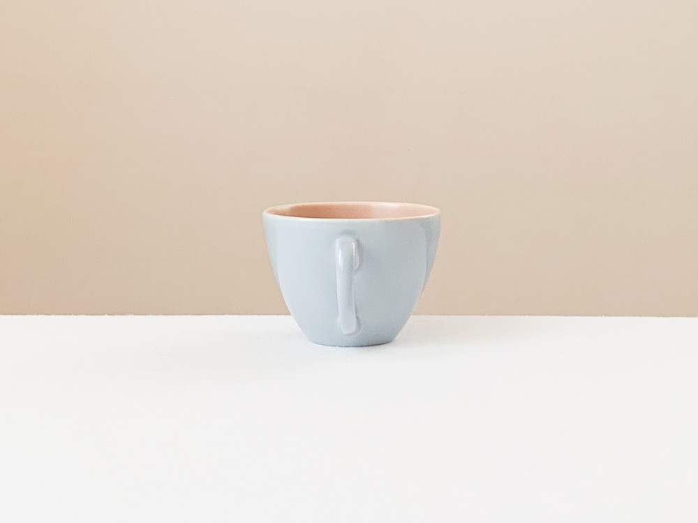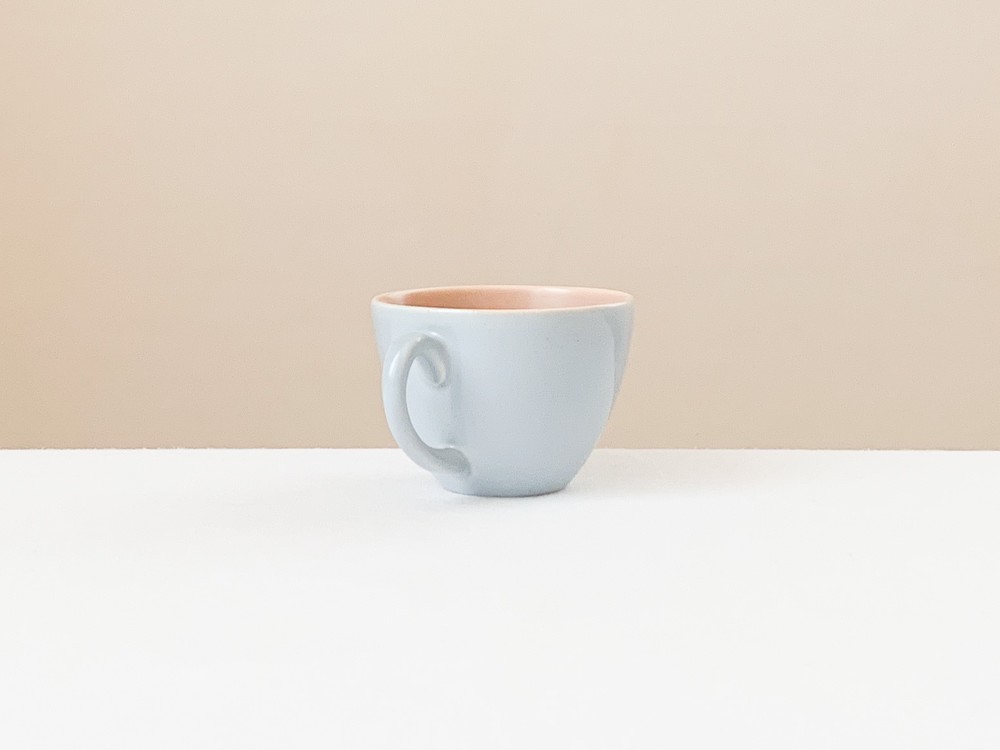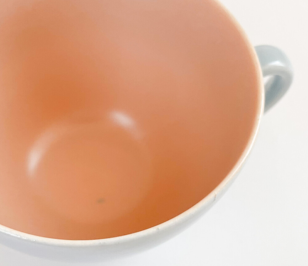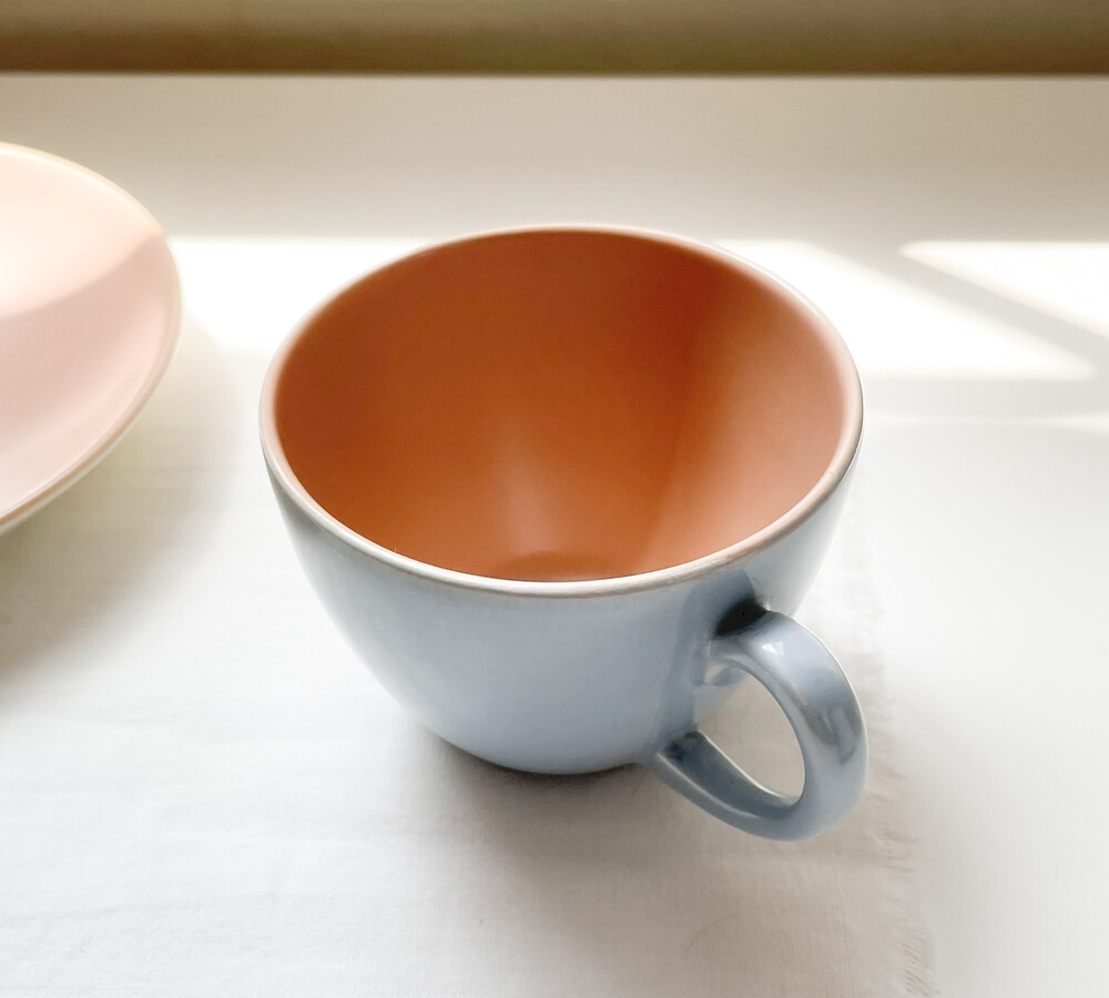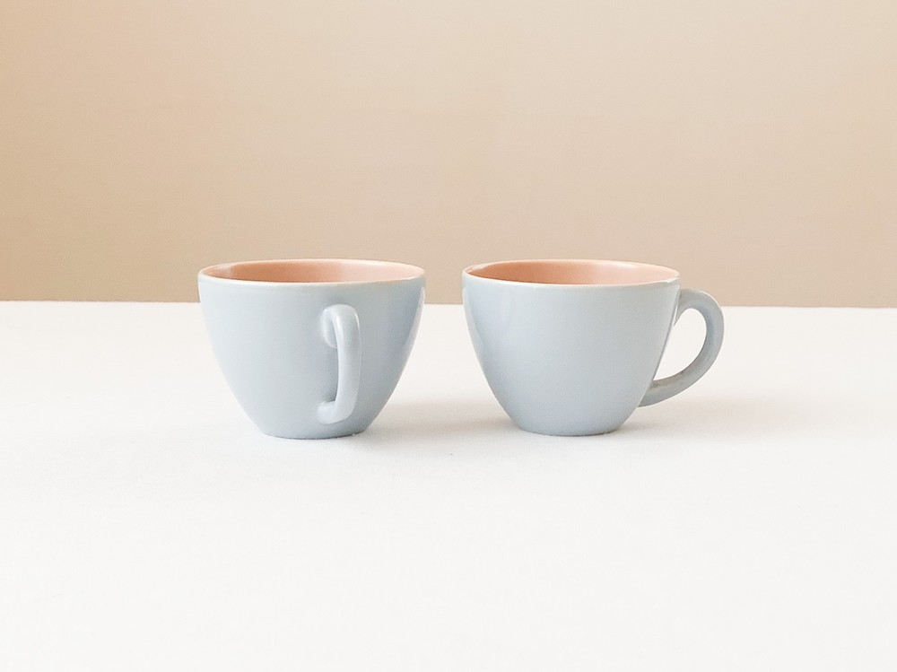풀은 1873년 건축용 도자기장식이나 타일을 만드는 회사로 시작된- 1900년대 초반부터 테이블웨어를 만들었던 영국의 도자기 브랜드로, 깊이있는 색감들과 튼튼한 내구성을 특징으로 하며, 보여지는 모습에서 그리고 그안에 담겨있는 내용들(용도나 제작방식 등 보여지는 모습을 위해 가져야할 과정 등)에서도 보편적인 영국의 정체성을 잘 보여줍니다. 소개해드리는 찻잔세트는 풀이 본격적으로 정체성을 갖추어가기 시작했던 1950년대에 만들어졌습니다. 이시기에 주로 만들었었던 트윈톤시리즈 중 아주 희소성있는 한 가지로, 안개에 덮인듯한 엷은푸른색과 흐린분홍이 함께보여지는 제품입니다. 얇고 단단한 스톤웨어를 소재로하며 군더더기 없이 매끄러운 모습의 둥근 찻잔과 잔을 살며시 감싸는 듯 아래에서 위로 펼쳐진 모양의 잔받침으로 이루어졌습니다. 아름다운 색감이 돋보일 수 있는- 보드라운 광택을 가진 유약으로 마무리가 되어있으며, 바탕이되는 도자기의 크림색이 잔입구의 둘레와 잔받침의 가장자리에 드러나 만들어진 은근한 줄무늬가 보여집니다. 두 가지 색의 어울림에서 전해지는 잔잔한 결, 둥글고 고운 실루엣으로 부터 살펴 볼 수 있는 우아한 정서를 간직하고 있습니다.