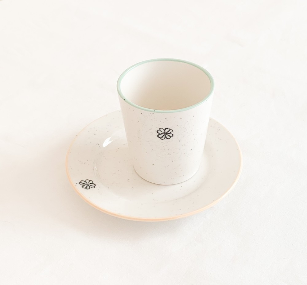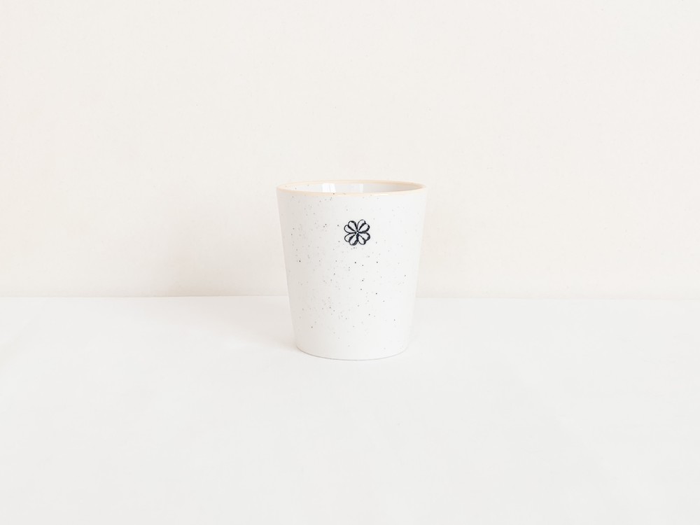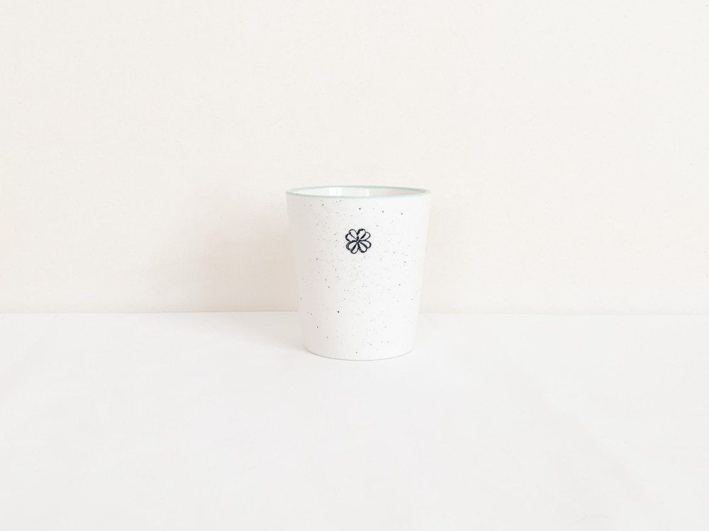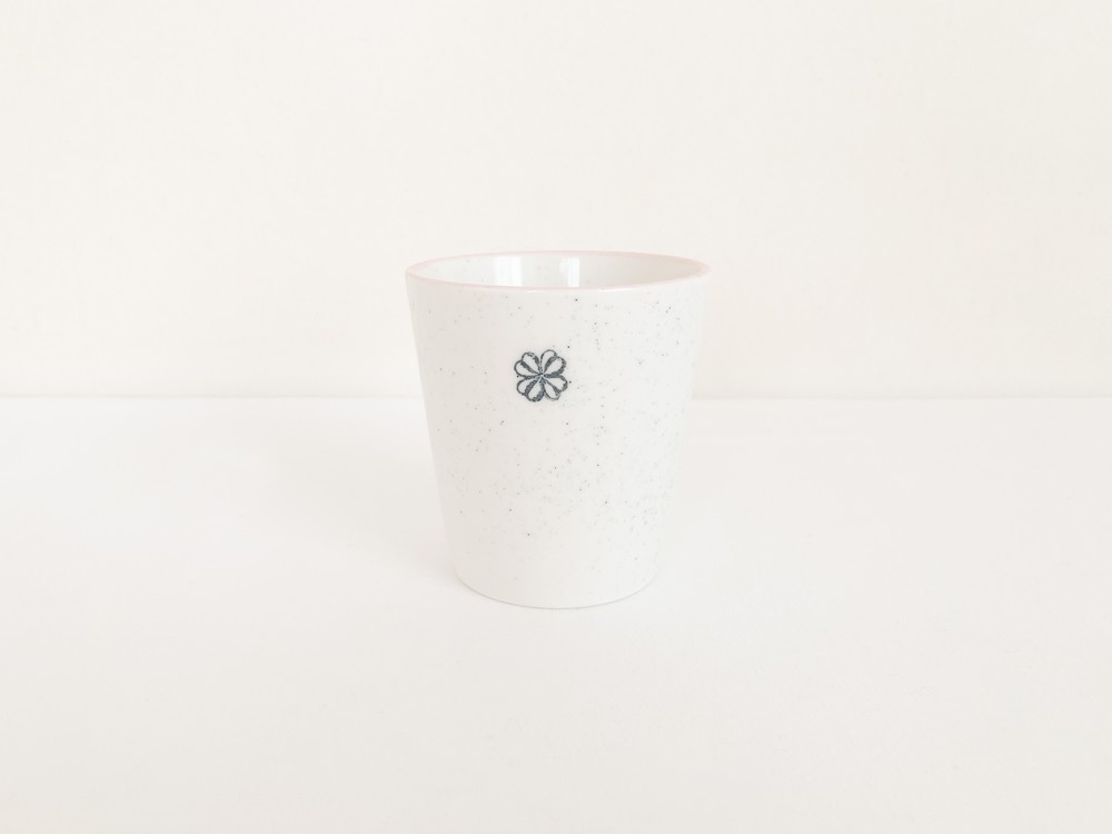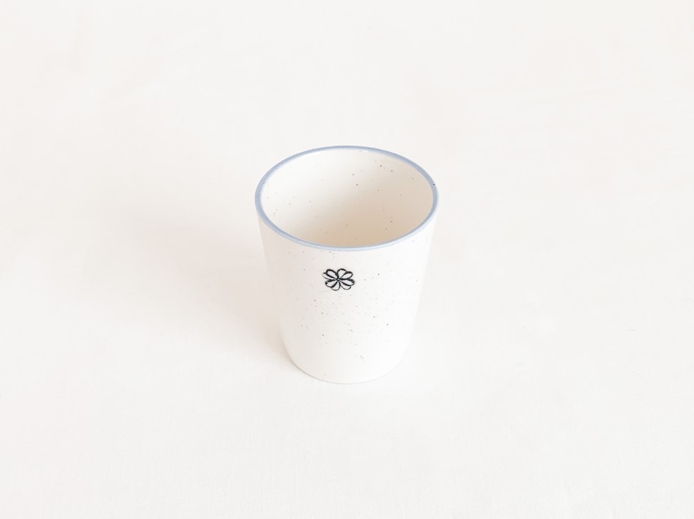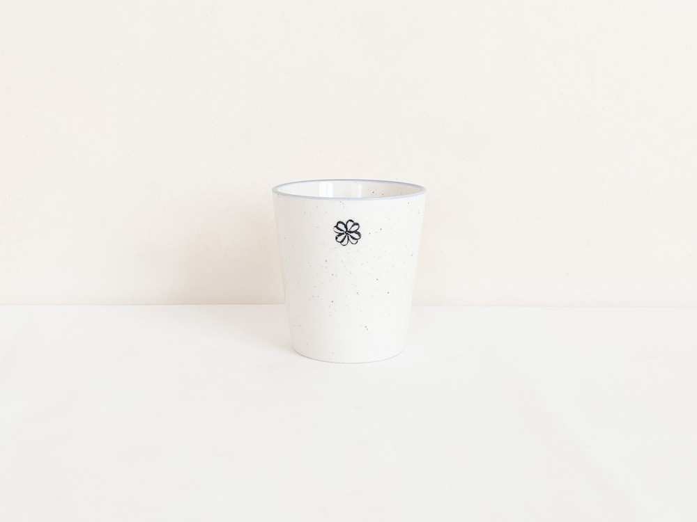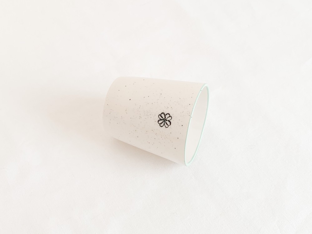 1950년대 영국에서 만들어진 빈티지 스탬프를 모티브로 제작된 컵입니다. 여러용도로 편하게 사용하기에 알맞은 스톤웨어를 소재로 만들어진 제품으로, 몰드를 사용해 모양을 만들어내고, 여러번에 걸쳐 결을 다듬어낸 후 무늬와 유약을 입혀 오랜시간 동안 구워내는 과정을 동해 완성이 됩니다. 제품이 만들어지는데에는, 프랑스 Anneyron지역의 순도높은(제작의 편리성을 위해 섞이게 되는 흙과 물이외의 물질이 섞이지 않음을 뜻합니다) 흙과 유약 그리고 화학제품이 첨가되지 않은 안료가 사용됩니다. 둥글고 단정한 선으로 다듬어진 컵은 위를 향에 살짝 넓어지는 실루엣의- 손에 가볍에 들리는 편안한 모양을 가지고 있습니다. 컵의 한켠에는 바살트를 재료로한 따스한 검정의 클로버 무늬가 새겨졌으며, 가장자리에는 가느다란 줄무늬가 고운흐름로 그려져 있습니다. 오랜시간이 담긴 스탬프 특유의 자연스런 결, 담담한 실루엣과 색들로부터 여운이 전해집니다. 매일의 식사시간, 그리고 정성을 담아 준비한 특별한 테이블을 위한 다정한 그릇으로 사용하기에 잘 어울립니다.