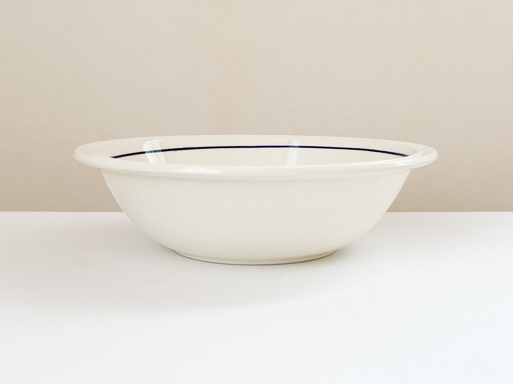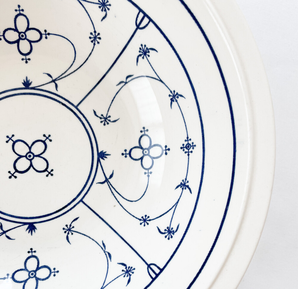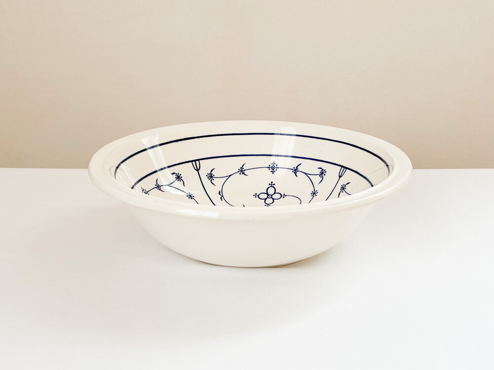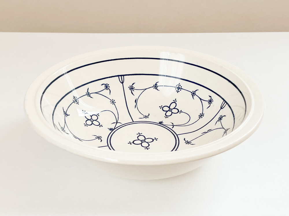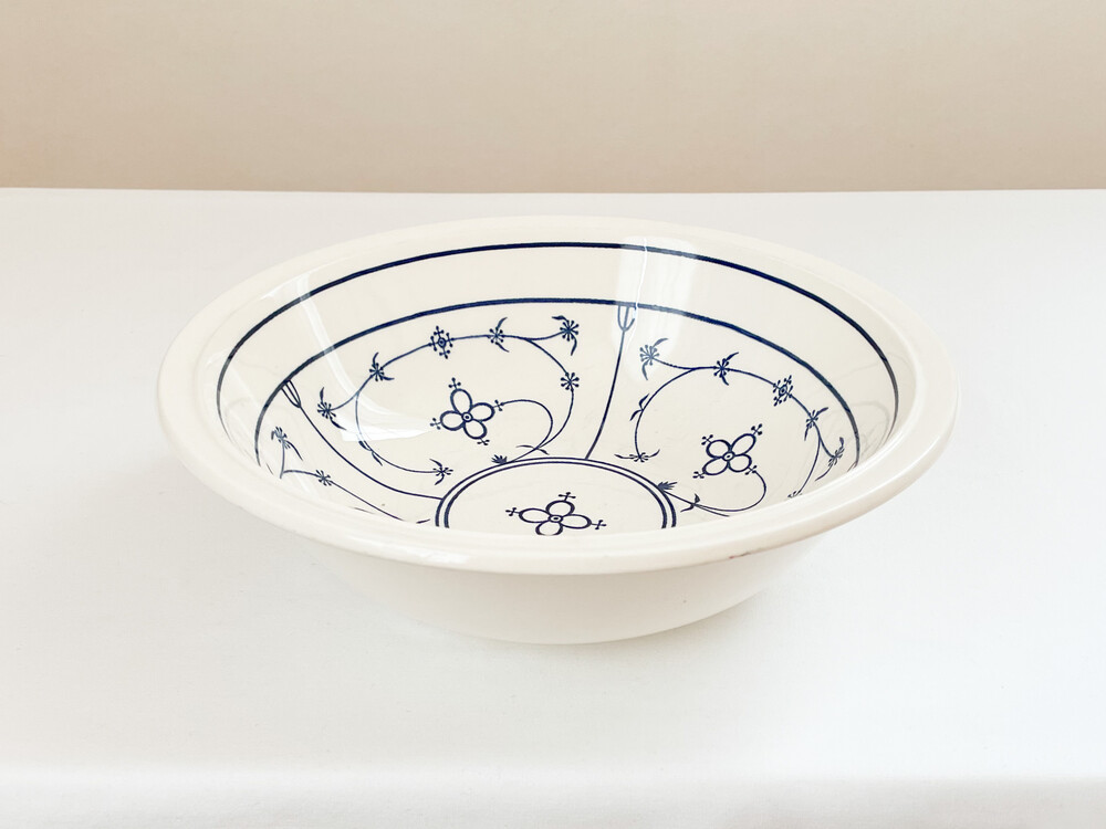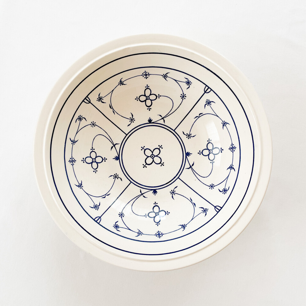 로얄튜더는 1876년 영국도자기의 주요 산지인 스토크온트렌드 롱톤지역에서 윌리엄과 조셉 형제에 의해 시작된 테이블웨어 브랜드입니다. 예술에 대한 큰 애정을 가지고 있었던 윌리엄과 조셉은 뚜렷한 정체성을 가진- 로얄튜더만의 아름다움이 담긴 테이블웨어를 만들어내고자하는 마음으로 로얄튜더를 운영했습니다. 이러한 로얄튜더는 그린들리와 콜클로우 등 아트피스와 매뉴팩트의 성격을 동시에 가지고 있는 다수의 브랜드에게도 큰 영향을 주었고, 선명한색감과 패턴들이 어우러진 세련된 화려함의 도자기들은 당시부터 지금까지도 수집품으로서의 높은 가치도 인정받고 있습니다. 소개해드리는 제품은 1950년대 후반에 만들어진 것으로, 크림색의 아이언웨어를 소재로 합니다. 넓고 깊은, 둥근 보울의 안쪽에는 전통적인 덴마크패턴을 오마주한 풀꽃의 무늬가 입혀져 있습니다. 바탕이 되는 온화한 크림색과 선명하고 차분한 푸른빛 무늬가 우아합니다. 과일이나 달걀을 담아두는 바스켓으로, 샐러드나 파스타를 담아내는 식탁 가운데의 그릇으로 사용하기에 잘 어울립니다.
